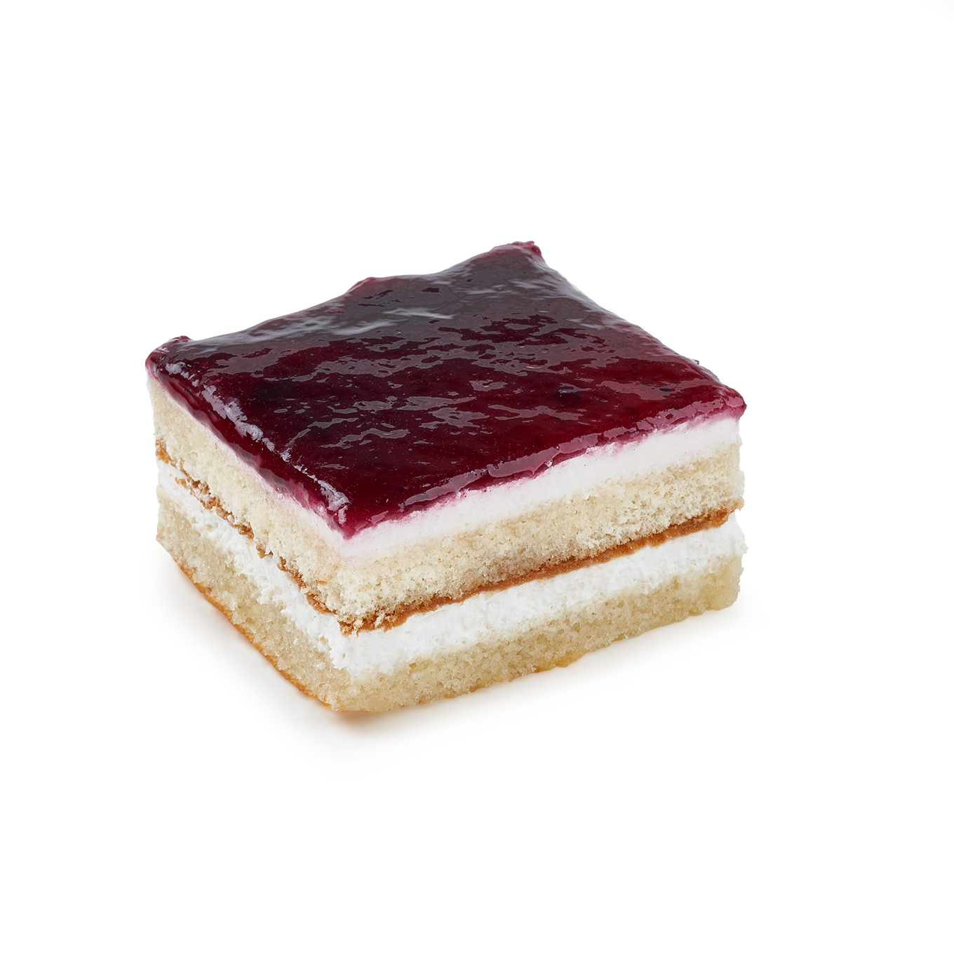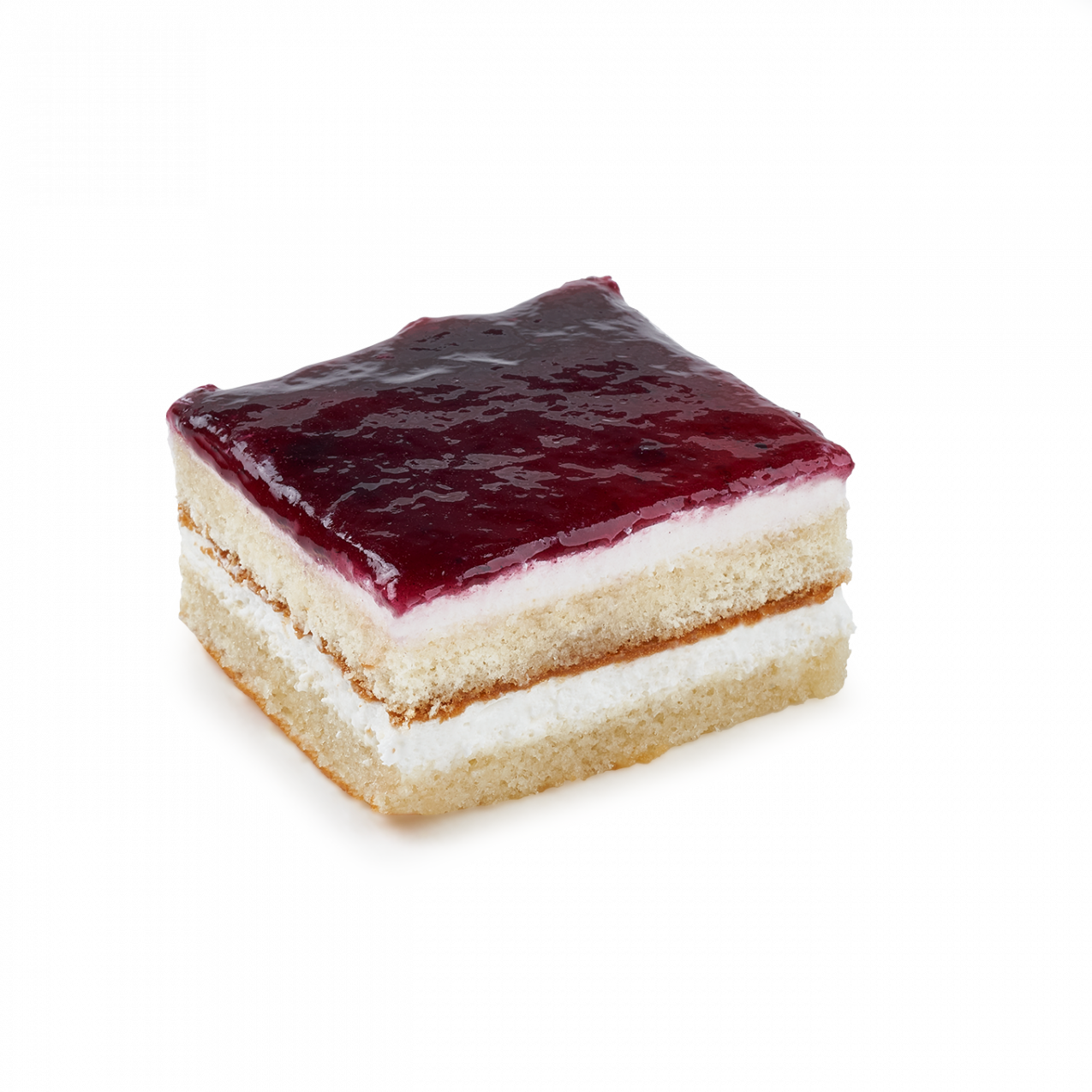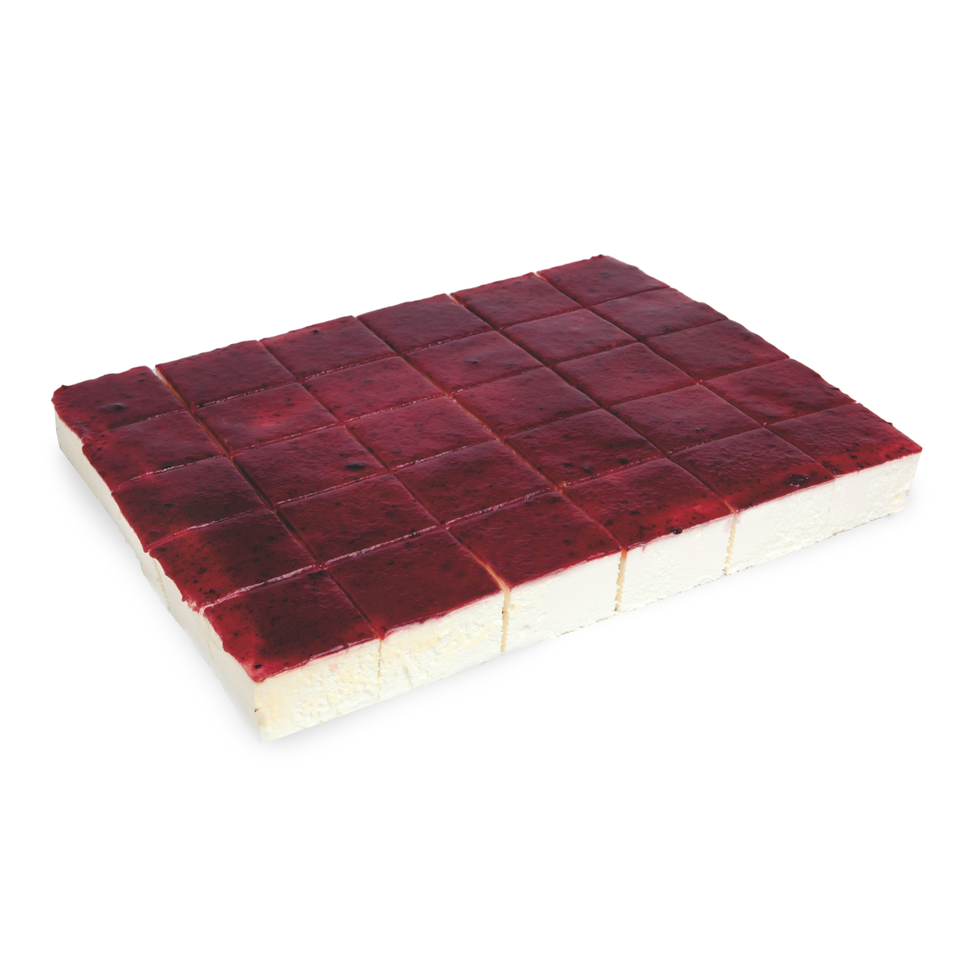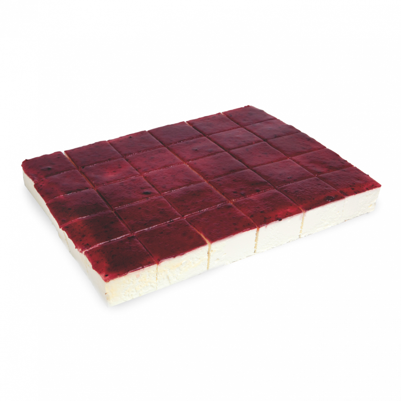 Plancha de pastelería con capas de bizcocho (24%), con capas de mousse (36%) con queso fresco (4%) y decorado con crema de arándanos (10%). Viene ya precortada en 30 porciones para facilitar su manipulación.