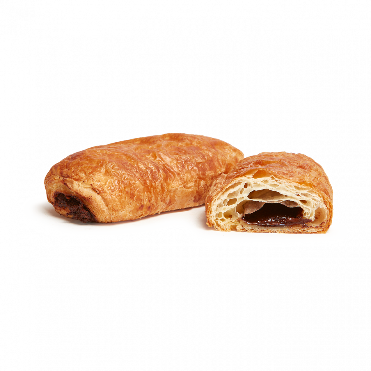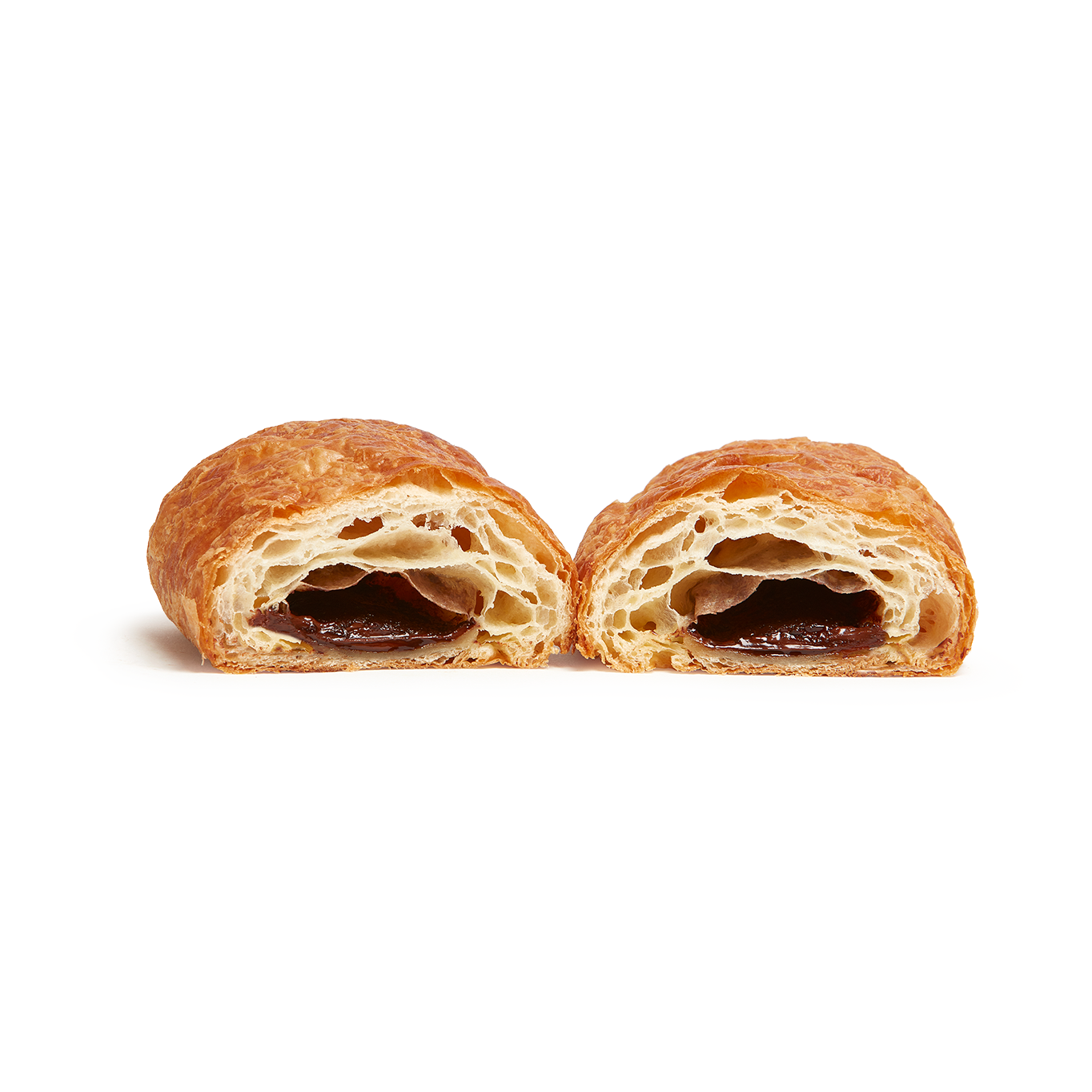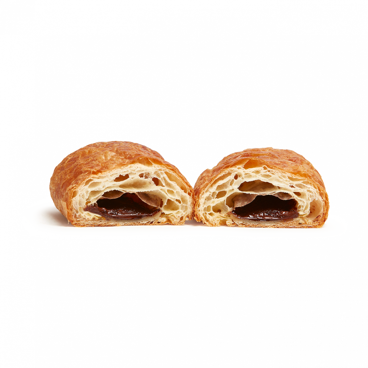 Deliciosa napolitana de masa hojaldrada, rellena de crema de chocolate (23%) con avellanas. Muy fácil y rápida de preparar, ya fermentada.