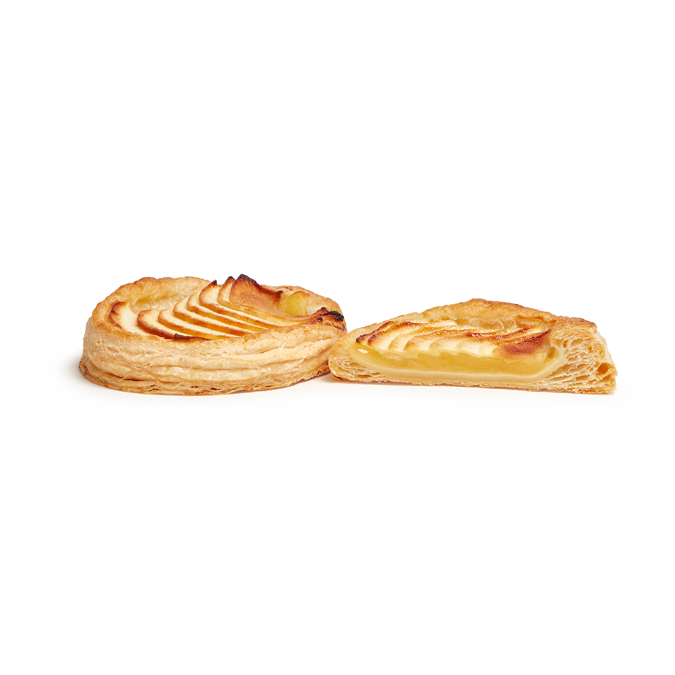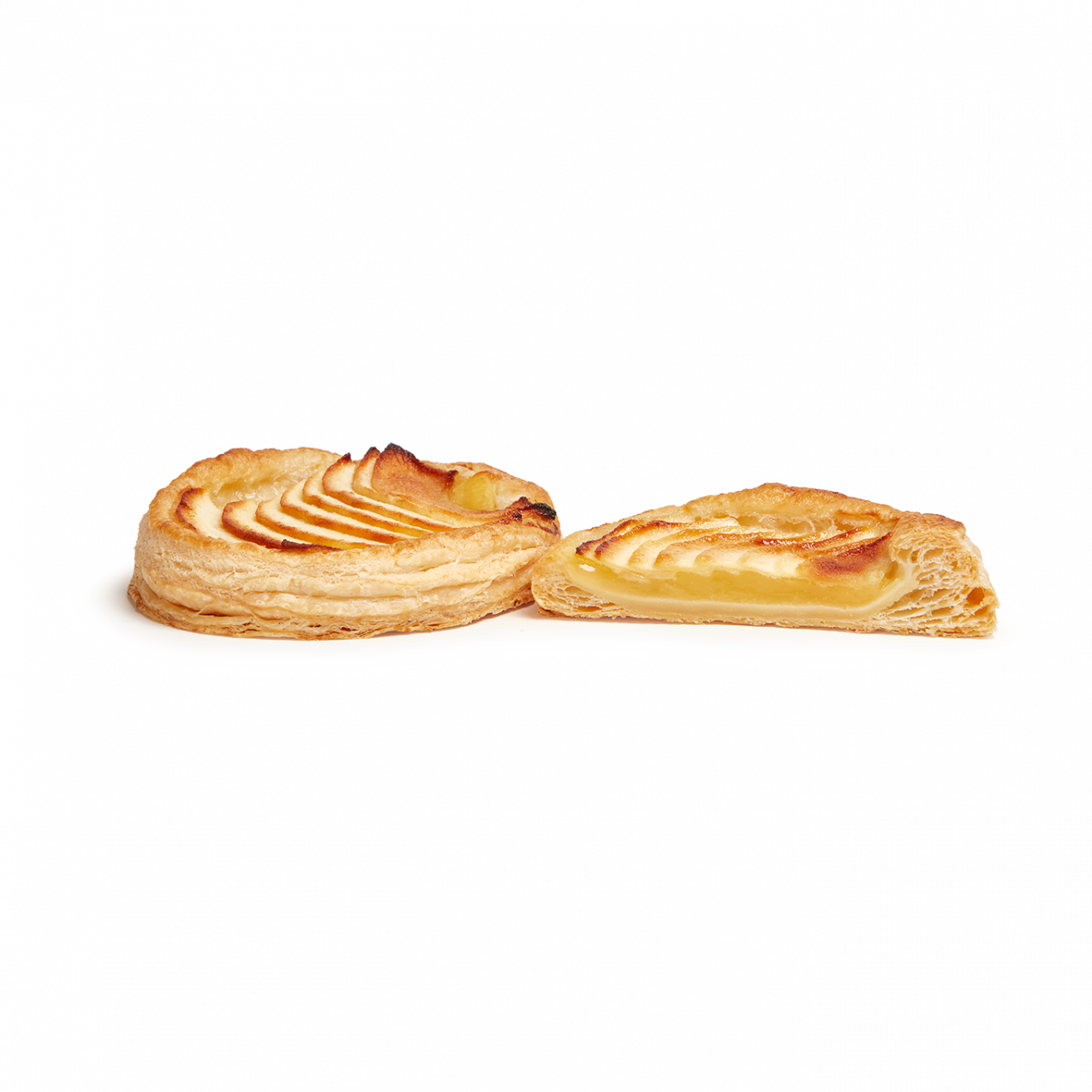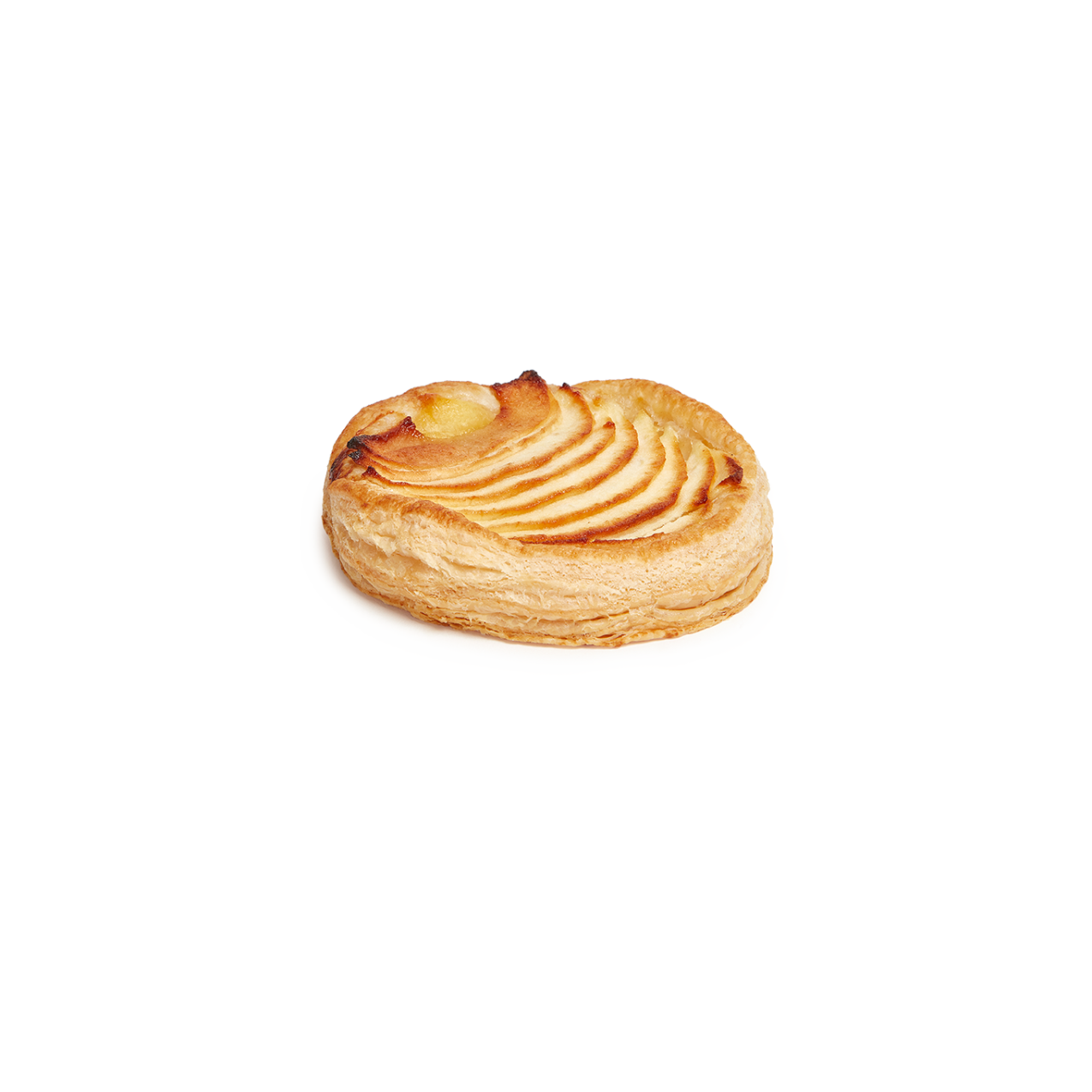 Auténtica delicia de fino y crujiente hojaldre  relleno (50%) de crema pastelera y láminas de manzana. Viene pintado con brillo. Con un formato ovalado hace de este pastel una opción atractiva y vistosa en el punto de venta.