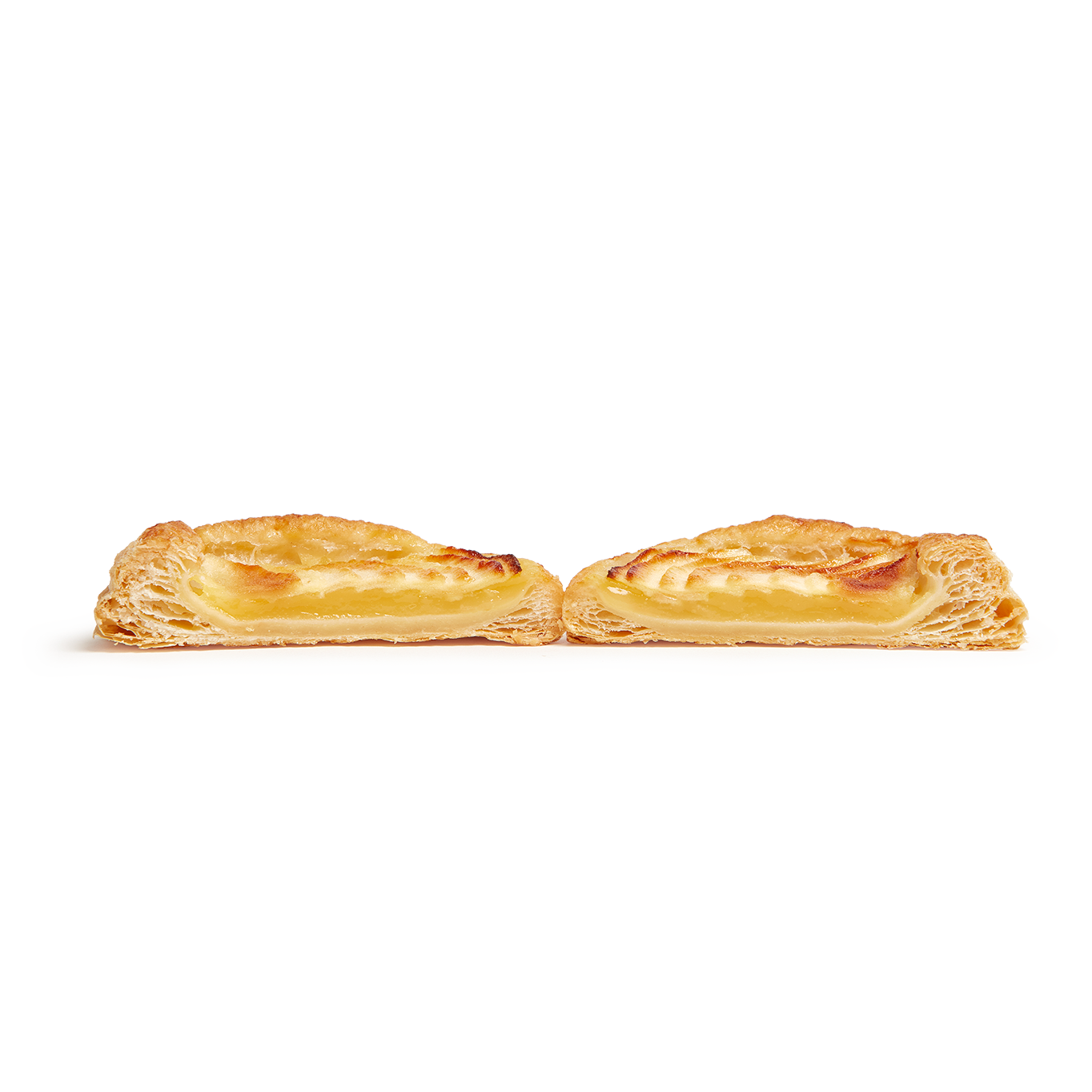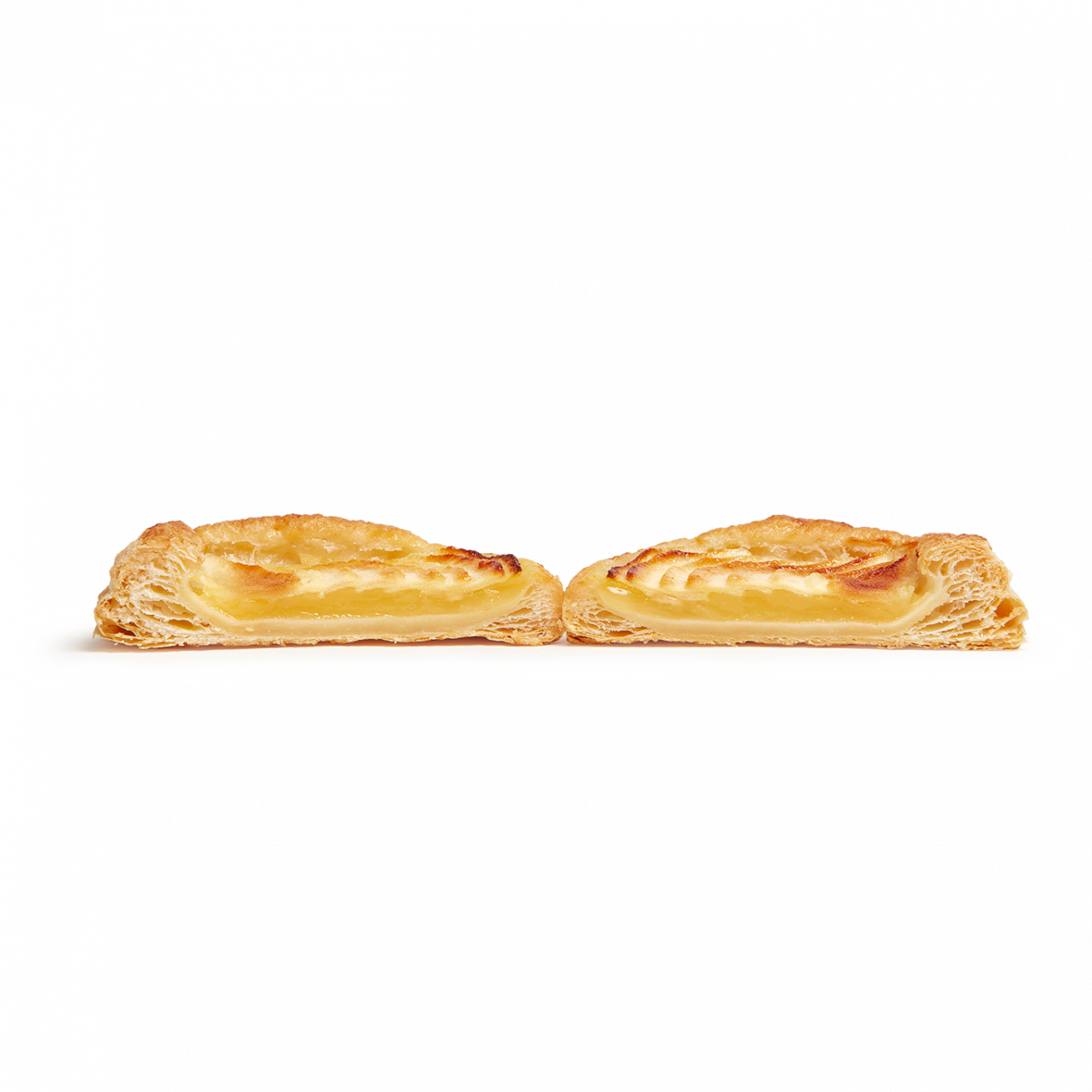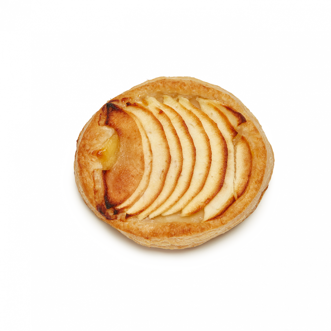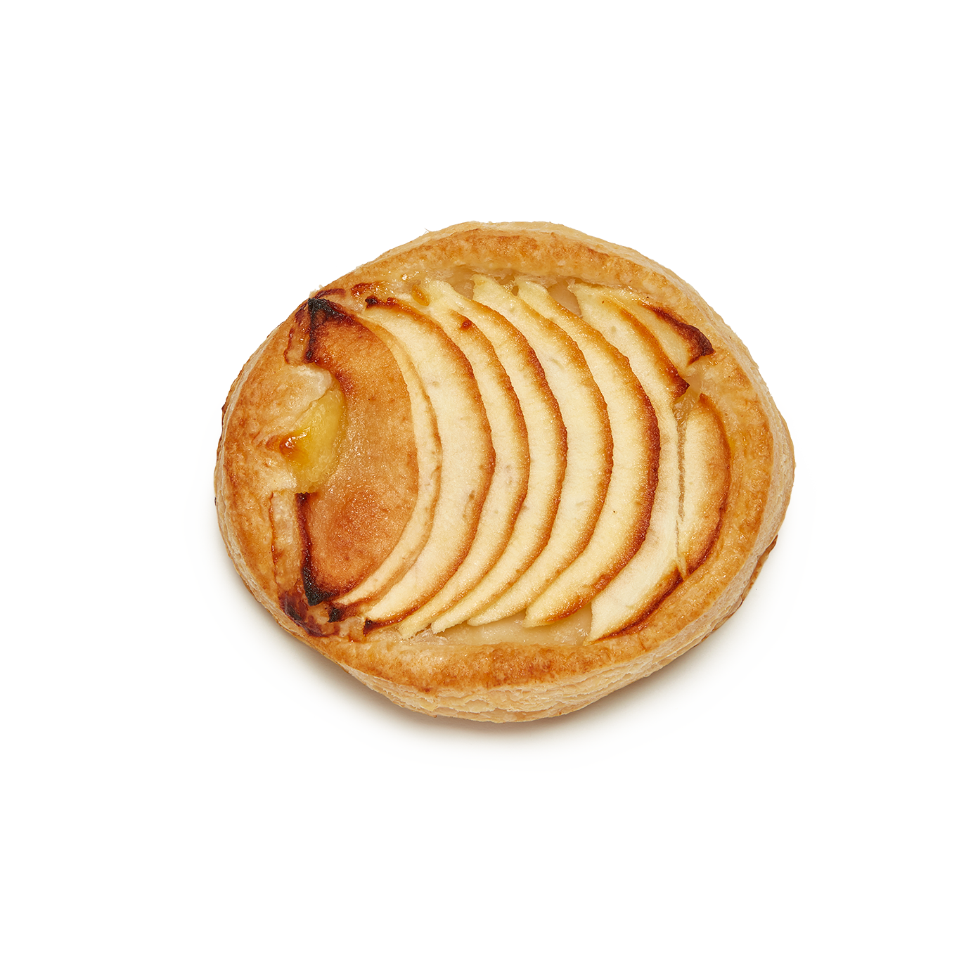 Auténtica delicia de fino y crujiente hojaldre  relleno (50%) de crema pastelera y láminas de manzana. Viene pintado con brillo. Con un formato ovalado hace de este pastel una opción atractiva y vistosa en el punto de venta.