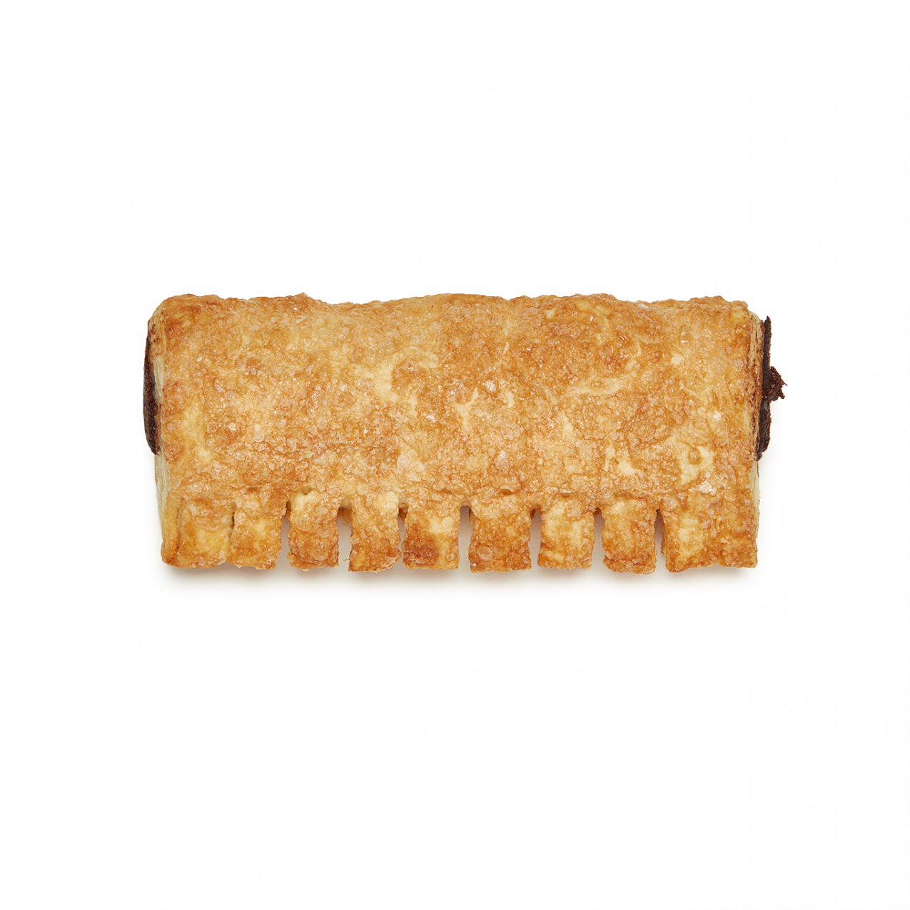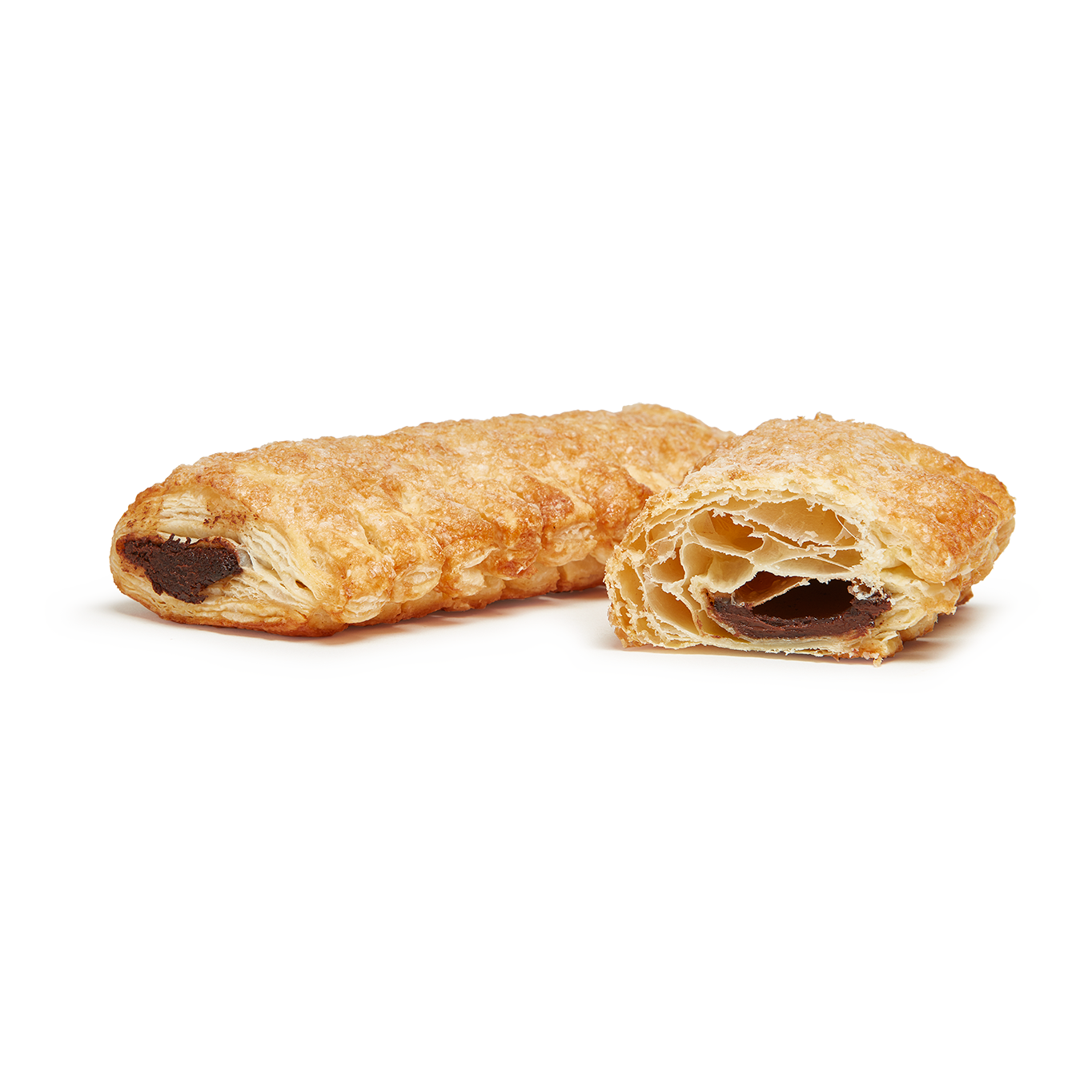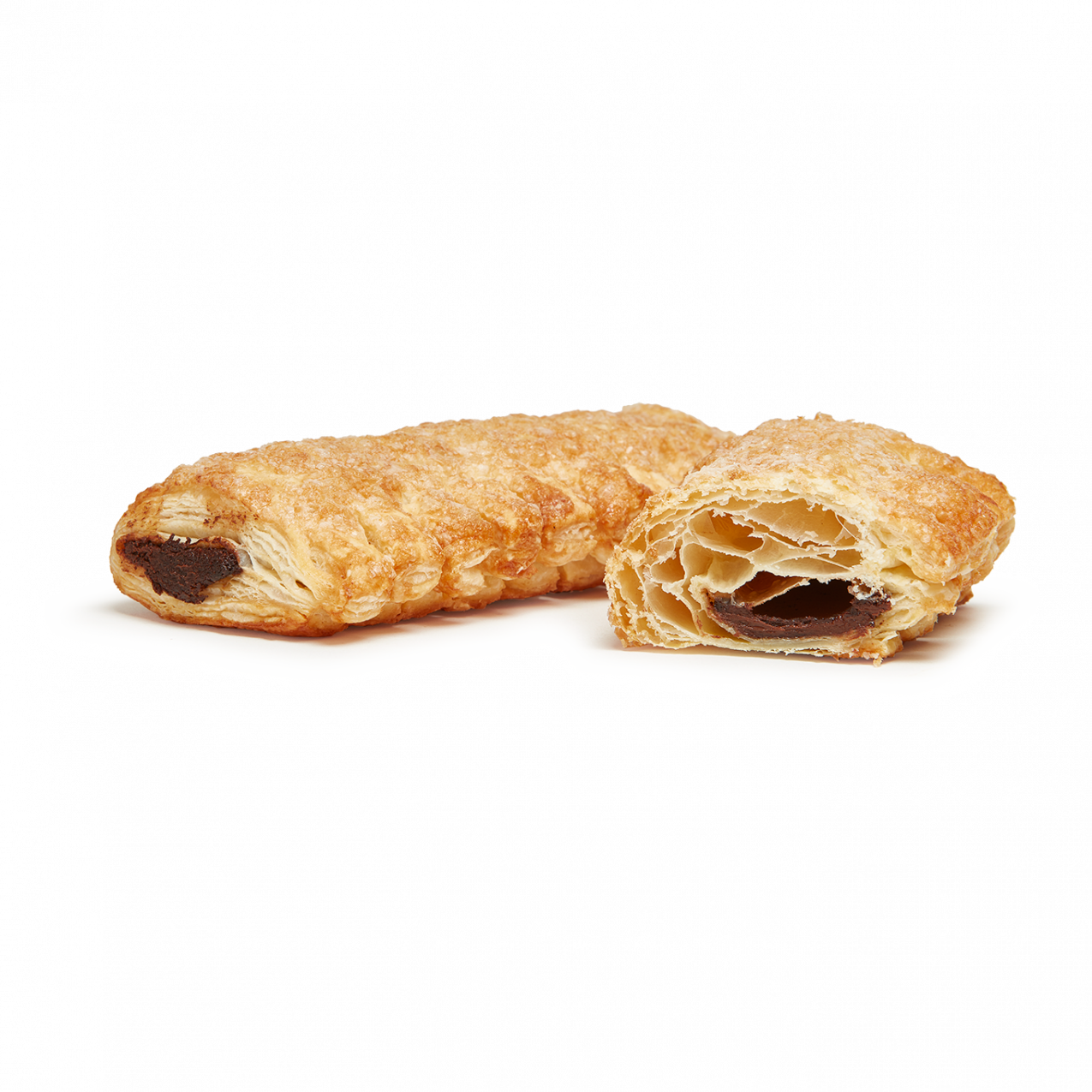 Deliciosa pieza de bollería hojaldrada que sorprende por su textura crujiente y su cuidado y atractivo aspecto artesanal, con cortes en su superficie. Con un sabroso relleno de crema de chocolate con avellanas (25%). Elaborada con margarina. Decorada con azúcar en grano.