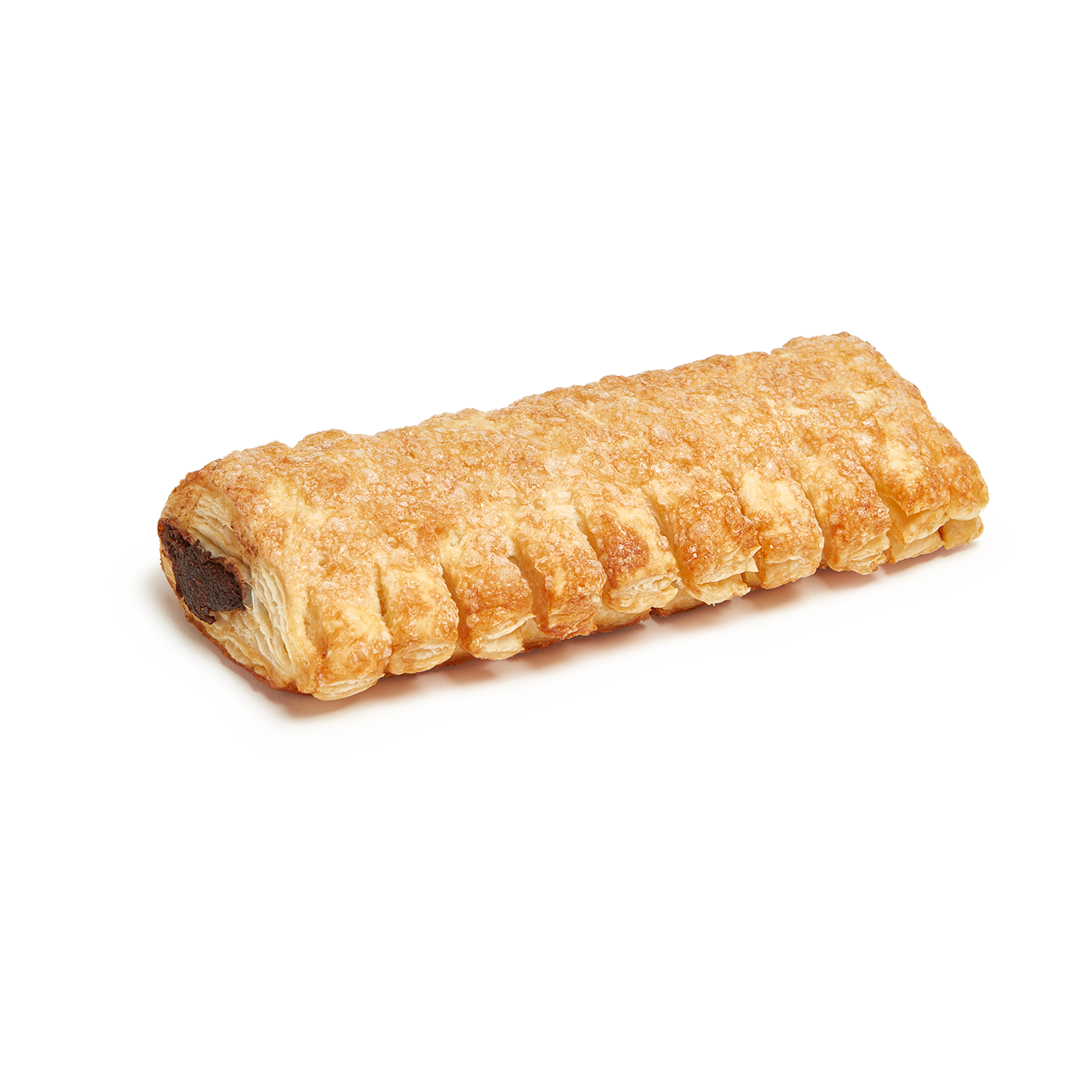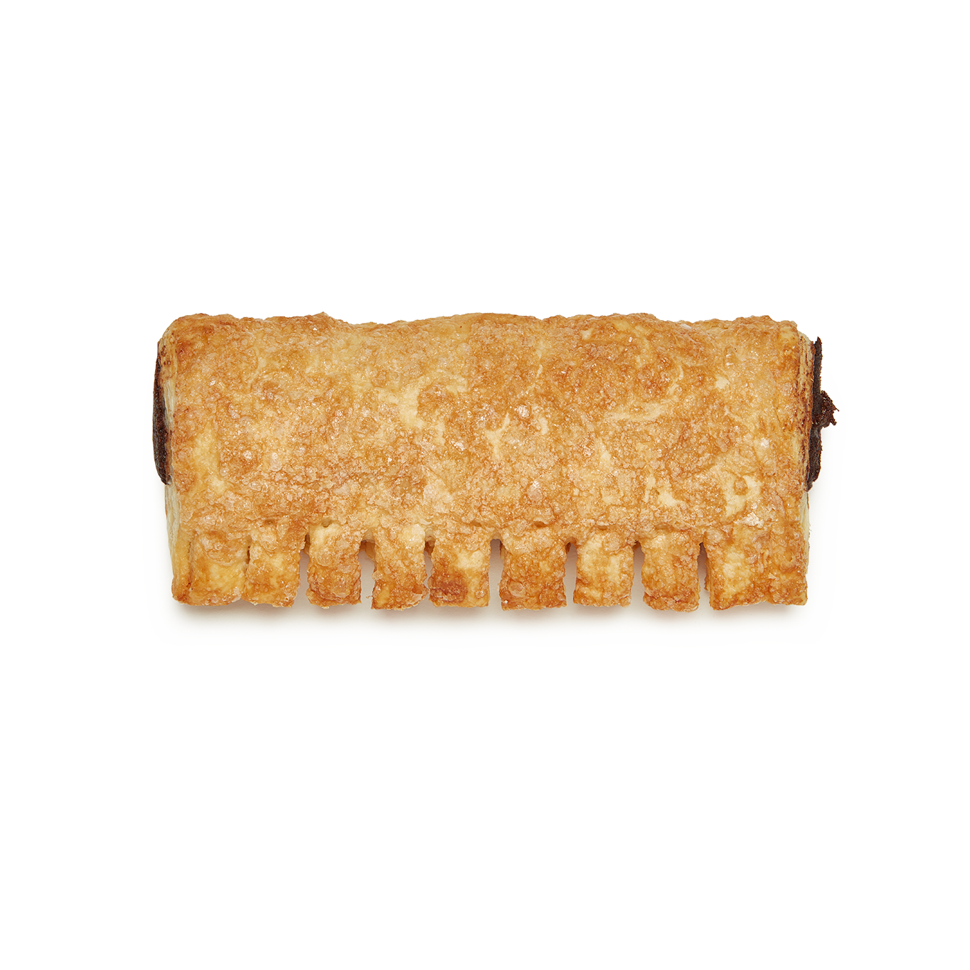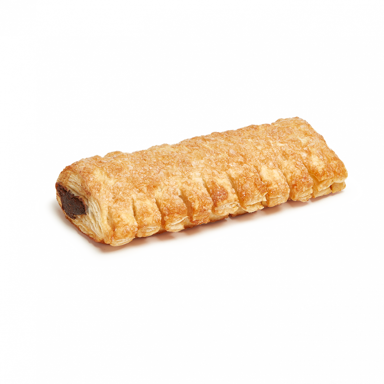 Deliciosa pieza de bollería hojaldrada que sorprende por su textura crujiente y su cuidado y atractivo aspecto artesanal, con cortes en su superficie. Con un sabroso relleno de crema de chocolate con avellanas (25%). Elaborada con margarina. Decorada con azúcar en grano.