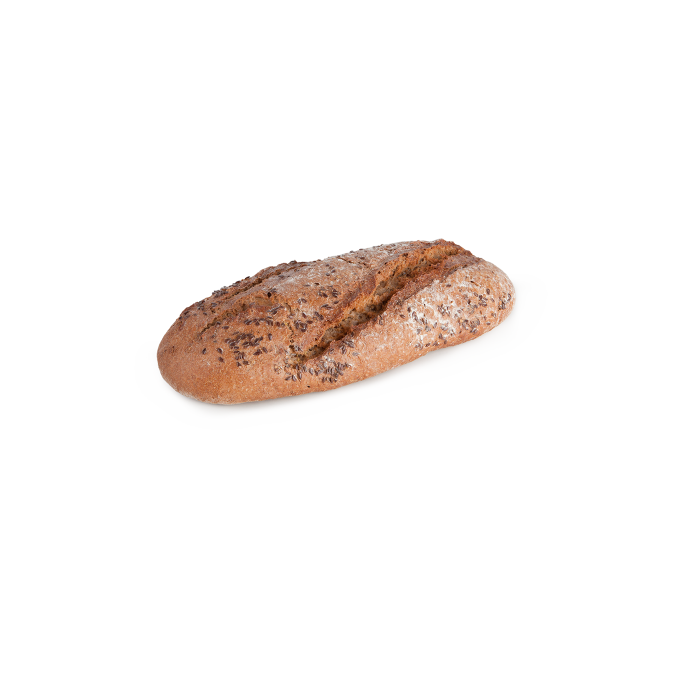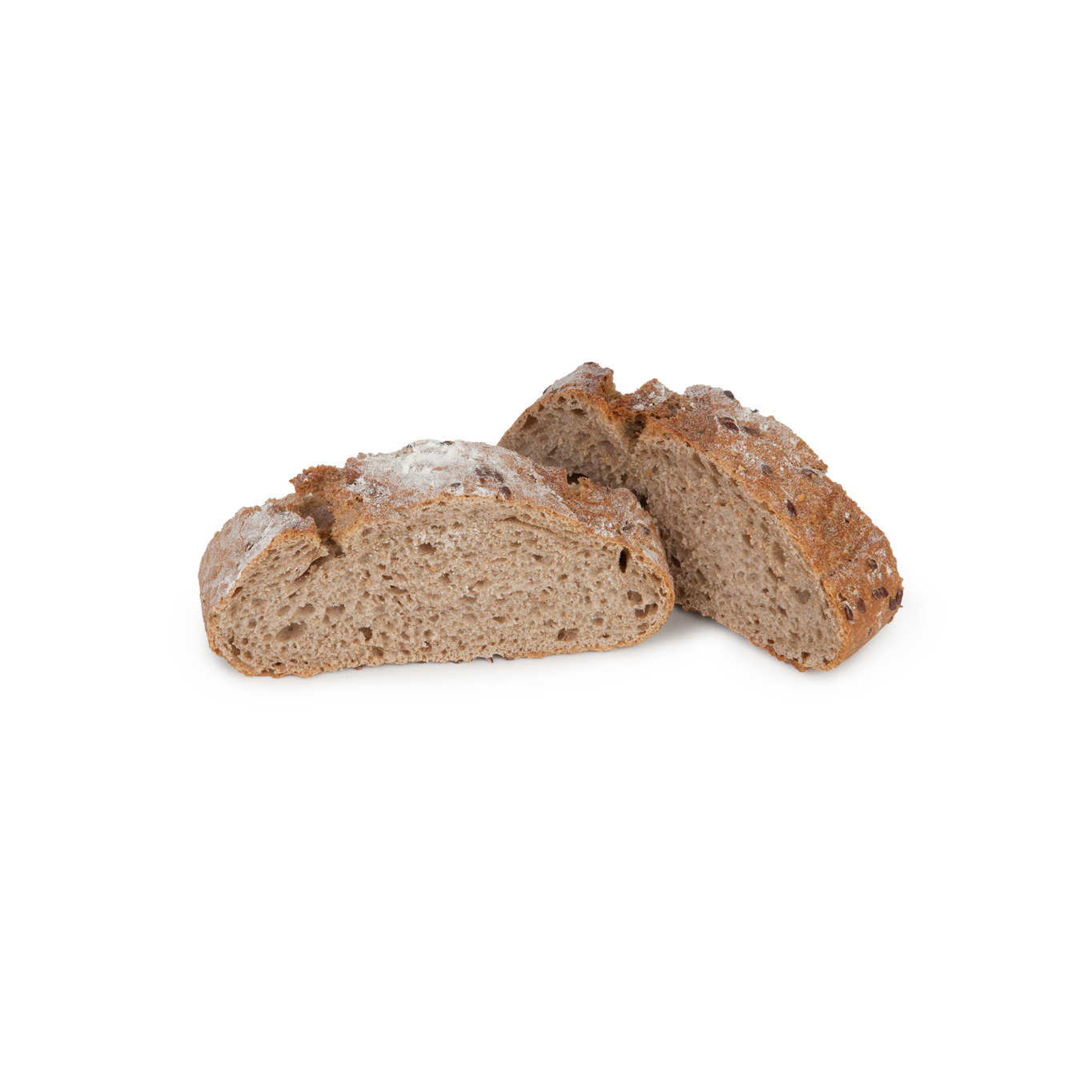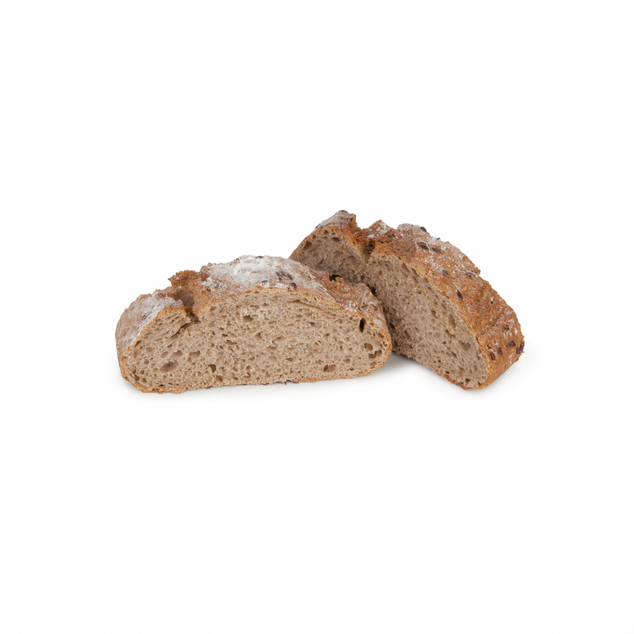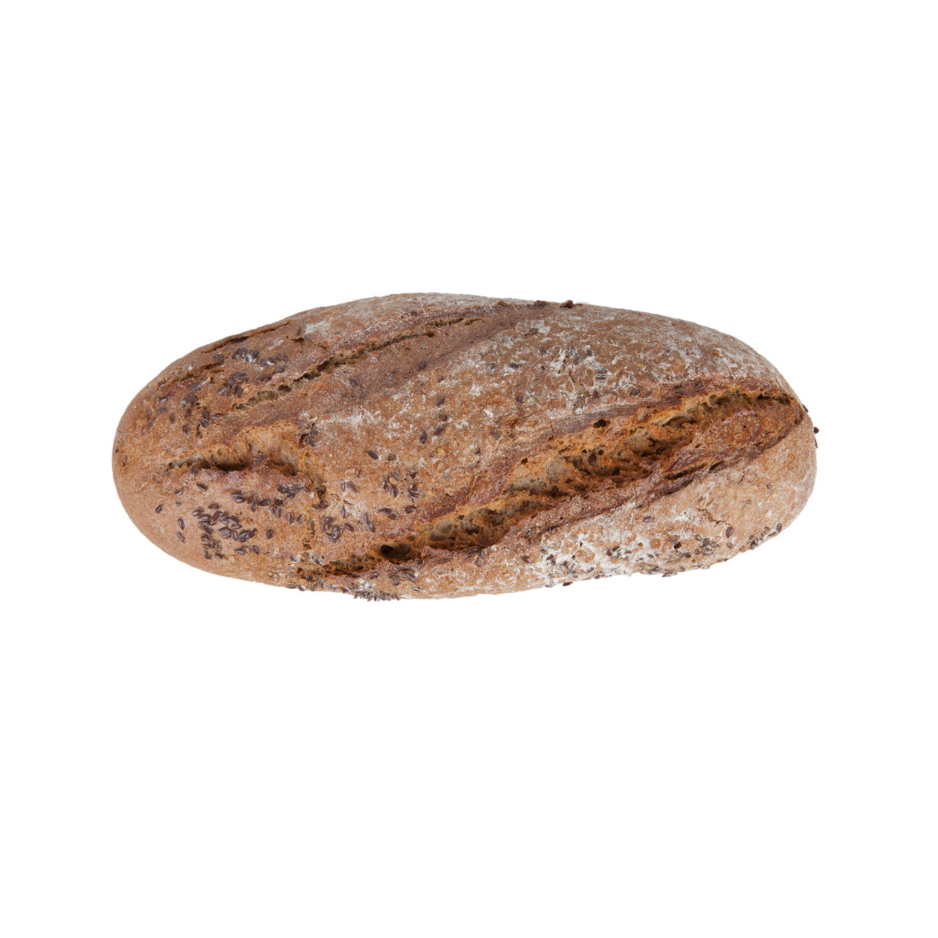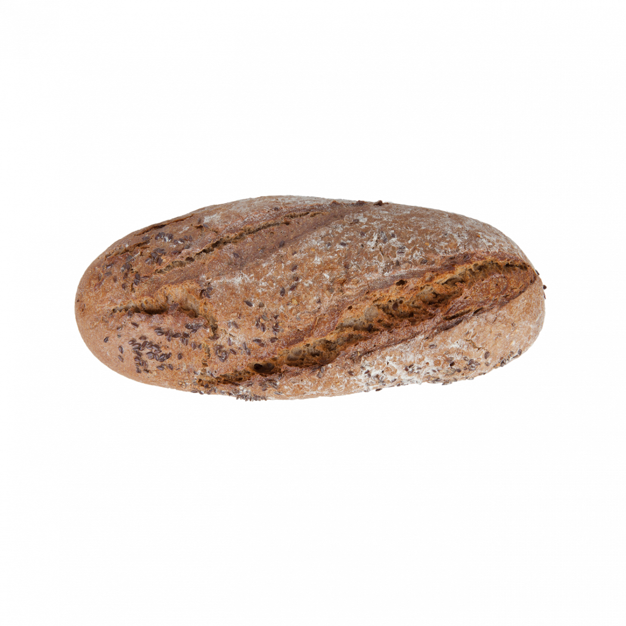 Elaborado con 51% harina de centeno, harina de trigo, masa madre y semillas de lino marrón que le otorgan un atractivo aspecto. Como resultado obtenemos un pan ligeramente oscurecido y con un sabor de acidez moderada resultado del perfecto equilibrio en la proporción de harinas.