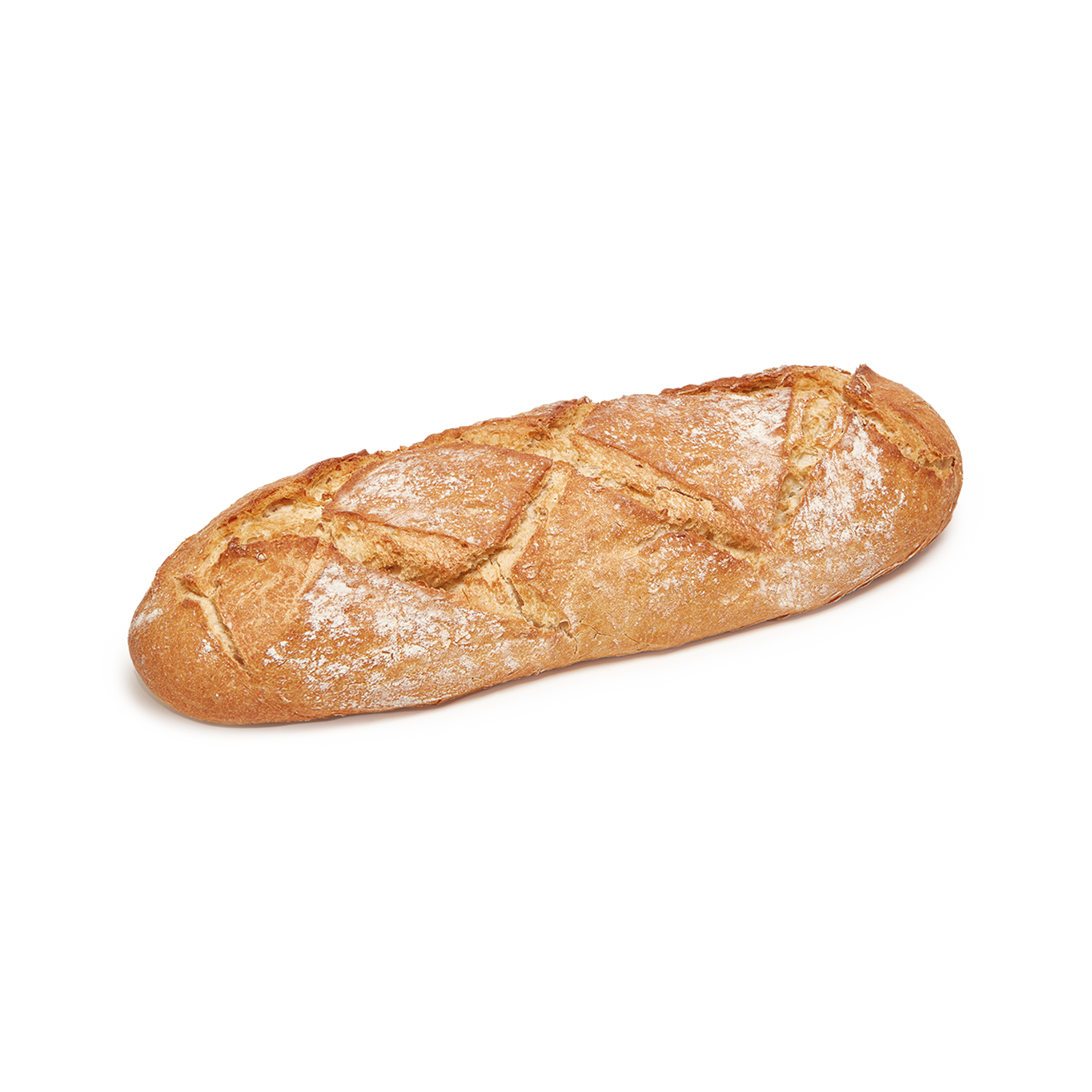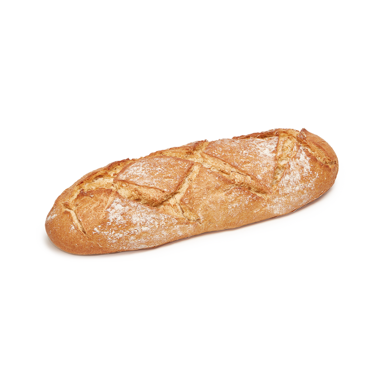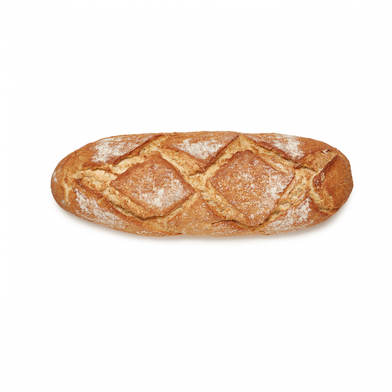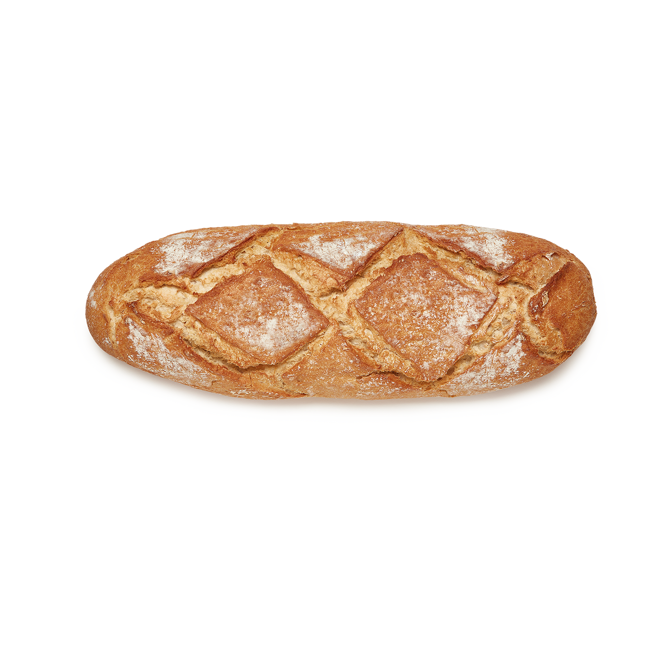 Esta hogaza destaca por su atractivo aspecto con greñas en forma de rombo y superficie enharinada. Está elaborado con harina de trigo y contiene harina de trigo sarraceno que aporta mayor textura, sabor y un color dorado oscuro a la miga. Su formato "maxi" es ideal para familias.