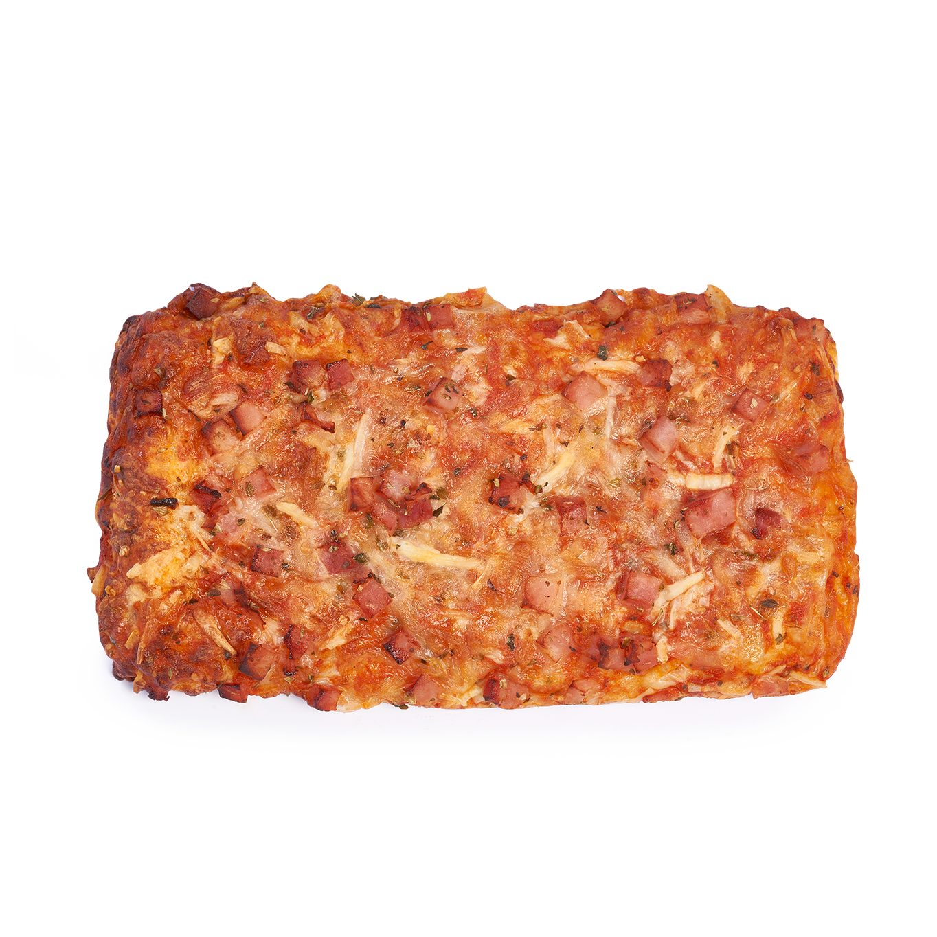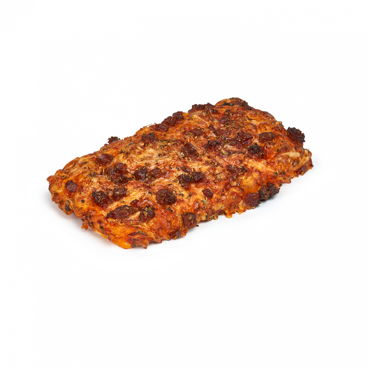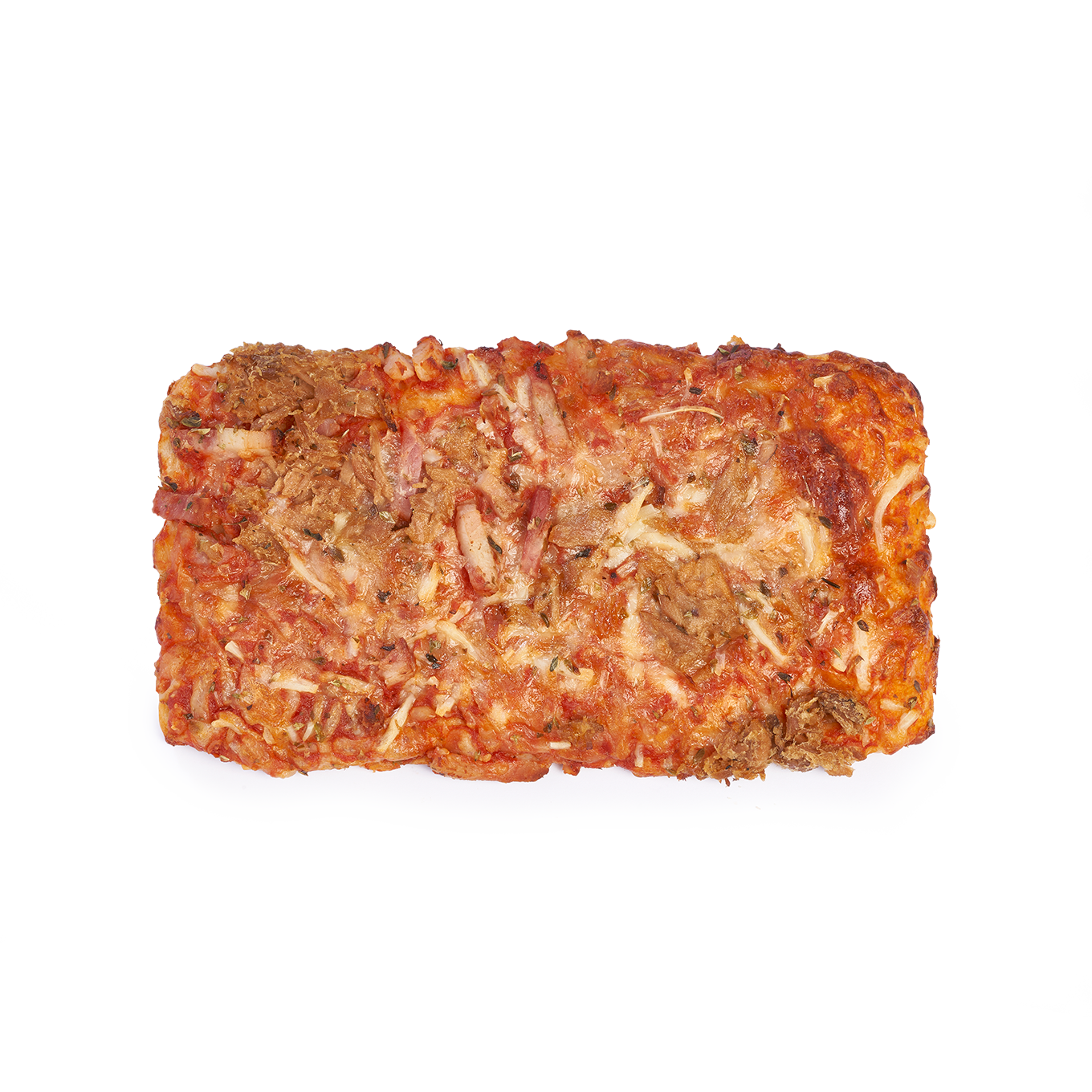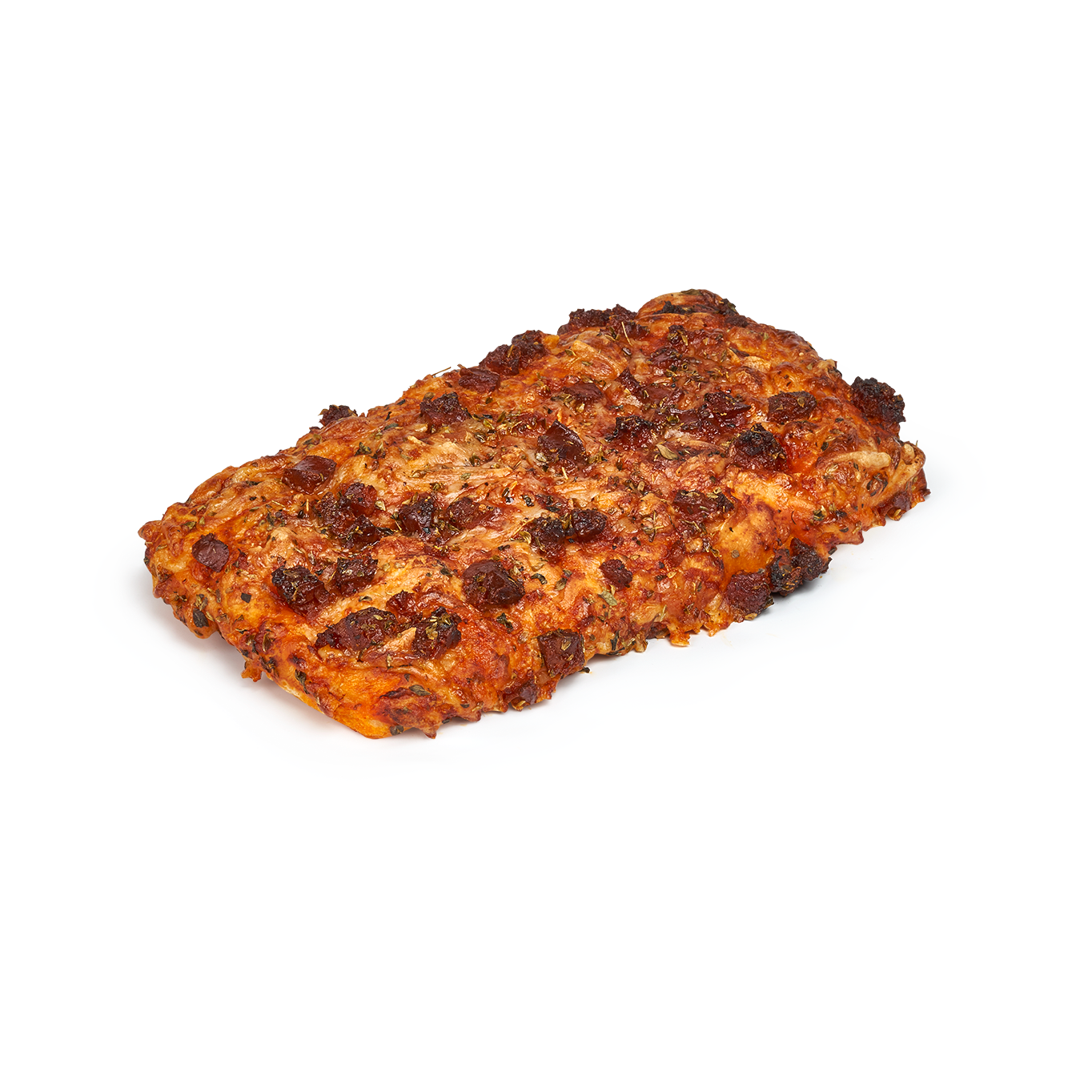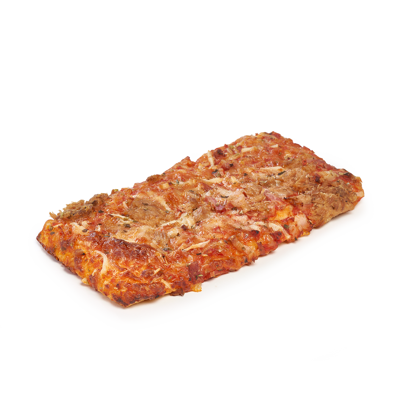 Pizzas elaboradas con un toque de aceite de oliva e ingredientes visibles en toda la superficie, sin bordes. Su formato es perfecto para ocupar toda la bandeja del horno; ahorrando espacio y tiempo de horneado.