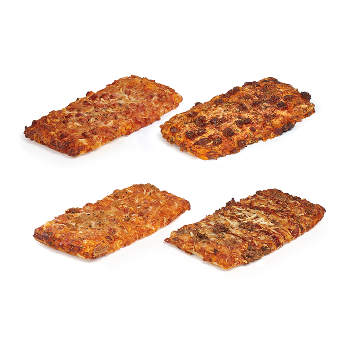 Surtido de 4 pizzas de alta rotación en formato rectangular.