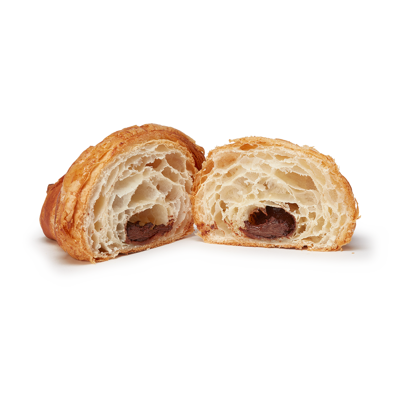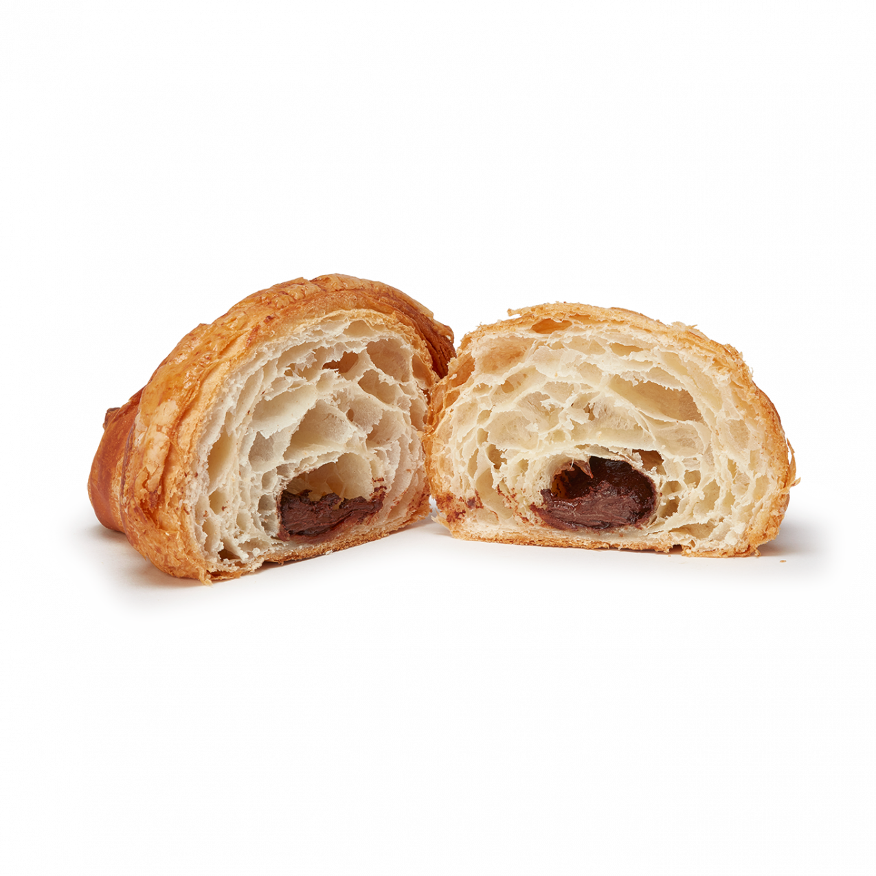 Delicioso croissant elaborado con Manteca (23%) y con dos barritas de chocolate (17%) en su interior para que se fundan durante el horneado y aporten un extra de sabor.