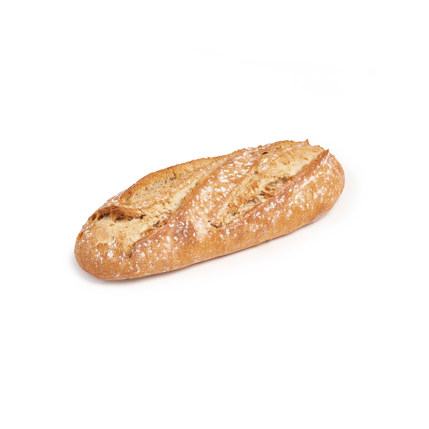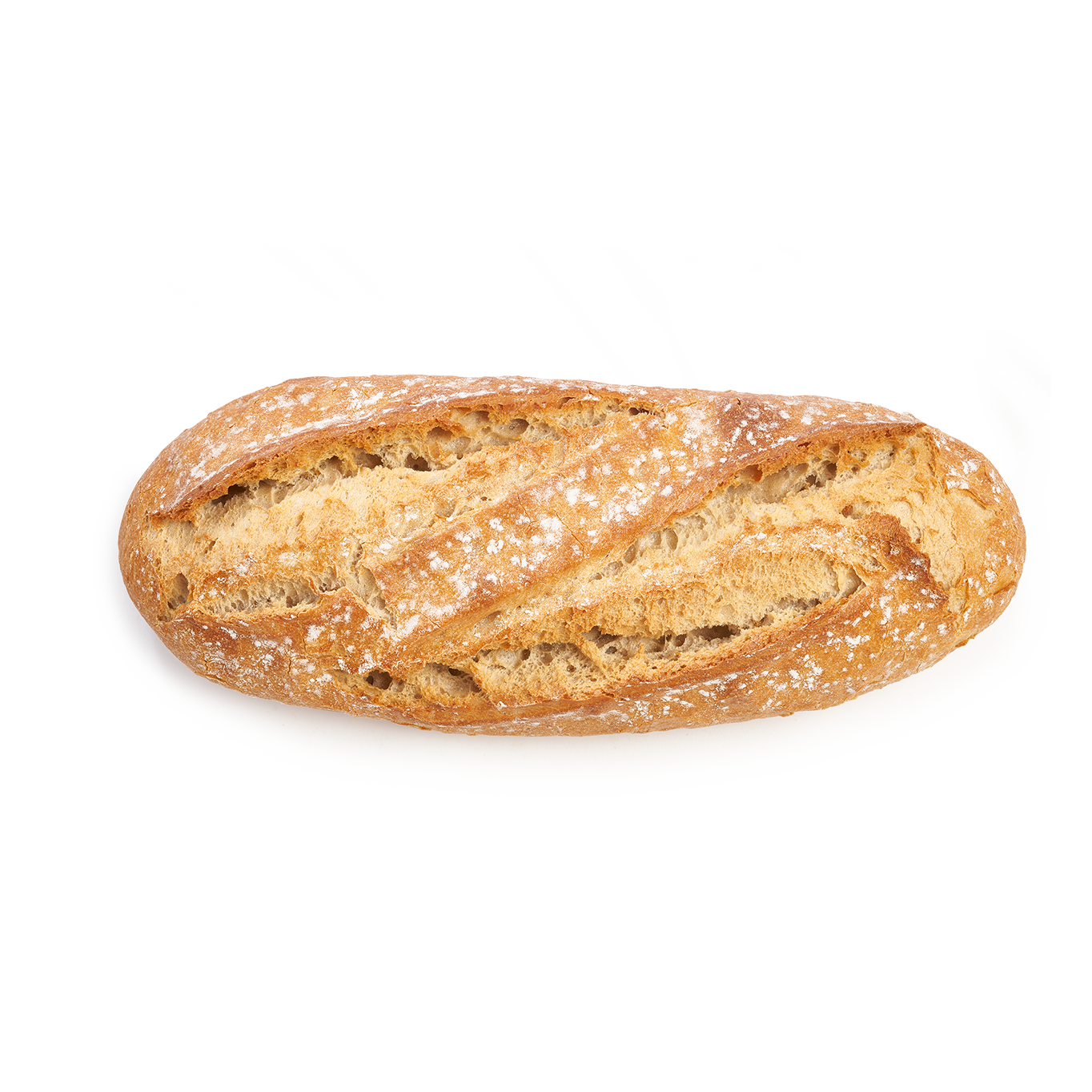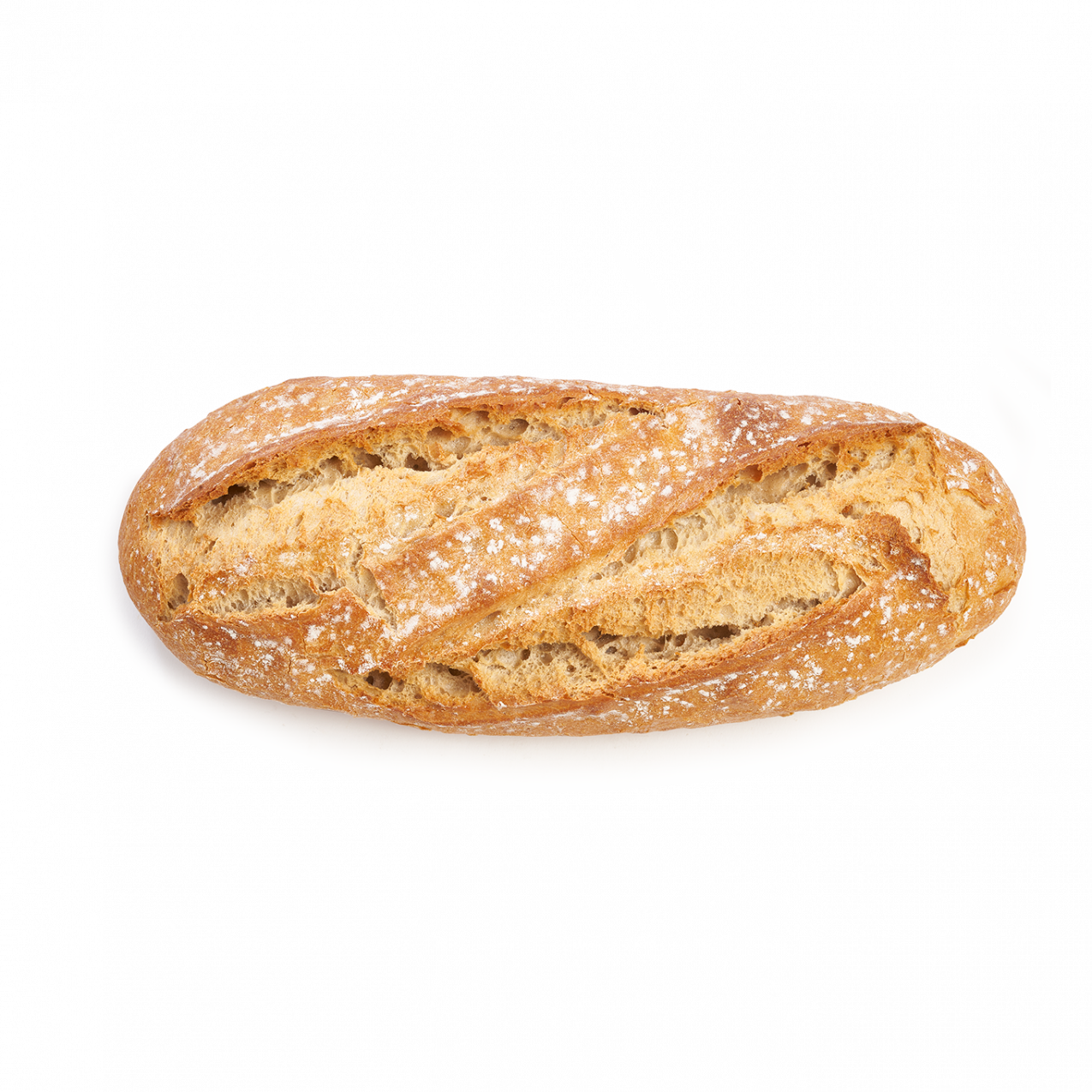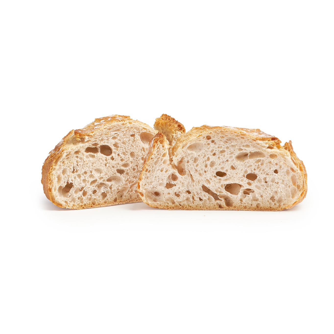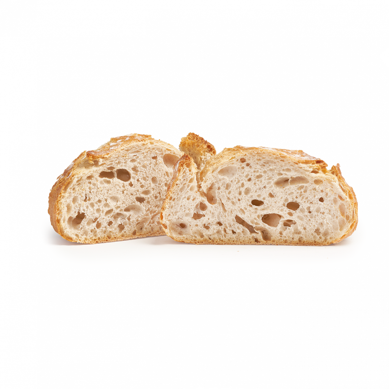 Panes de suela plana cocidos en los tradicionales Hornos de Suela de Piedra. La elevada y constante temperatura de este tipo de cocción dota al pan de una corteza rústica muy crujiente y una miga muy alveolada, consiguiendo una mayor durabilidad.