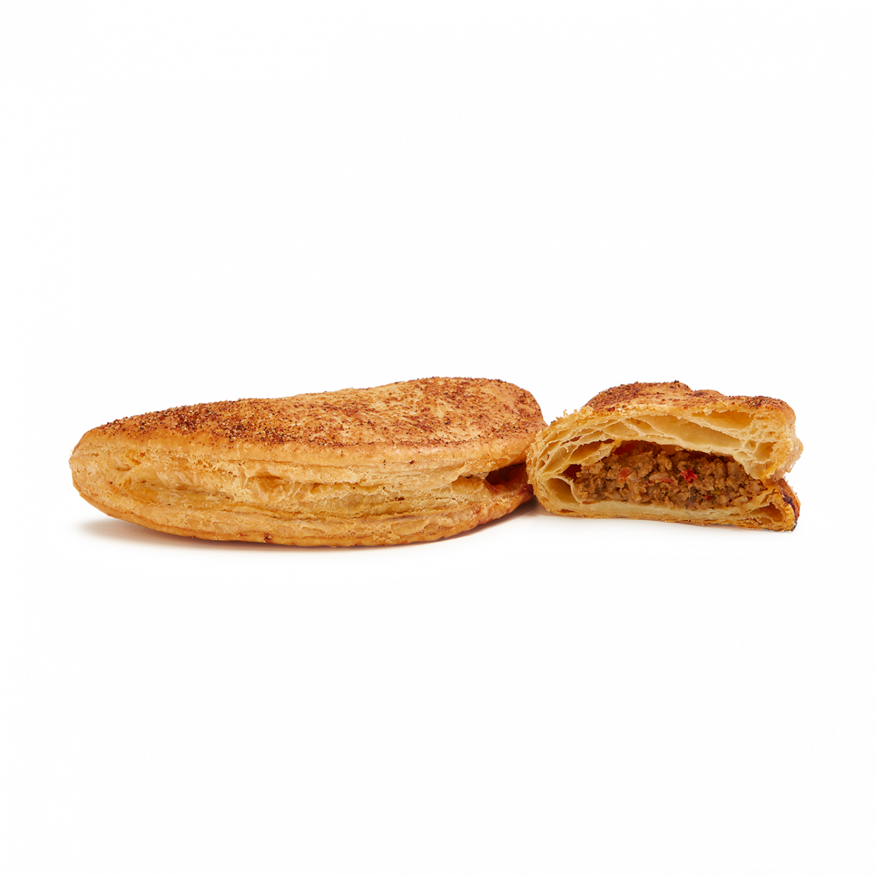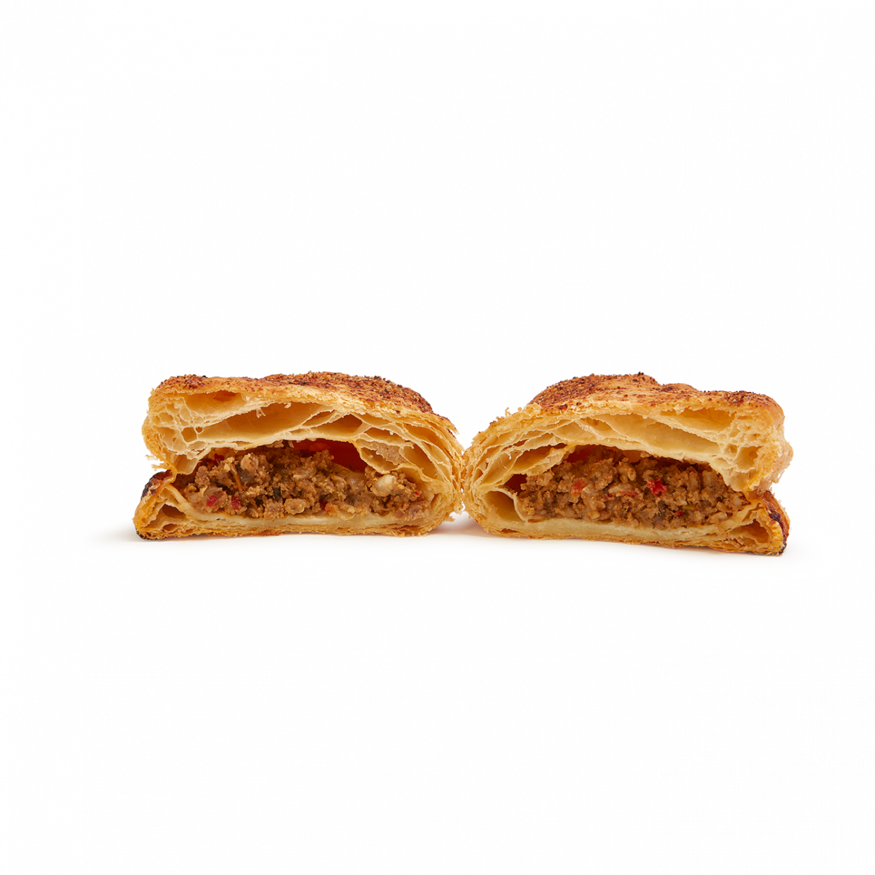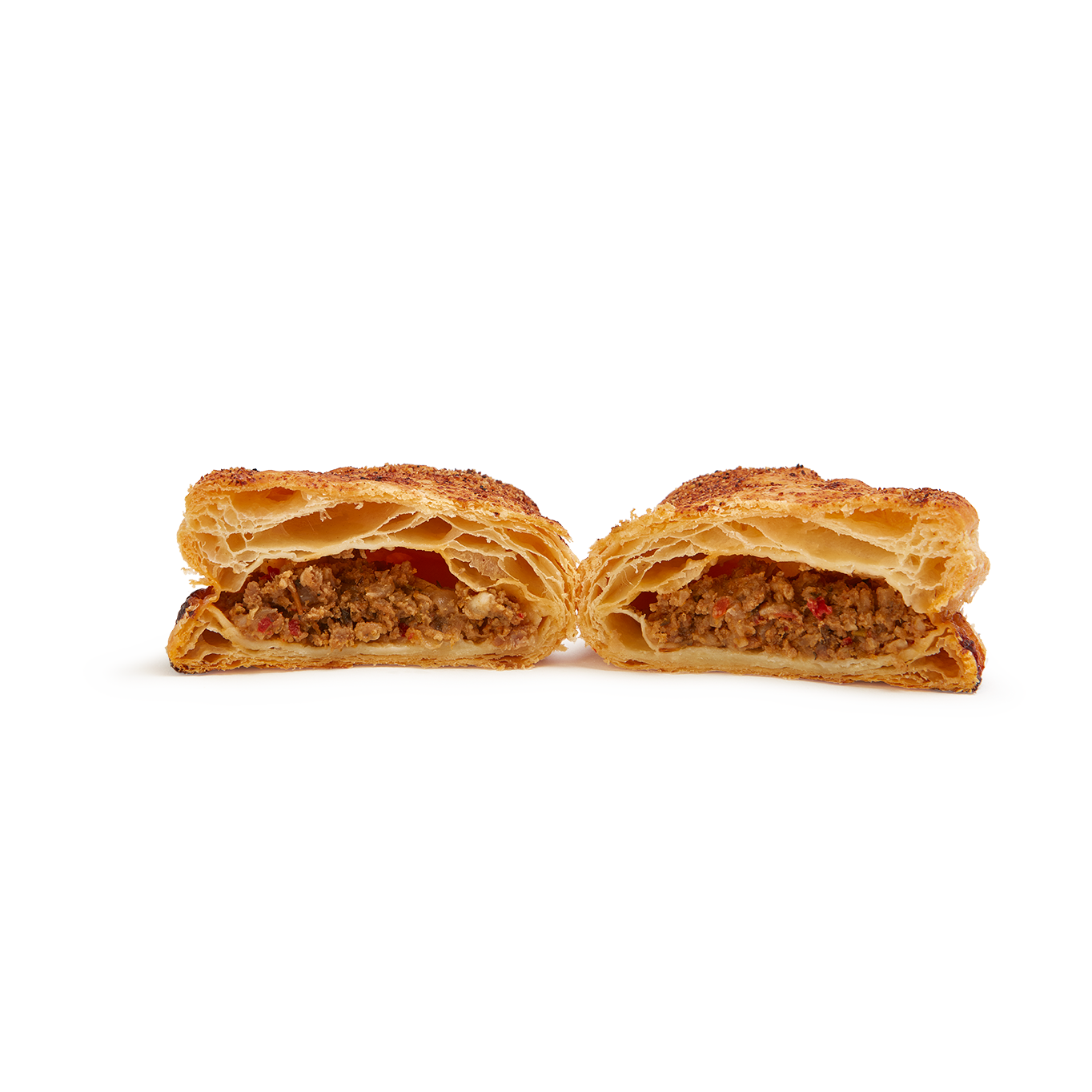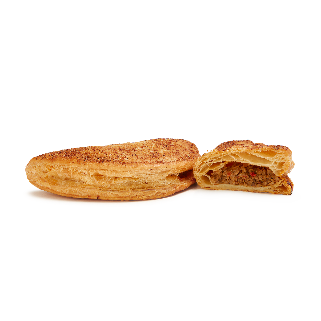 RELLENO DE SABOR SUAVE Y ESPECIADO. Rellena con carne de ternera picada (15,6%) y ya cocinada que combina con la cebolla frita (19,5%), el pimiento y el tomate para crear un relleno sabroso y ligeramente especiado con ajo, comino, pimienta negra, cayena, ajedrea, nuez moscada y una mezcla de finas hierbas.