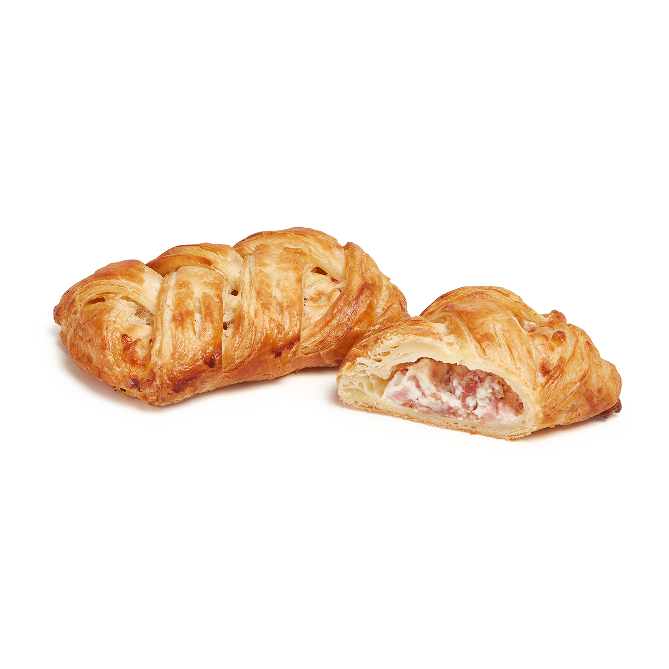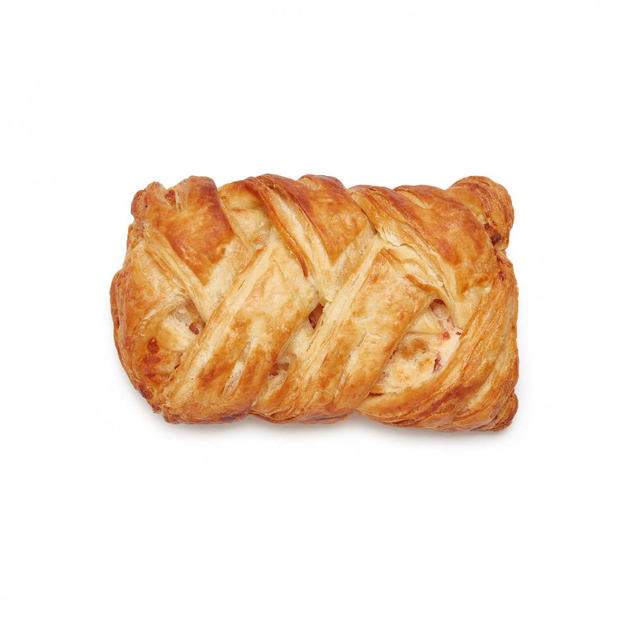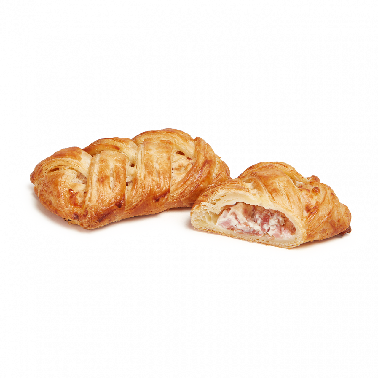 Trenza salada de masa danesa con relleno salado a trocitos: una propuesta versátil, de textura ligera y crujiente, rellena de forma generosa y visible, con un sabor equilibrado e intenso.
