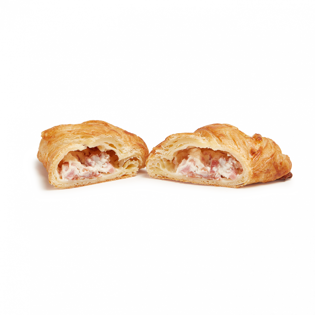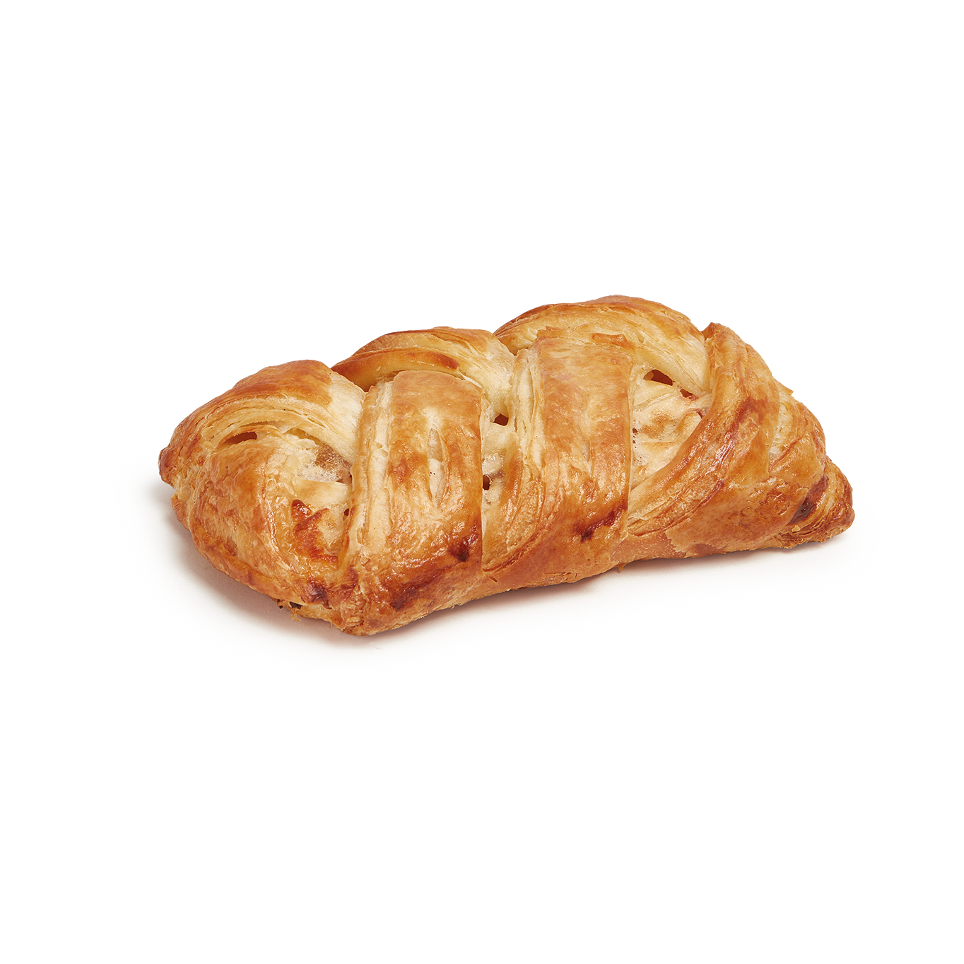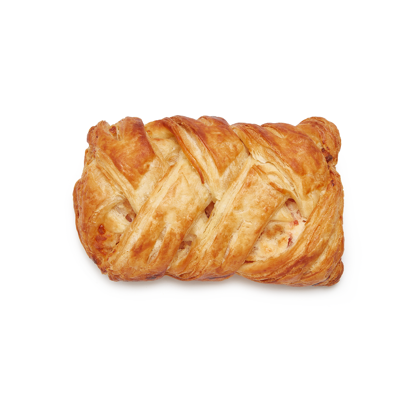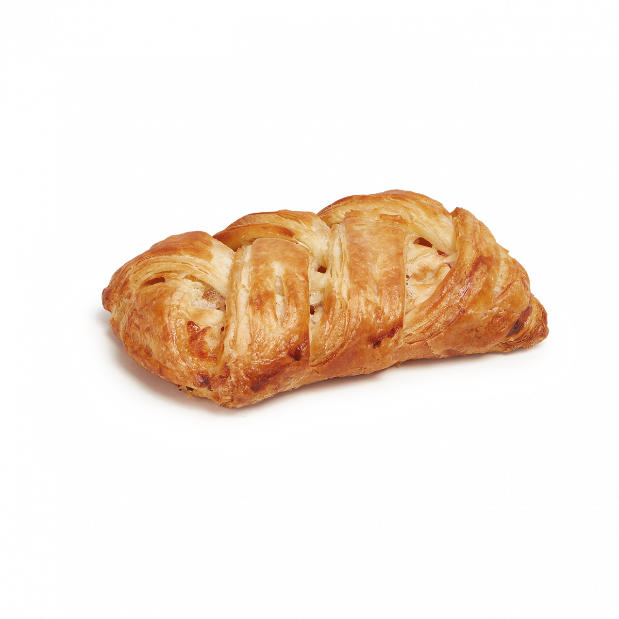Trenza salada de masa danesa con relleno salado a trocitos: una propuesta versátil, de textura ligera y crujiente, rellena de forma generosa y visible, con un sabor equilibrado e intenso.