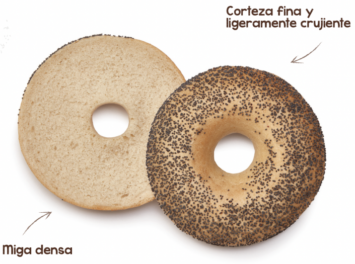 El bagel se distingue por su textura interior densa y una corteza fina ligeramente crujiente.