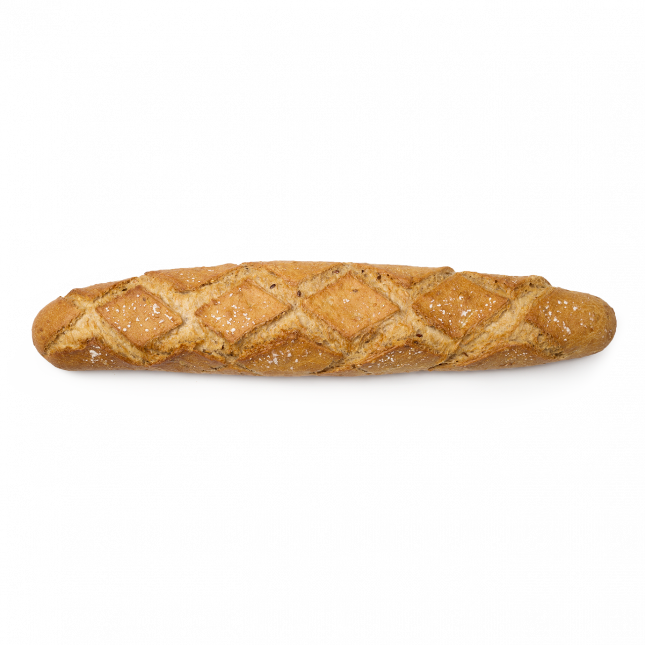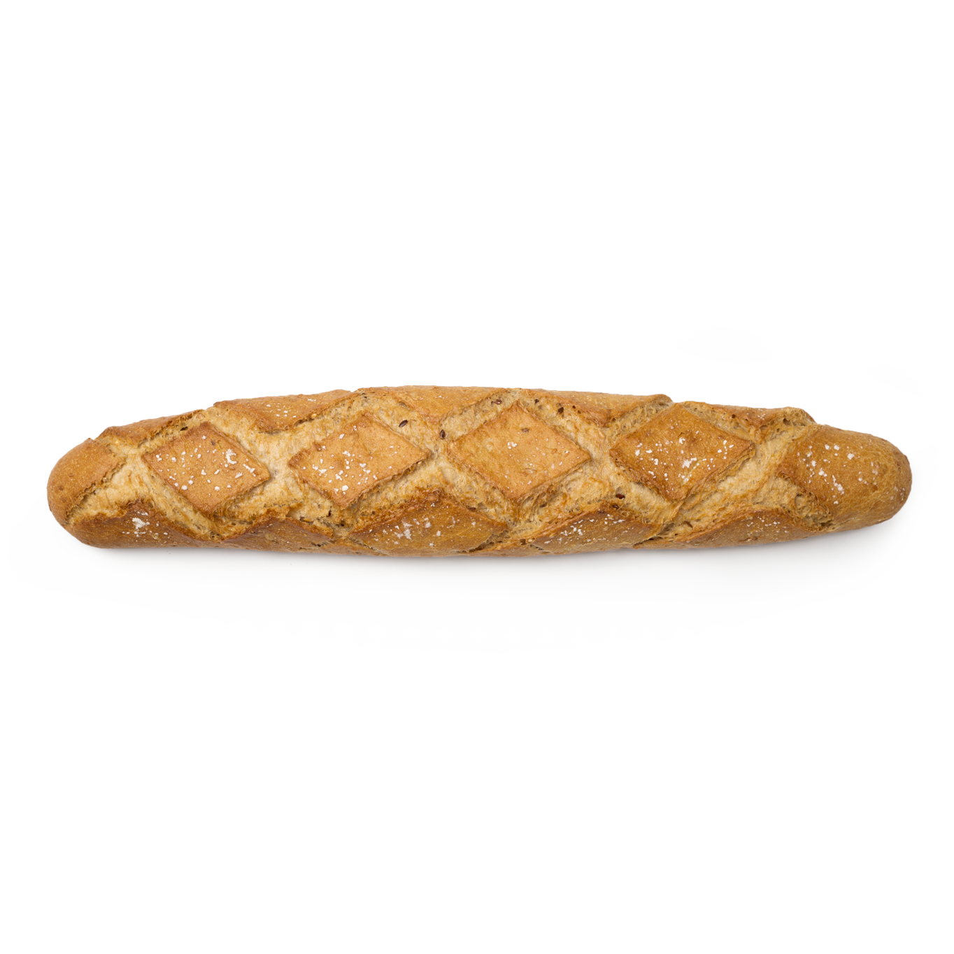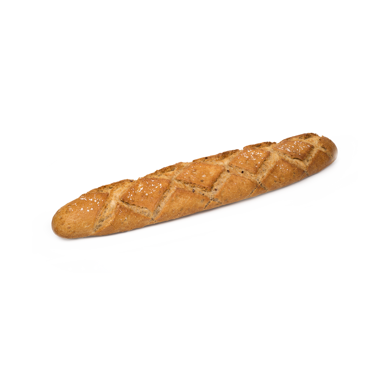 Su lenta elaboración le confiere una superficie con burbujas que se traduce en una mayor durabilidad. Posee una corteza dorada y crujiente pero fina y fácil de comer. Fuente de fibra. Contiene Masa Madre.