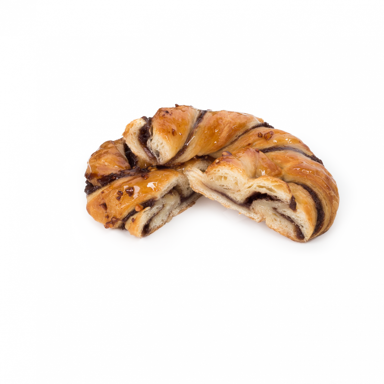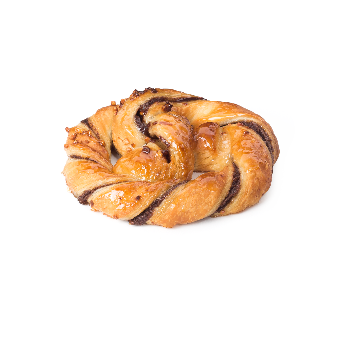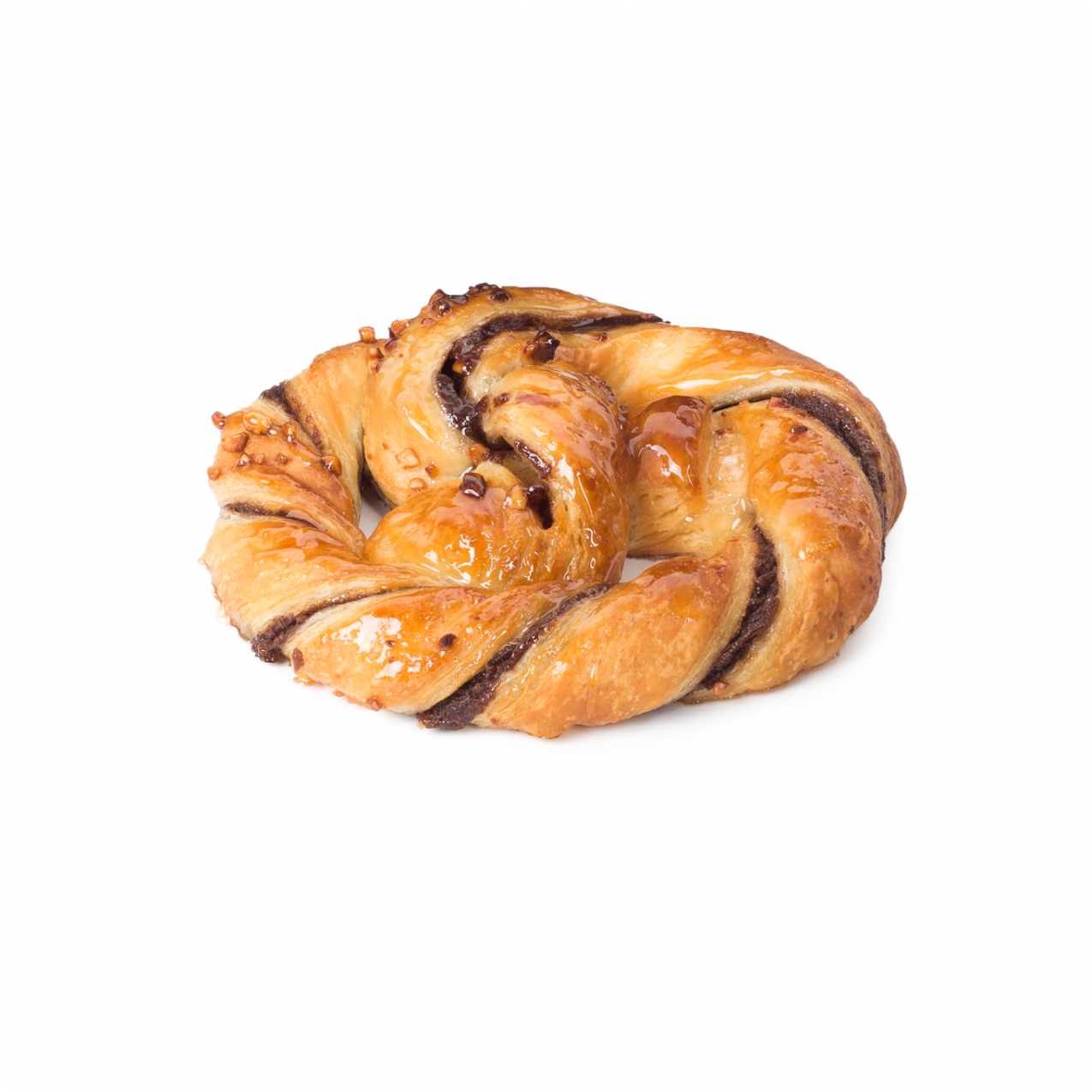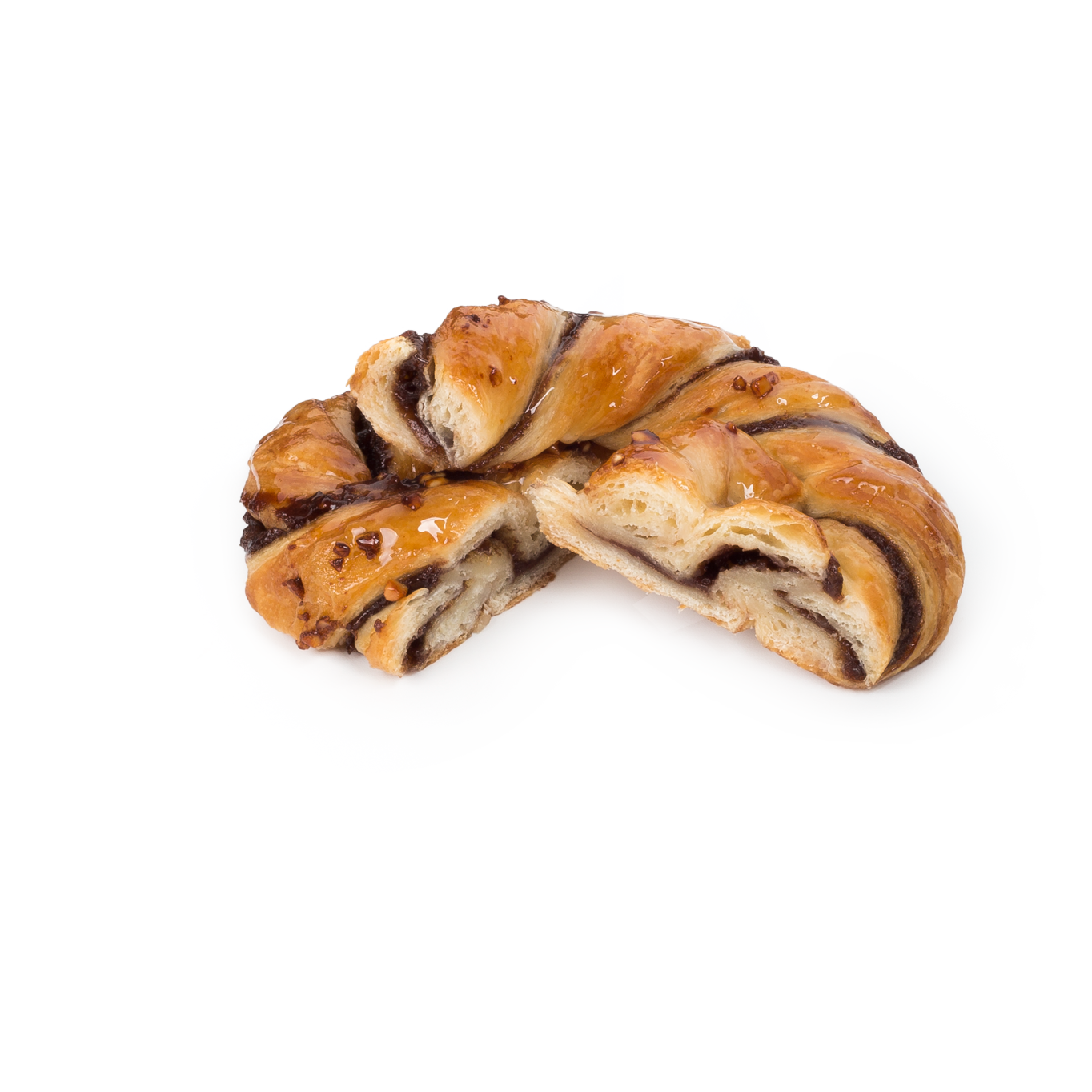 Delicioso producto de tierna y jugosa masa danesa. Con un generoso relleno de chocolate (28%). Aspecto muy atractivo gracias a su original formado. Decorado con azúcar y cacahuete.