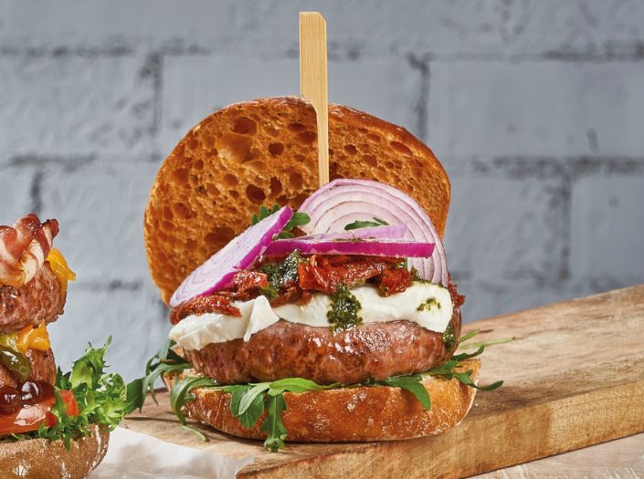 Elaborada con tomate (2%) y especias que aportan mucho sabor y color: orégano, albahaca, romero y tomillo. Ideal para crear una hamburguesa al estilo italiano, con queso de búfala, esto y tomate seco.