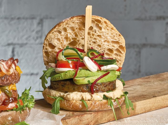 Pruébala con "carne" de berenjena, hummus, aguacate y champiñón.