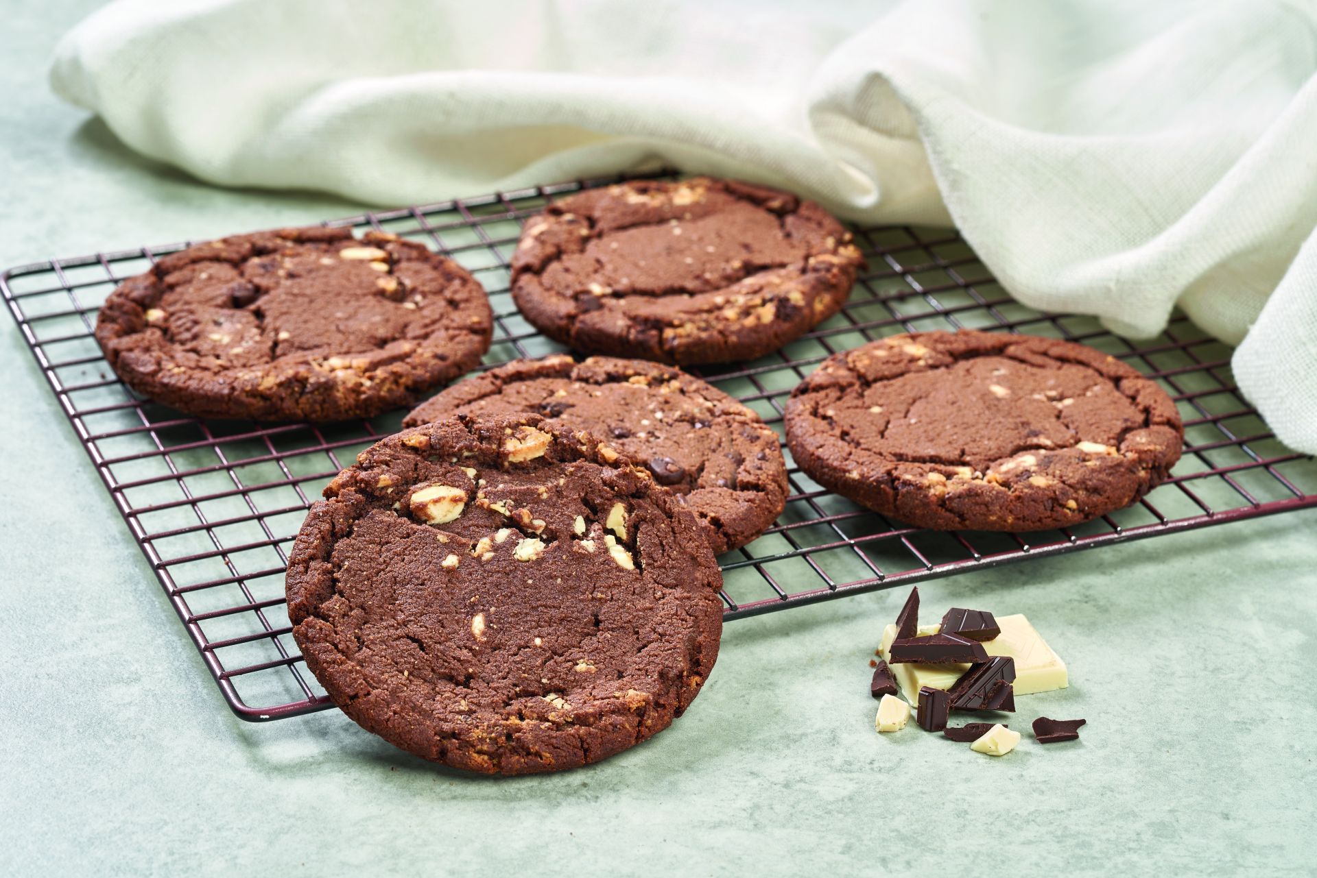 ¡Doble chocolate! Deliciosa masa con cacao, pepitas de chocolate blanco (14%) y chocolate (5%).