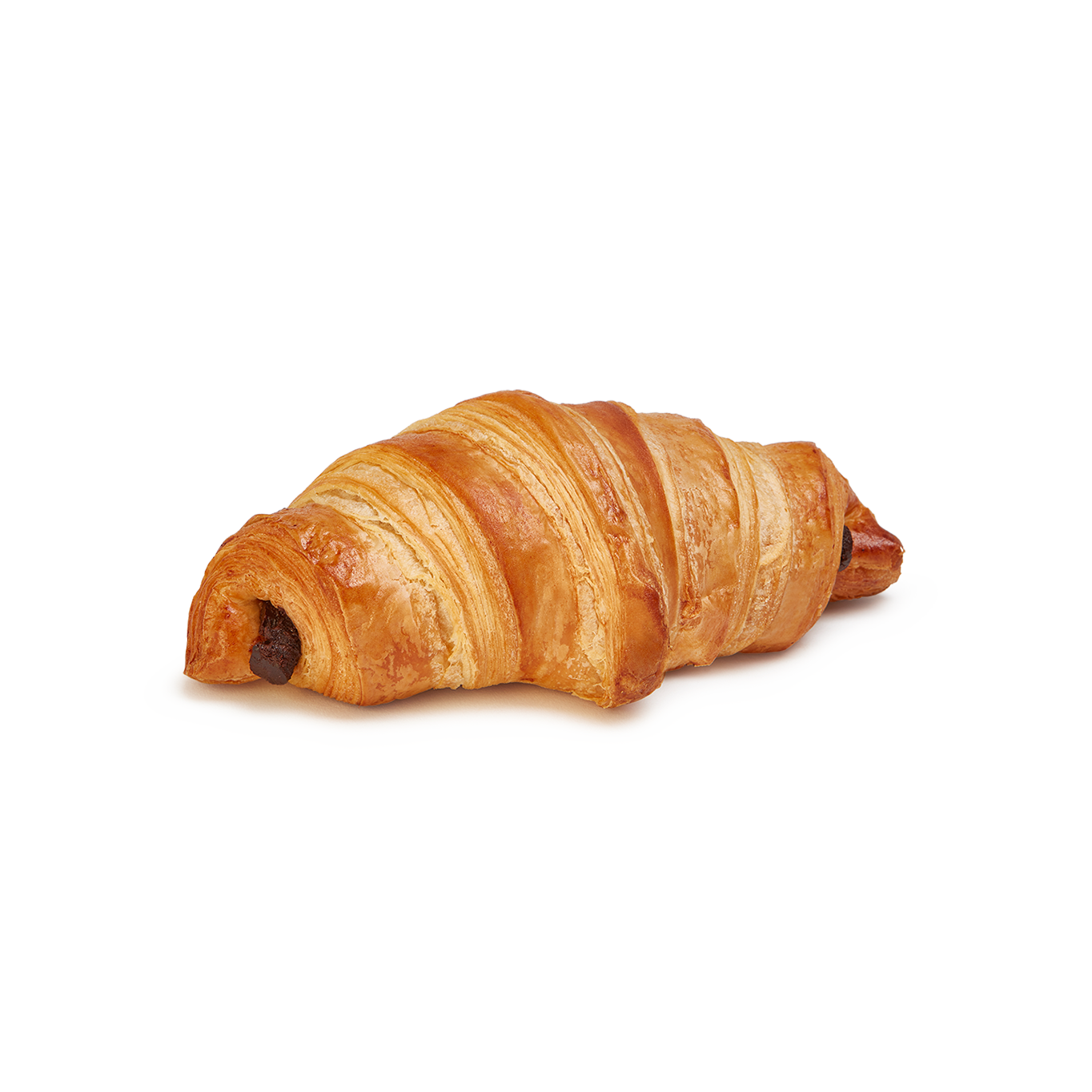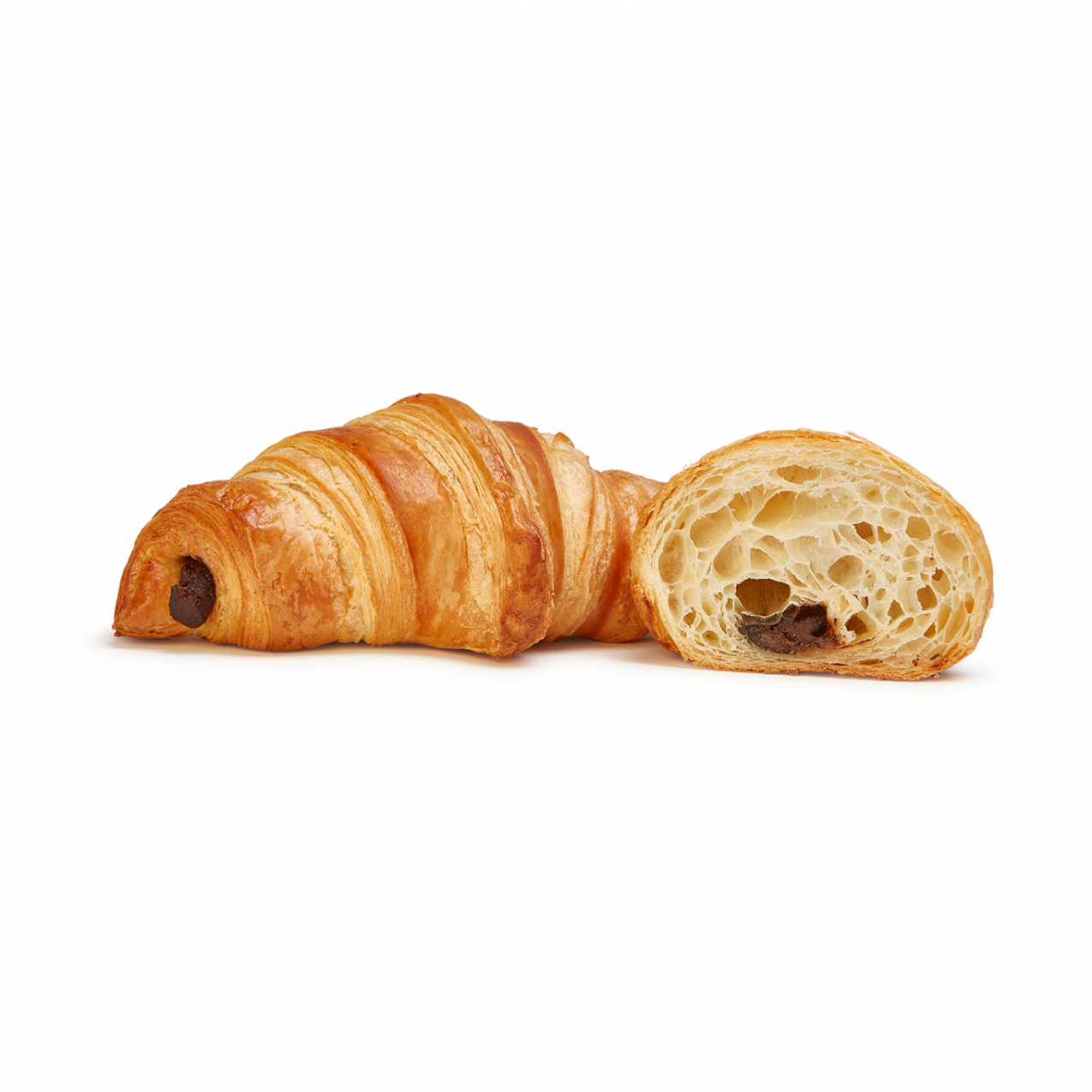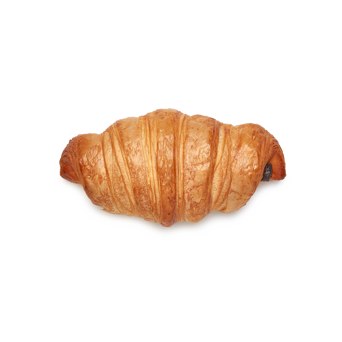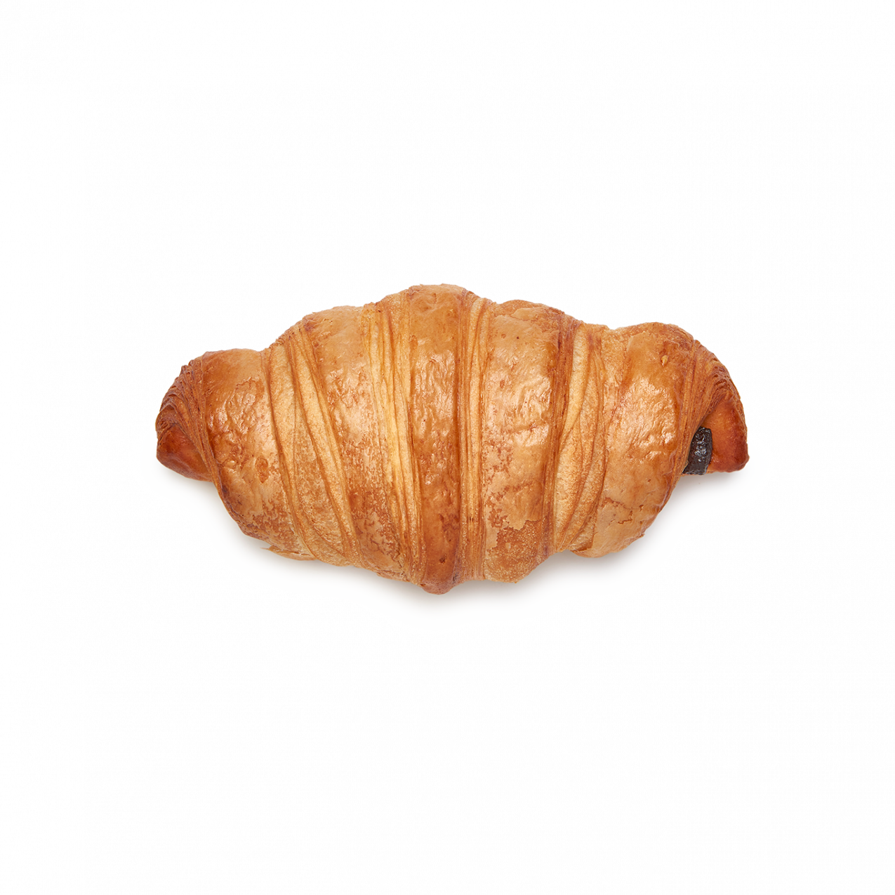 Este croissant, elaborado con manteca (23%), presenta una masa de textura hojaldrada, con un laminado que se aprecia en toda su superficie y en sus puntas.