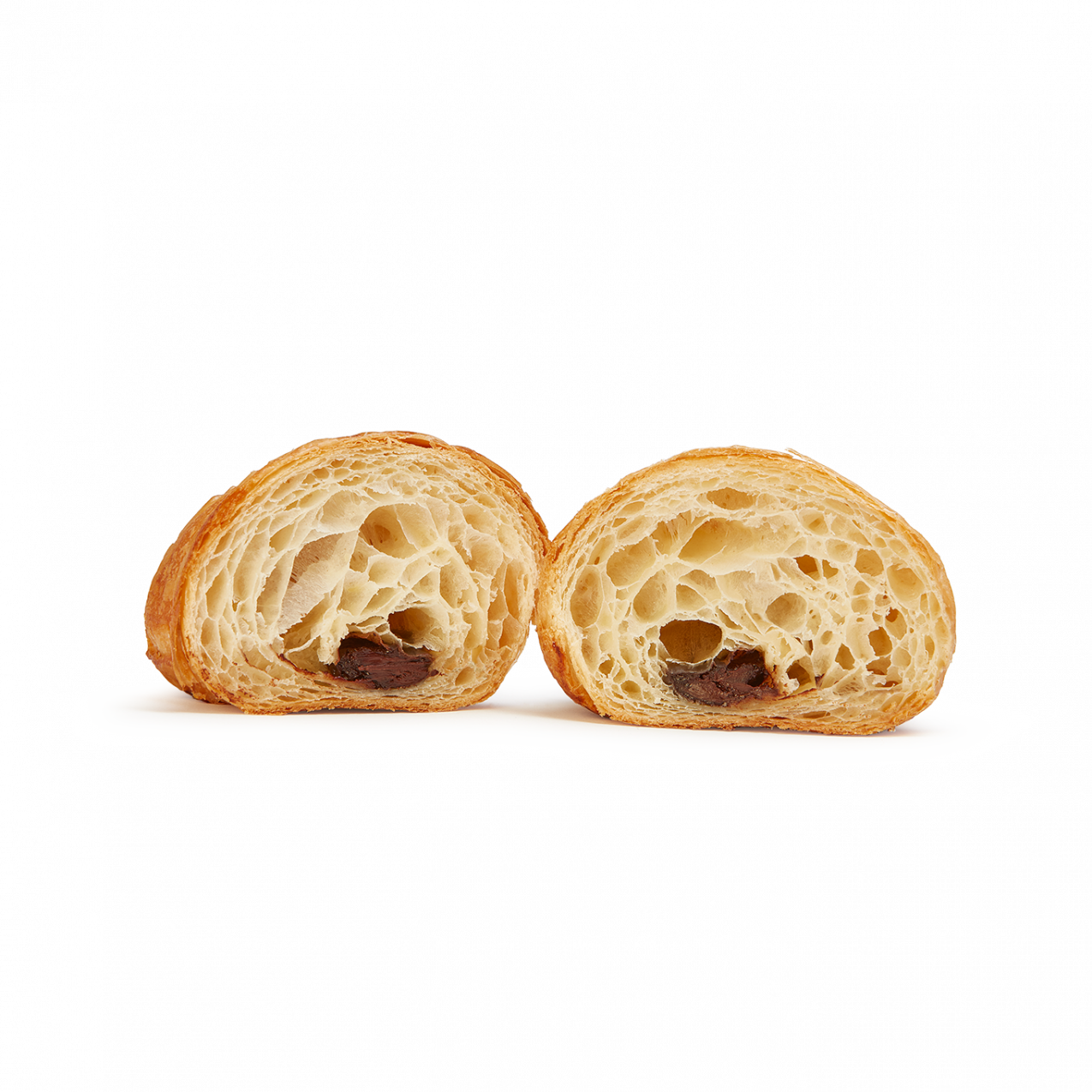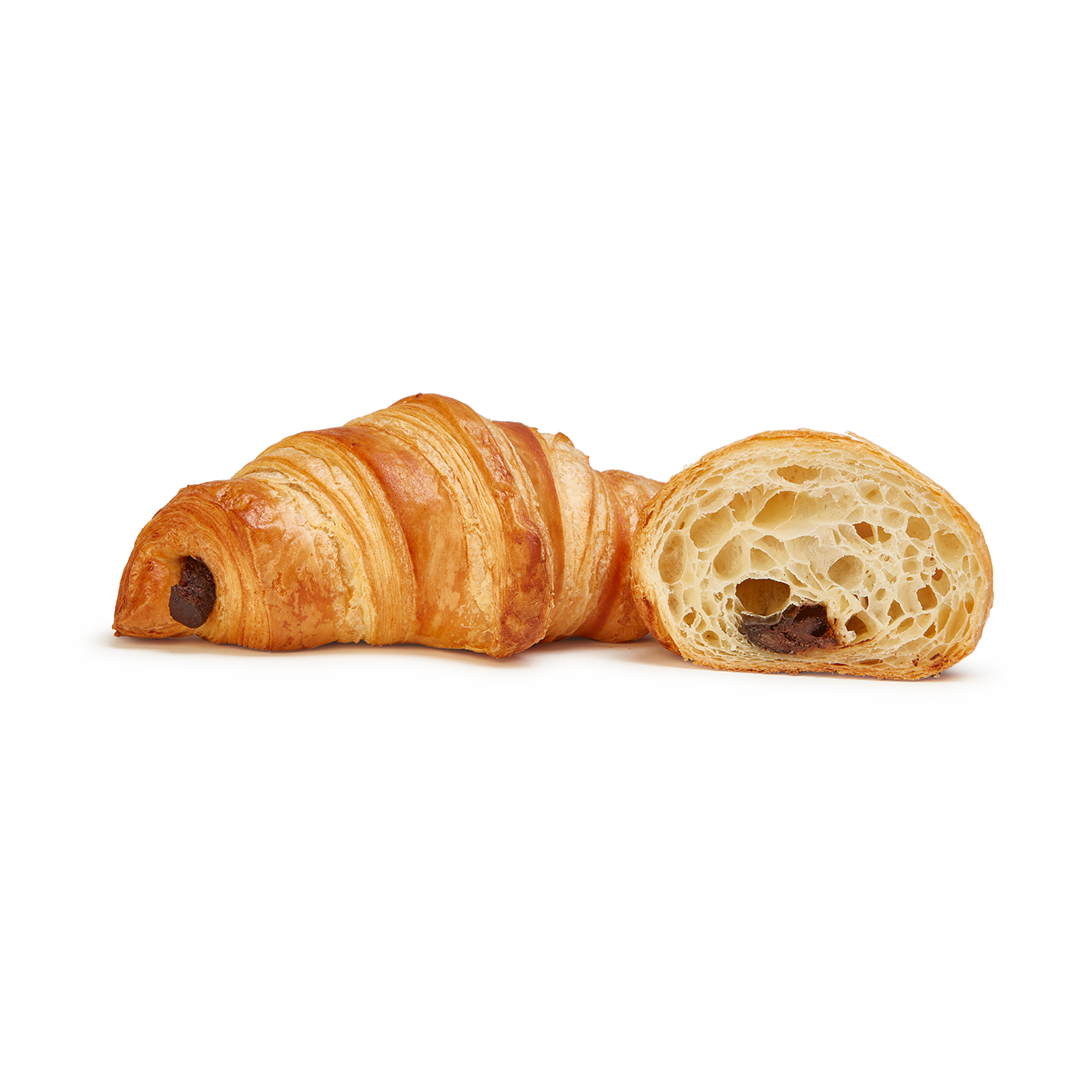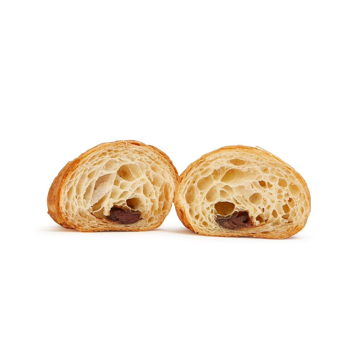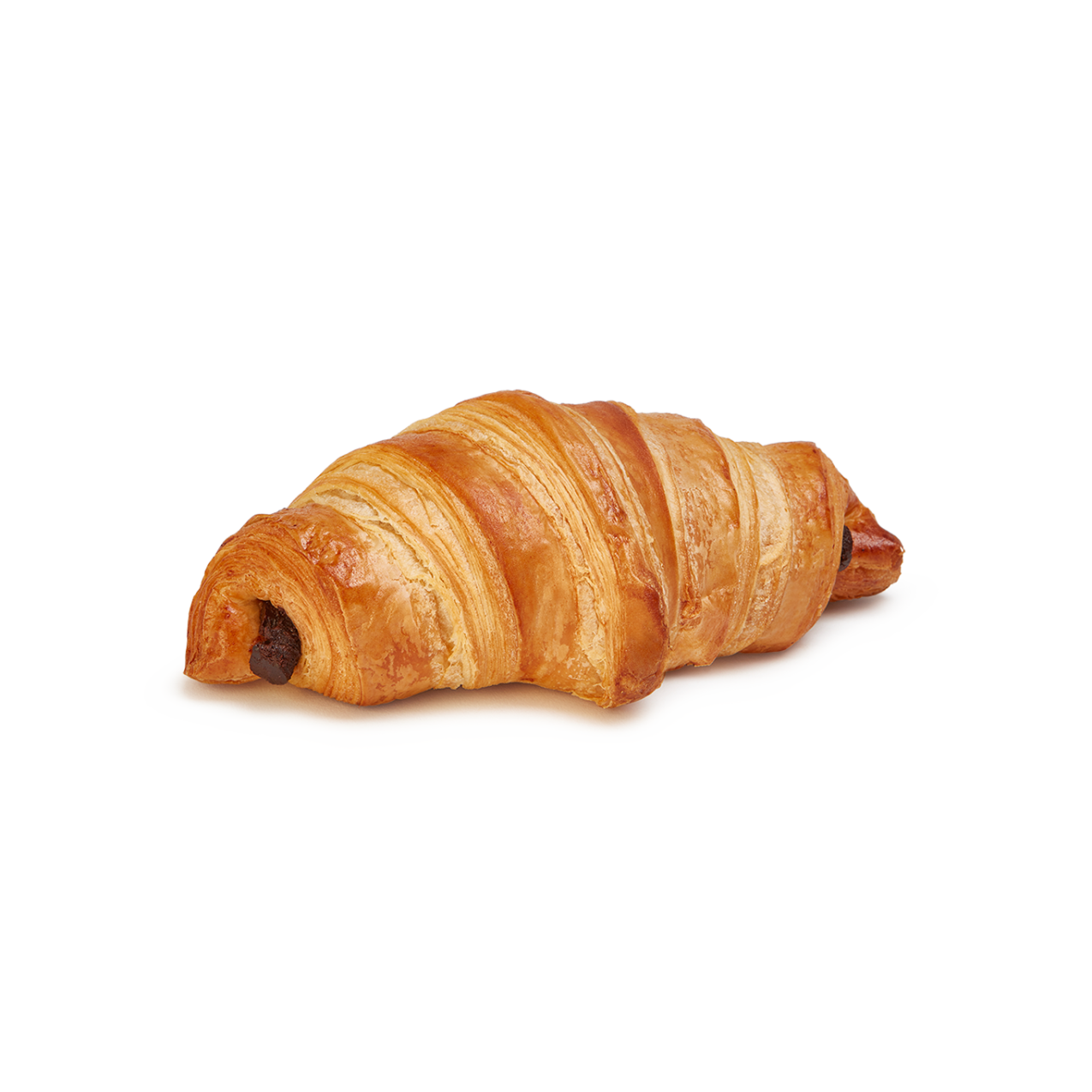 Este croissant, elaborado con manteca (23%), presenta una masa de textura hojaldrada, con un laminado que se aprecia en toda su superficie y en sus puntas.