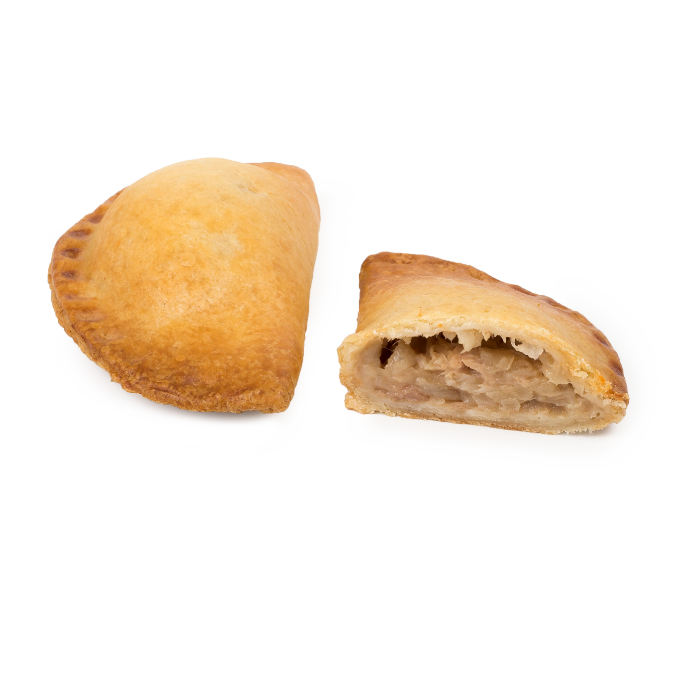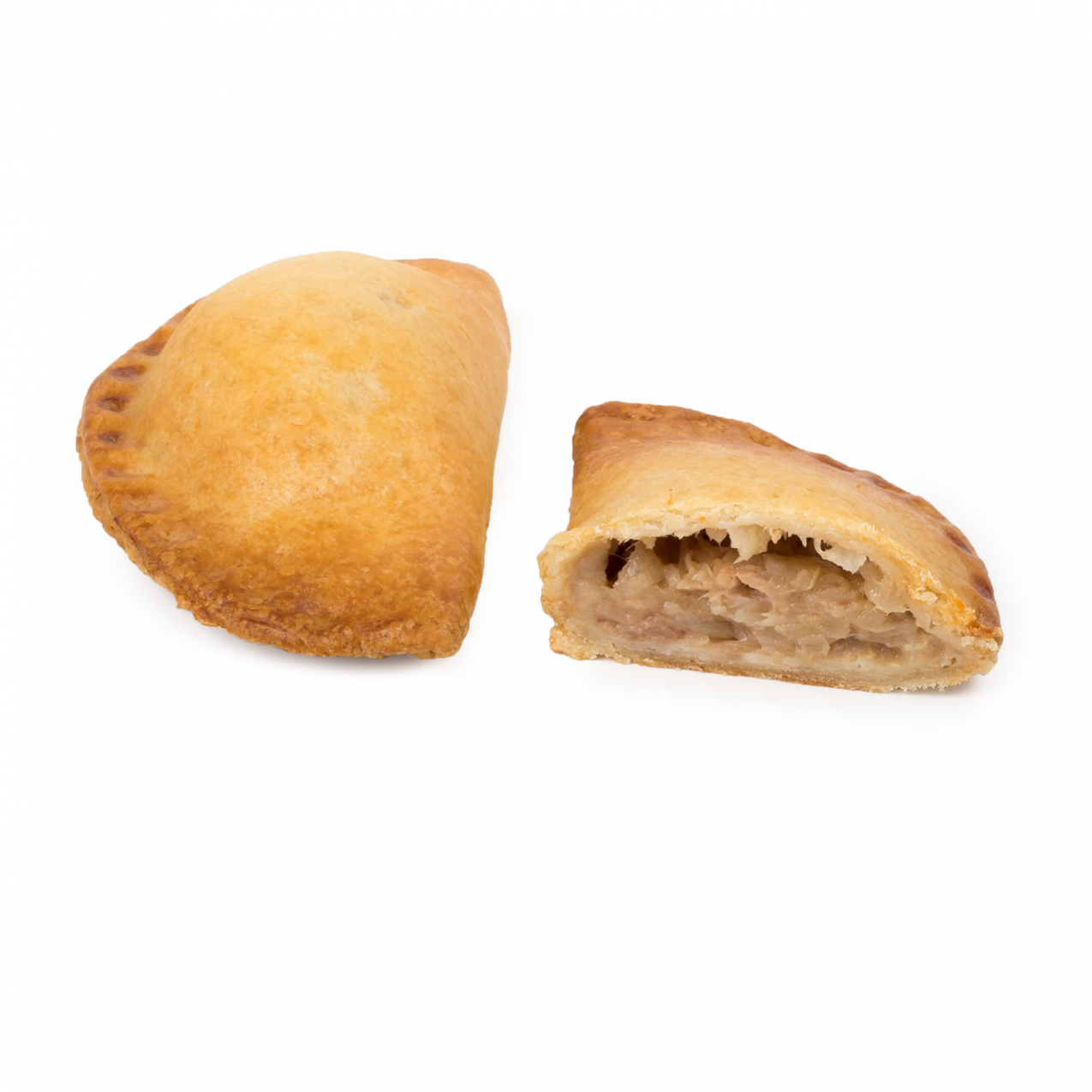 Deliciosa empanadilla de masas escaldada fina y crujiente elaborada con una receta equilibrada y sabrosa. Con un generoso relleno de atún y cebolla cuyos trocitos son perfectamente visibles. Ya pintada con huevo. 40% de relleno.