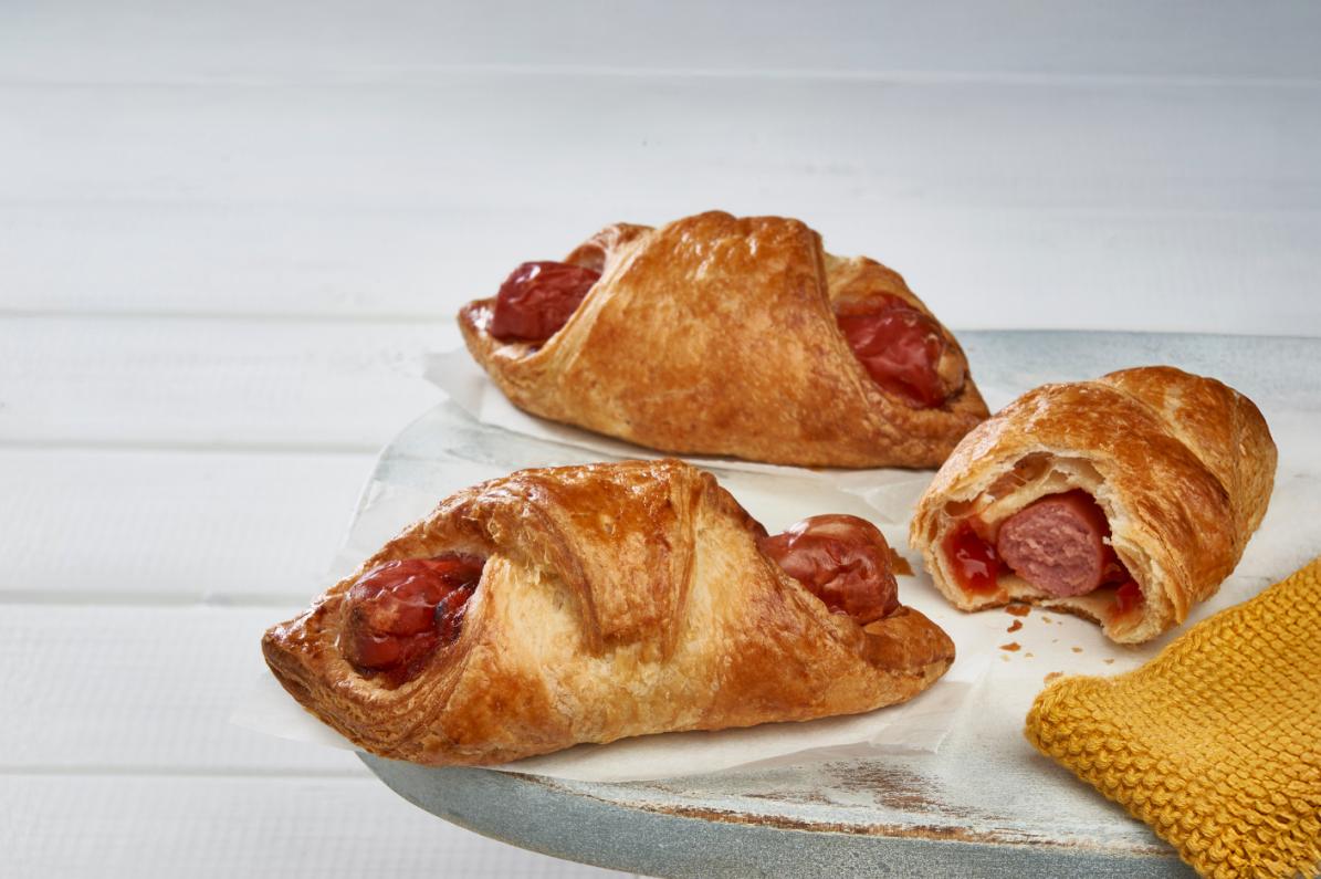 Pañuelo Hot Dog. Una pieza hojaldrada y dorada rellena de salchicha tipo frankfurt y salsa ketchup.