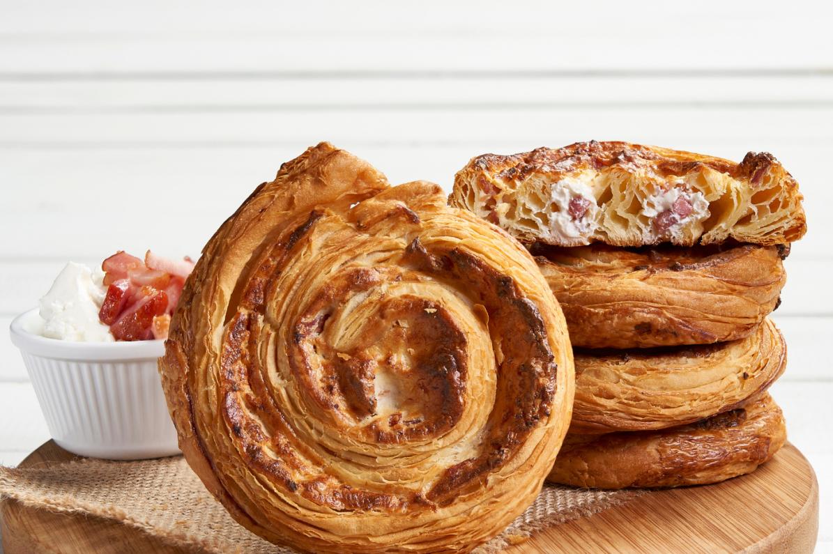 Snecken Queso y Bacon. Una espiral premium que marca la diferencia por su masa hojaldrada y dorada y un relleno gourmet de queso crema y bacon crujiente en tiras.