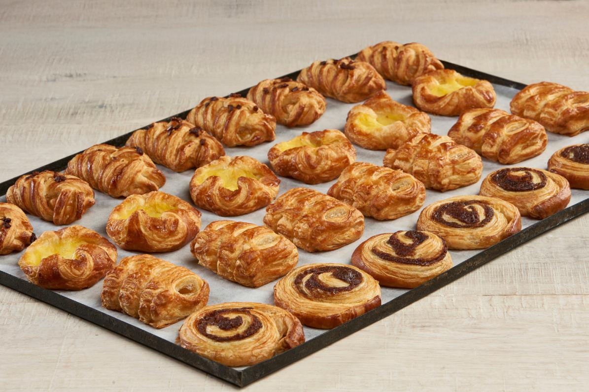 Surtido de Mini Danesas. Cuatro variedades hojaldradas inspiradas en la tradición pastelera del norte de Europa, con masas doradas y brillantes y acabados incomparables.