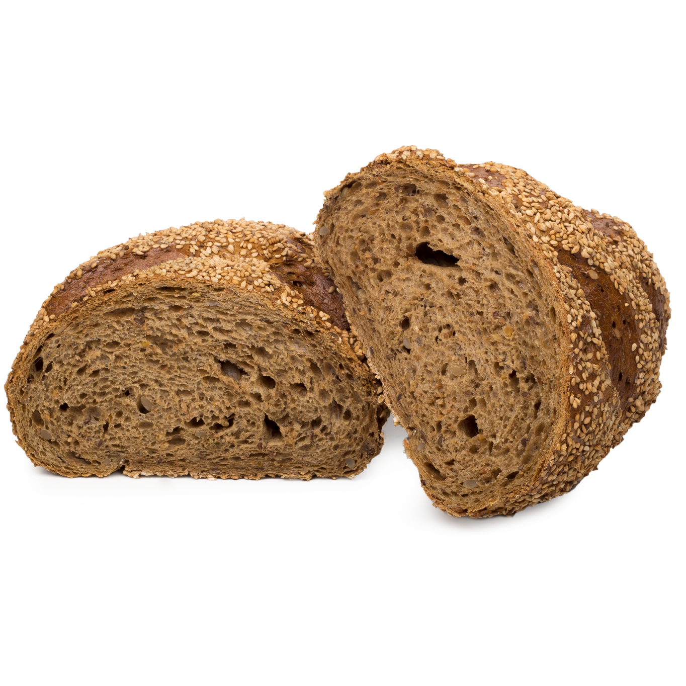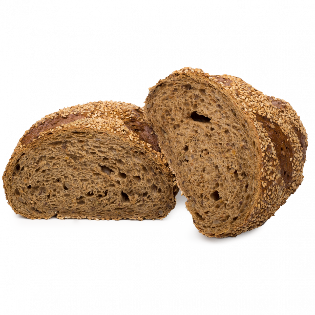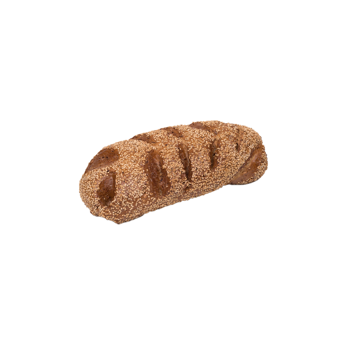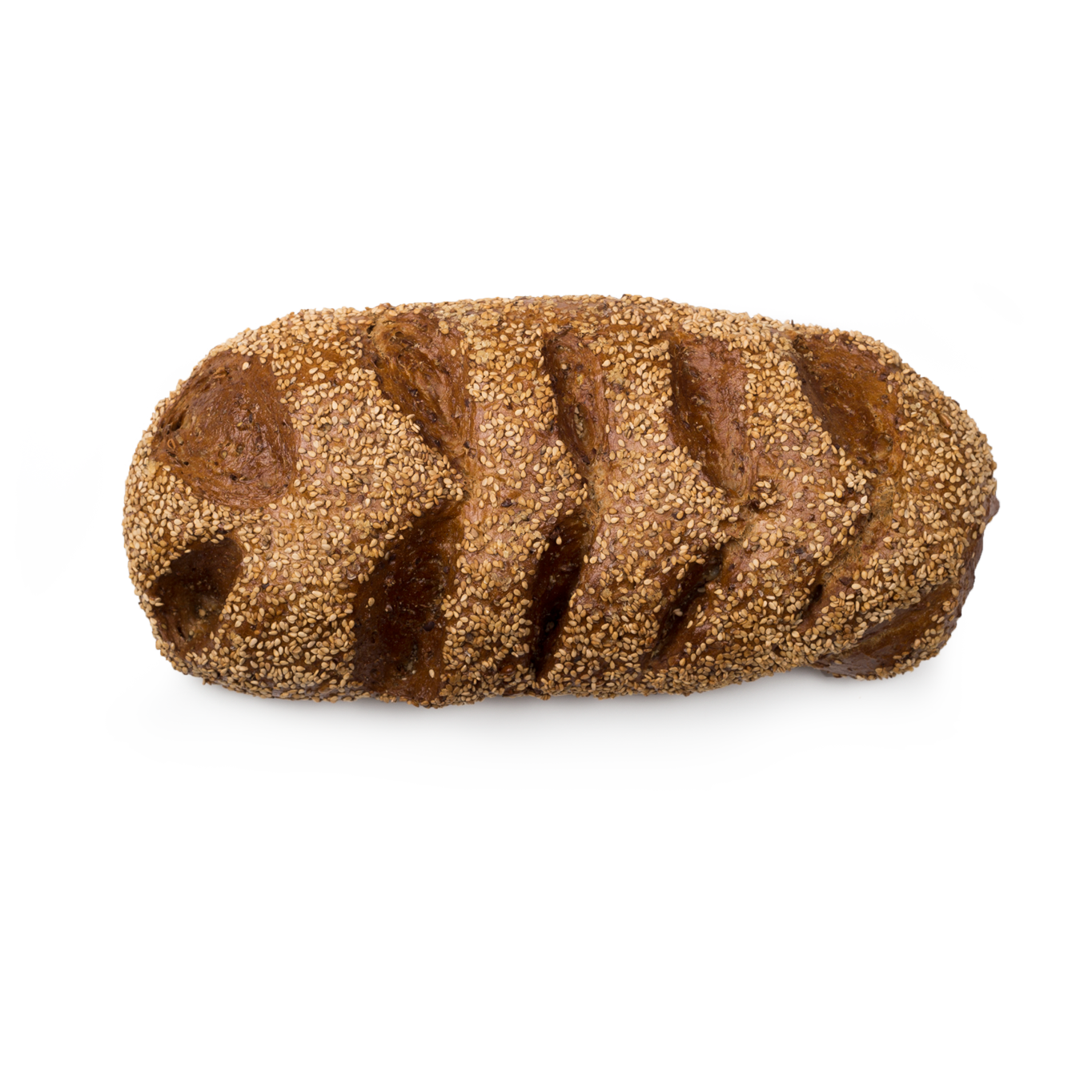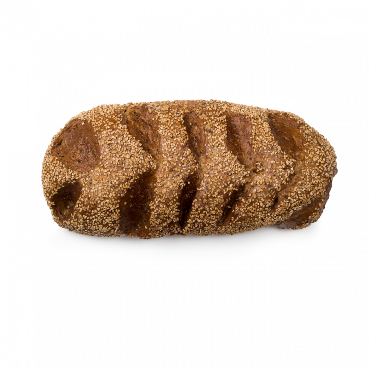 Hogaza alargada Ideal para rebanar. Elaborada con 8 cereales y semillas: trigo, centeno, cebada, maíz, pipas de girasol, lino marrón, soja y decorada con sésamo natural. Con masa madre natural de trigo. Su tamaño es ideal para consumir en menos tiempo.