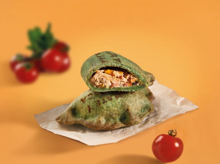 Masa verde: Elaborada con harina de trigo, aceite de girasol y albahaca (1%), su masa de color verde y el nombre de la receta impreso en el centro de la empanada, ayudan a identificarla, facilitando de ese modo su elección.