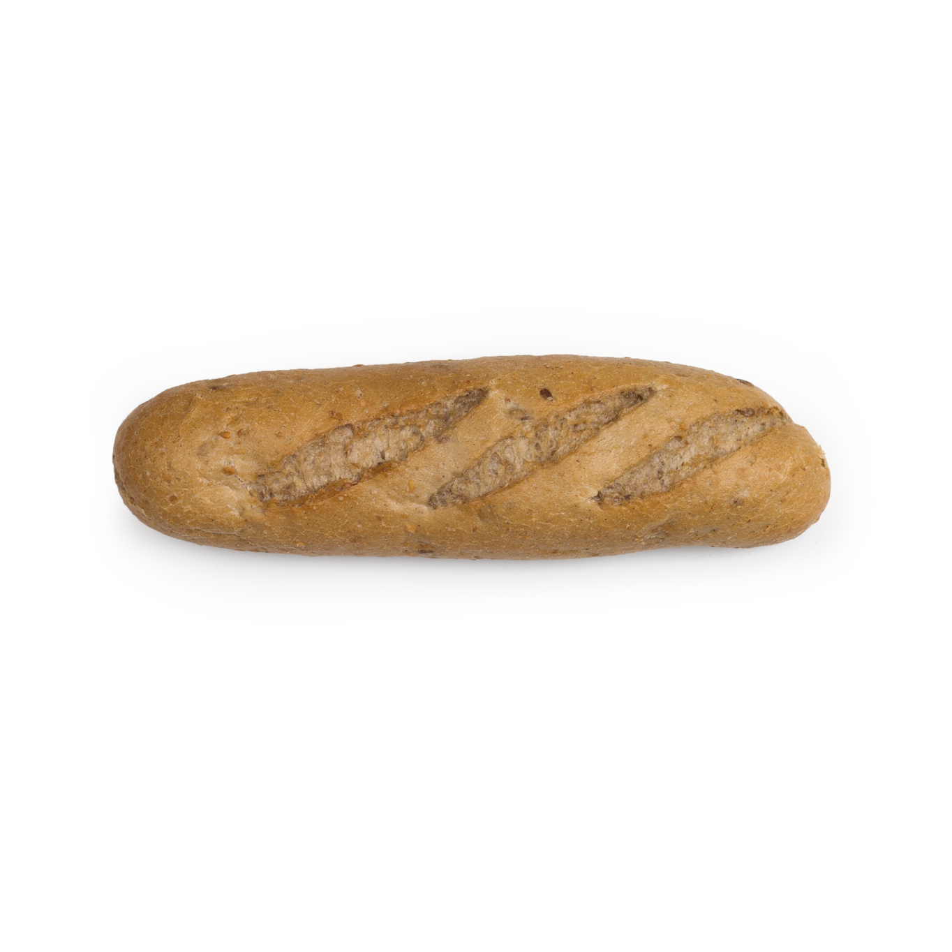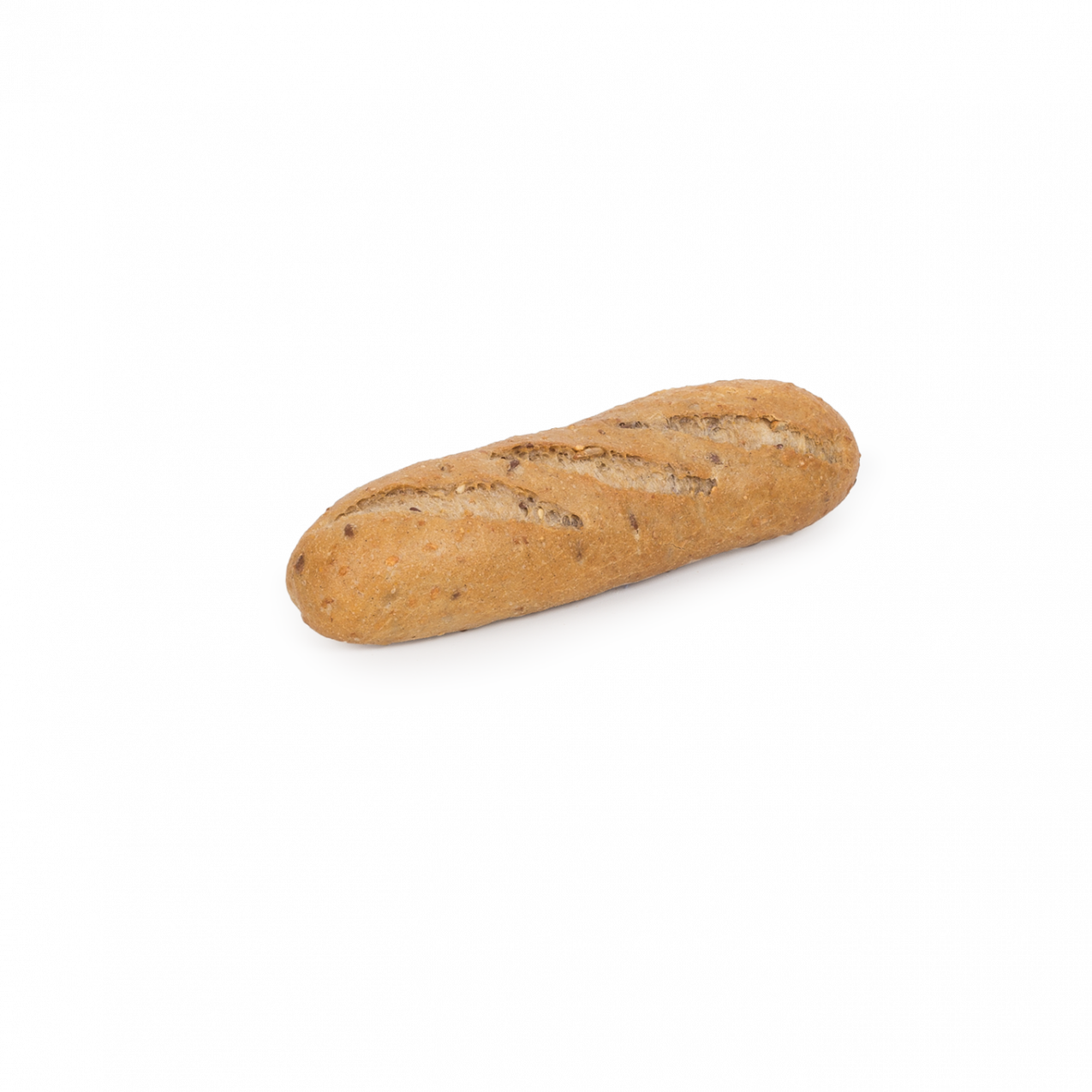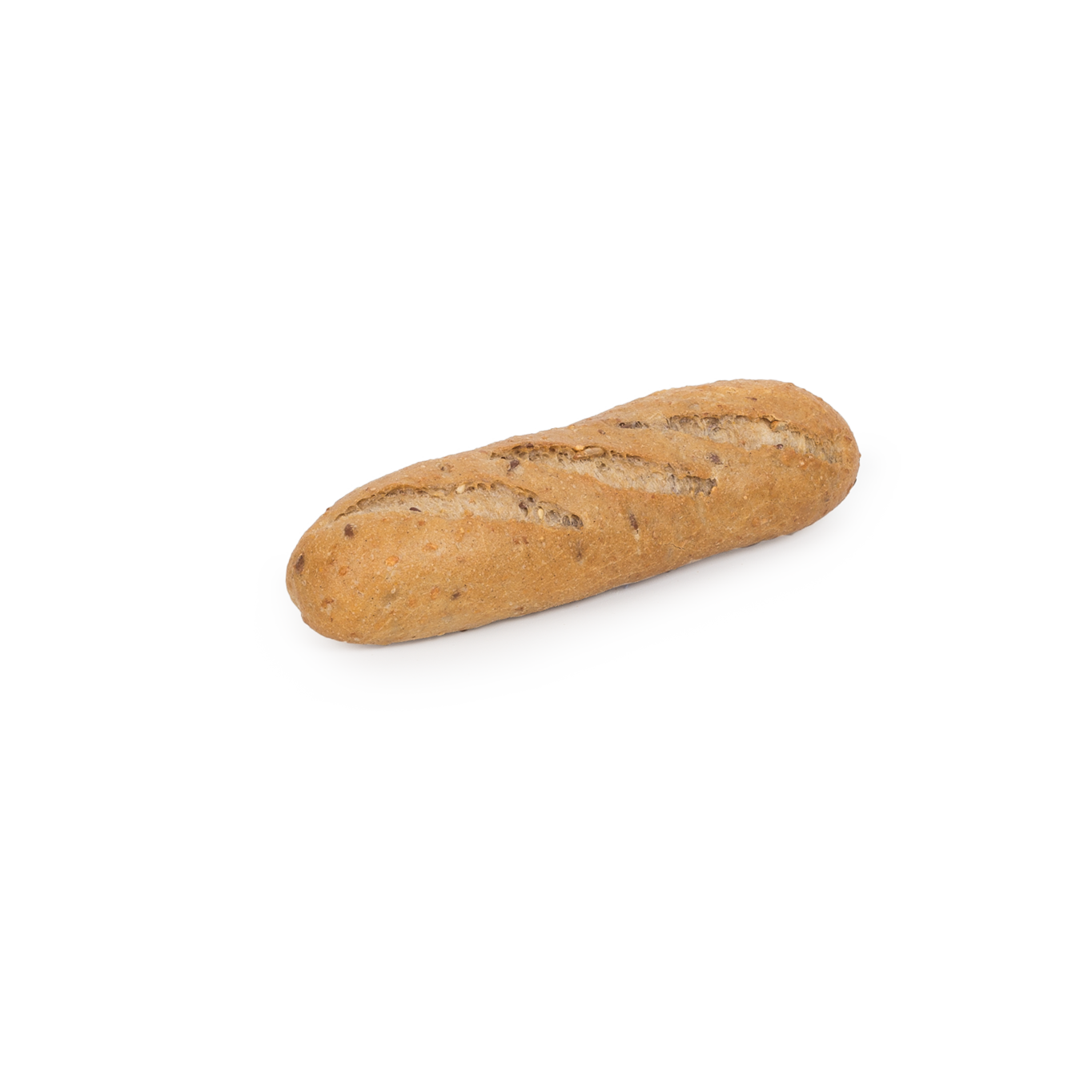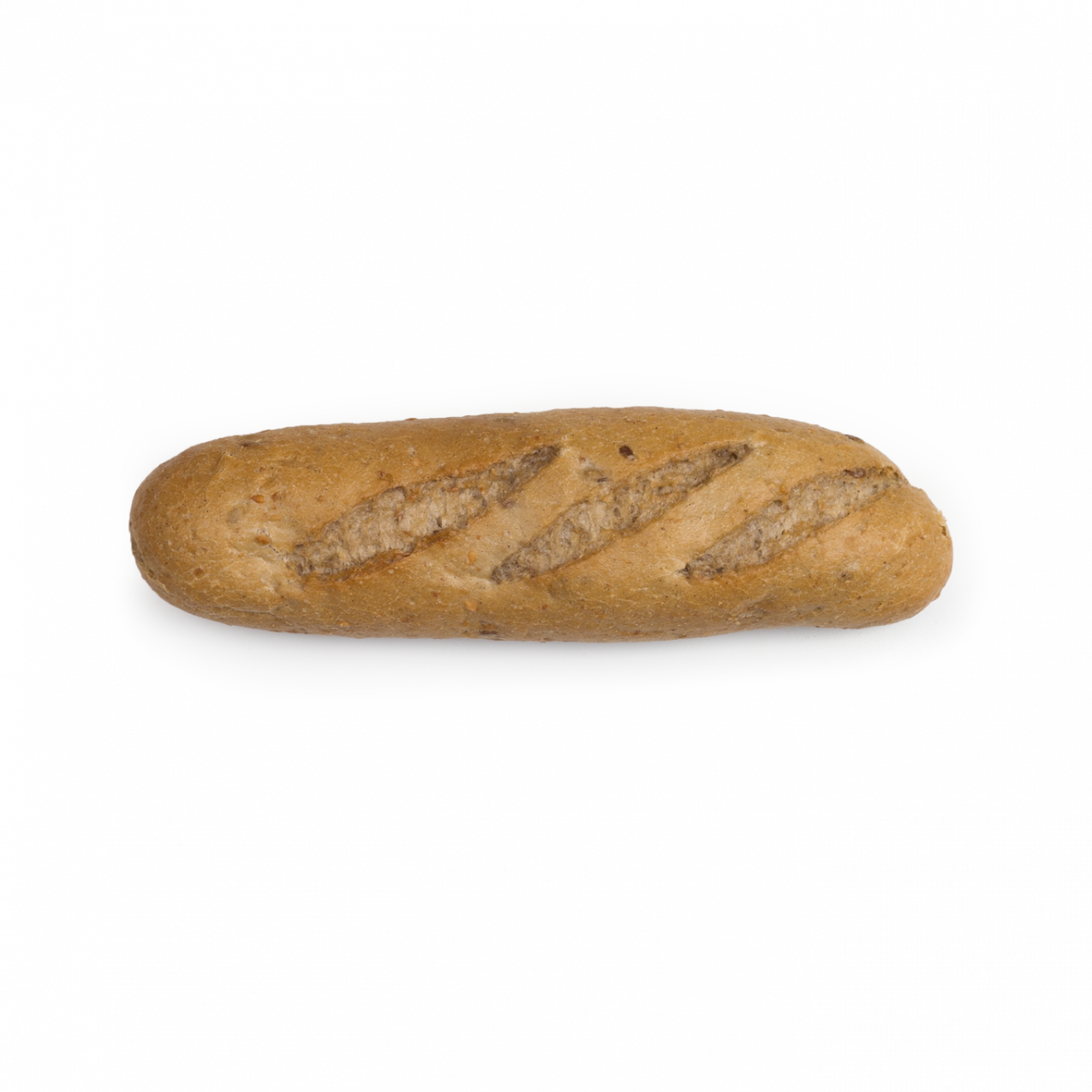 Mini baguettina de corteza fina y crujiente elaborada con un mix de cereales y semillas: trigo, centeno, centeno integral, salvado de trigo, avena, maíz, lino, sésamo y pipas de girasol. Perfecta para elaborar montaditos con recetas saludables.