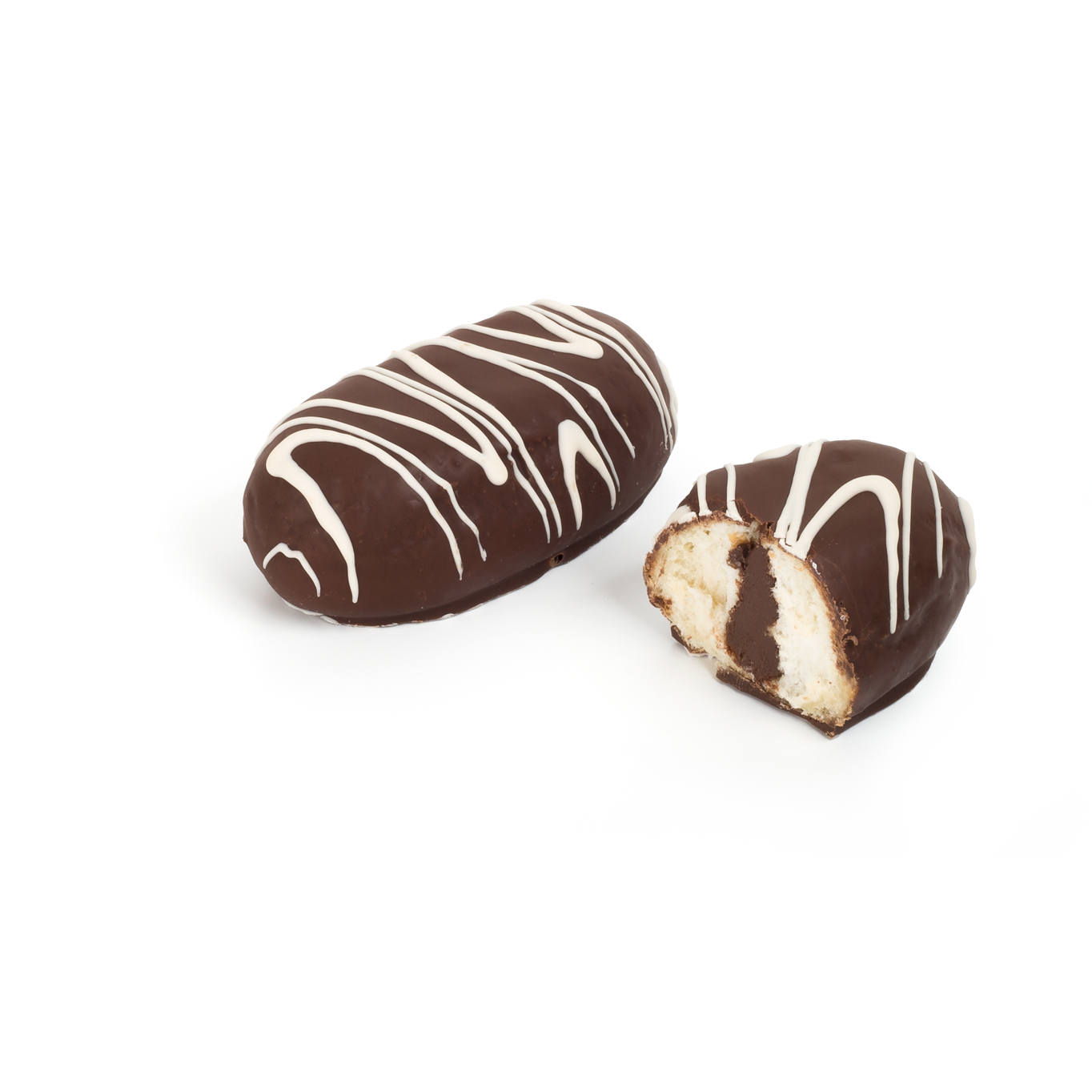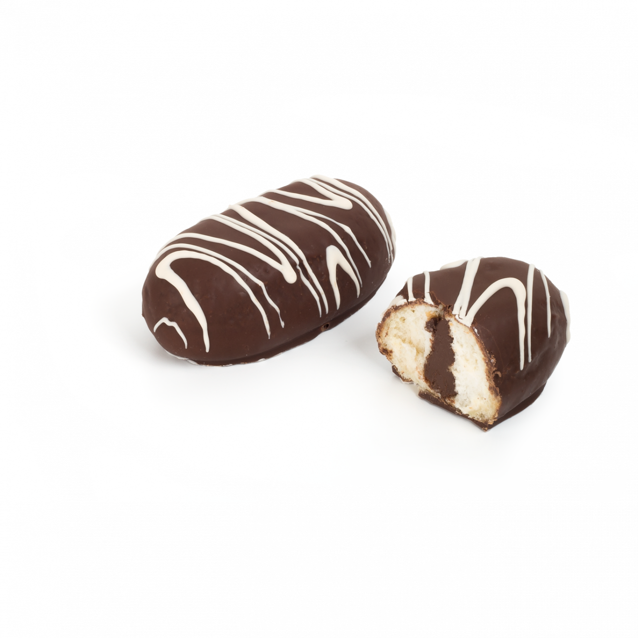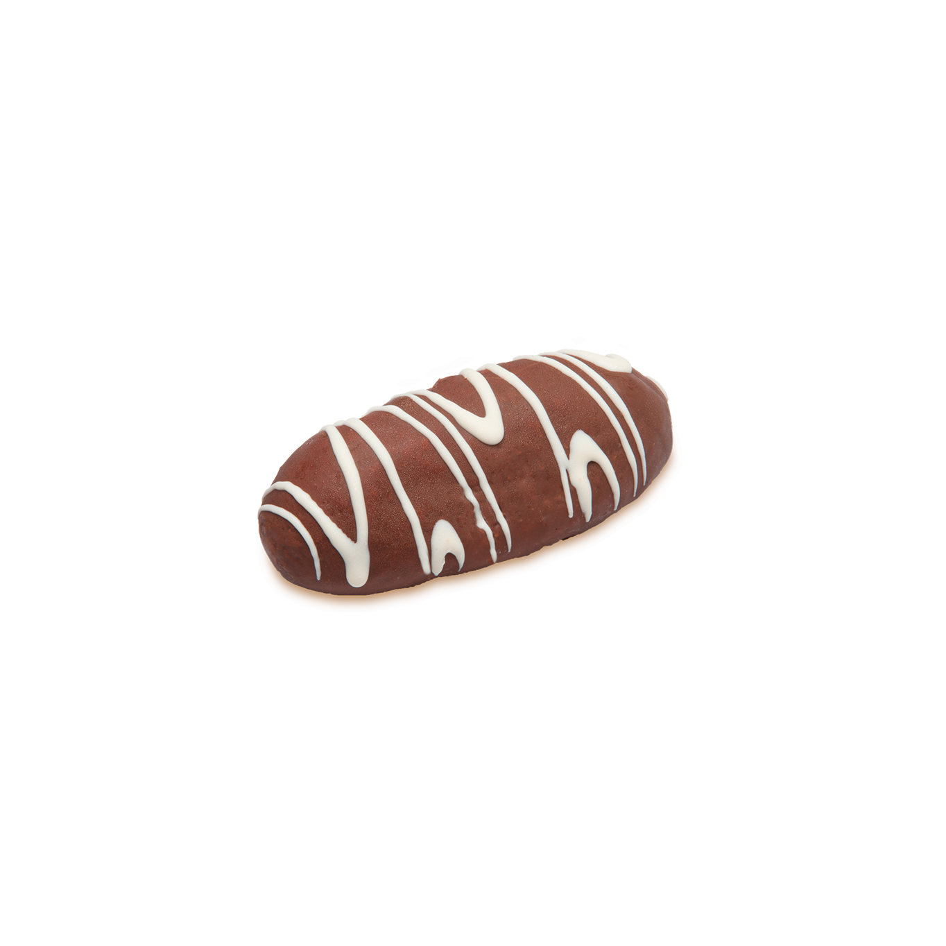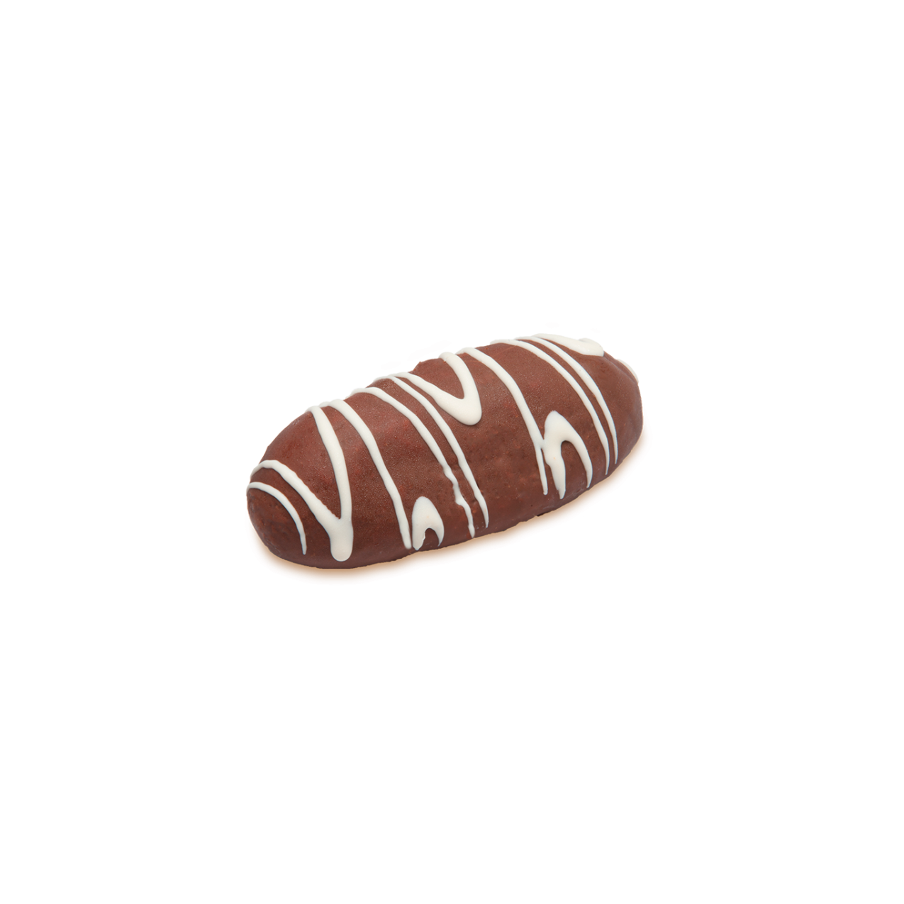Mini Pepito bañado con cobertura bombón y decorado con rayas de chocolate blanco. Su abundante relleno de crema de chocolate con avellanas está repartido por todo su interior. Un autentica bomba para repetir una y otra vez.