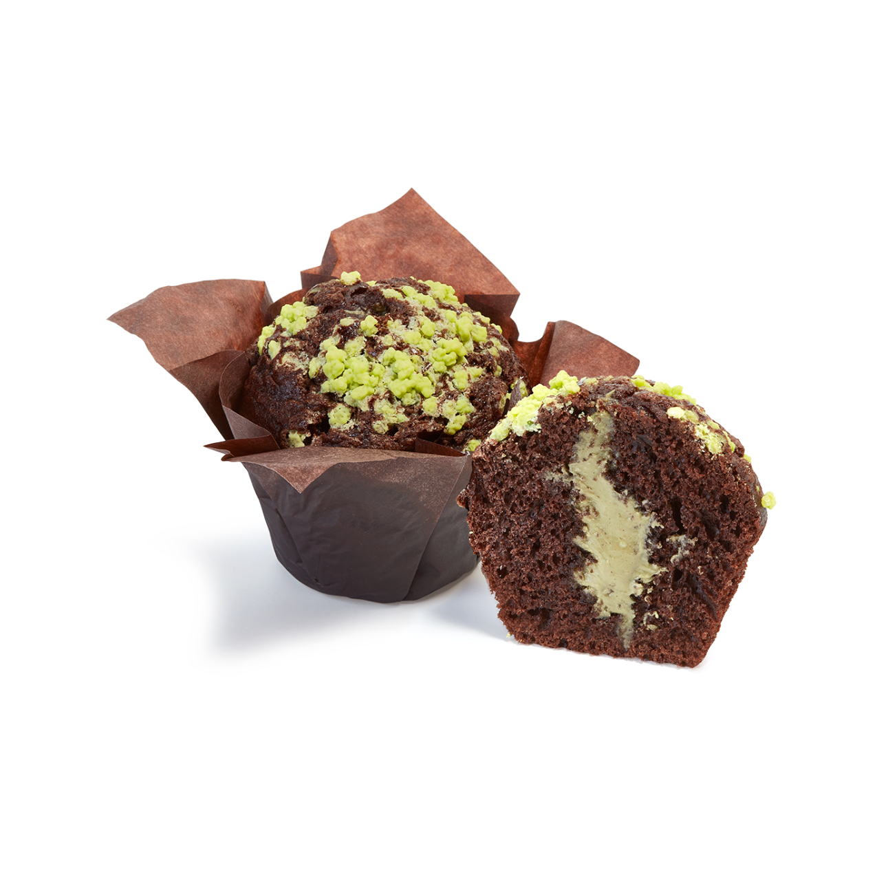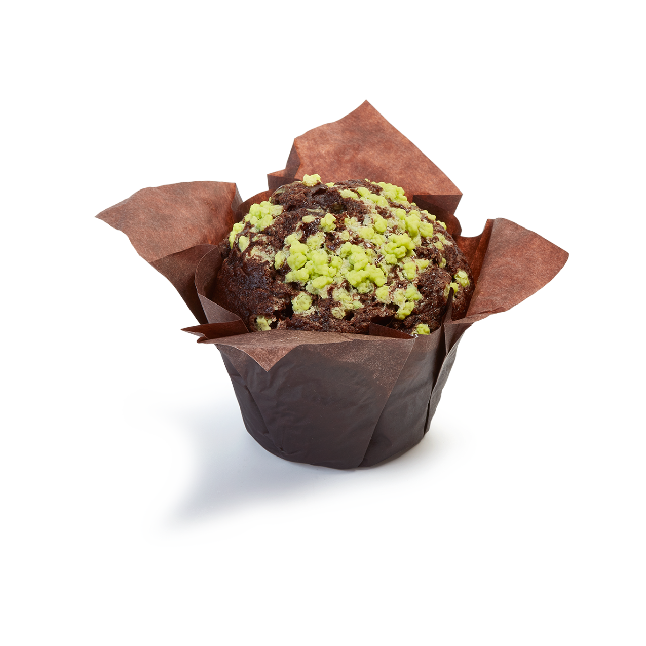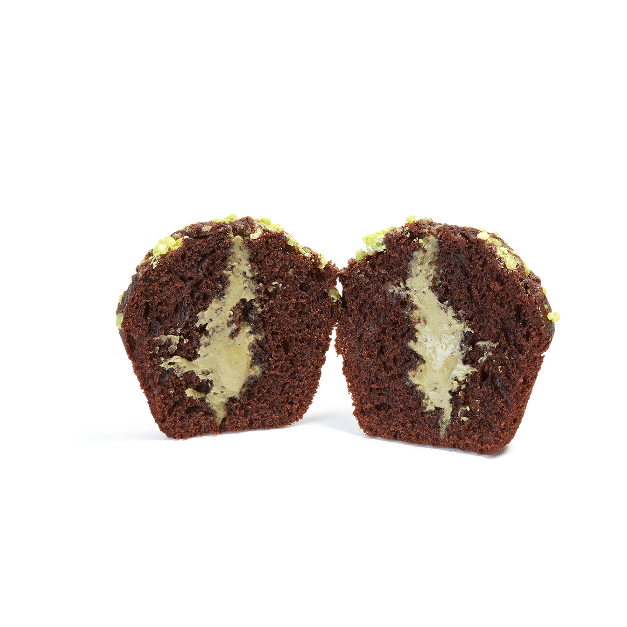 Muffin con masa con cacao, decorado con azúcar perlé de color verde intenso y con un relleno cremoso y crujiente con pistacho y pasta kadayif.