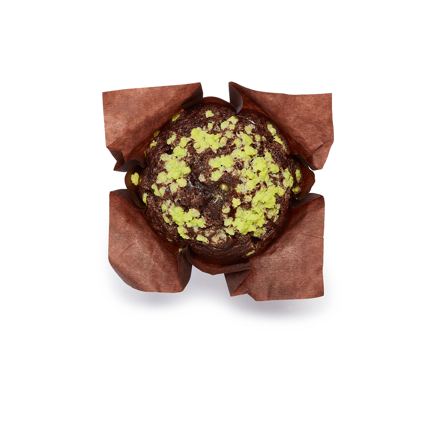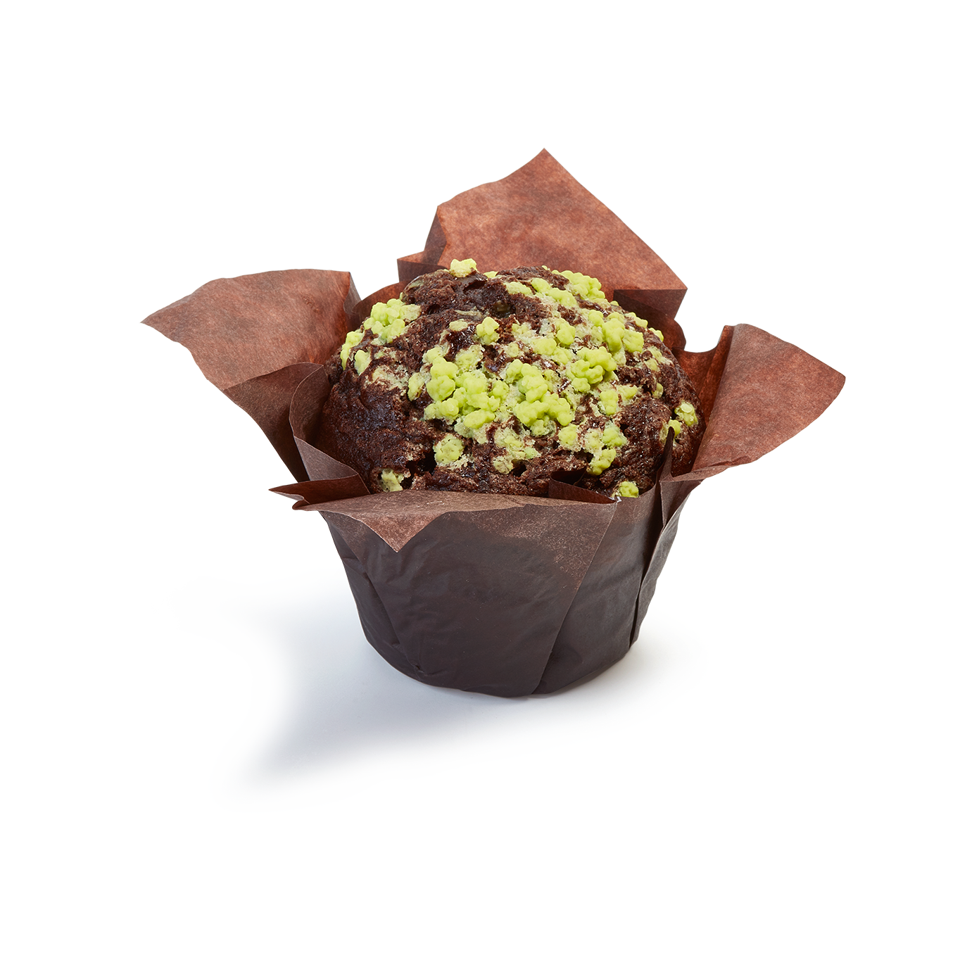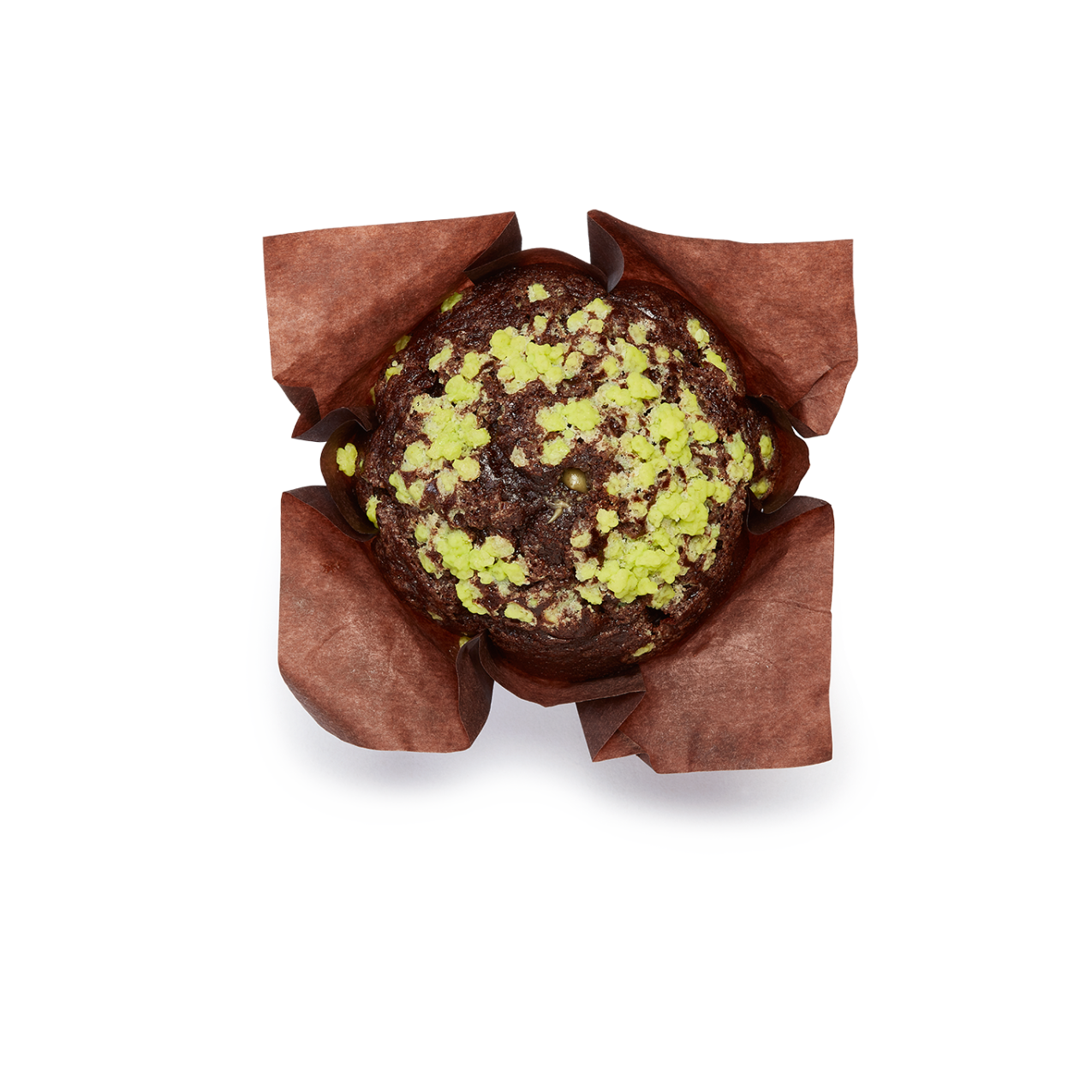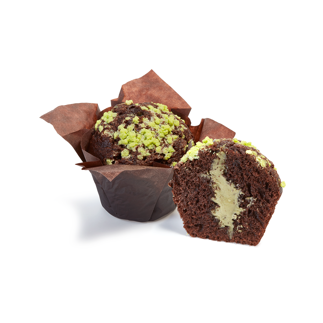 Muffin con masa con cacao, decorado con azúcar perlé de color verde intenso y con un relleno cremoso y crujiente con pistacho y pasta kadayif.