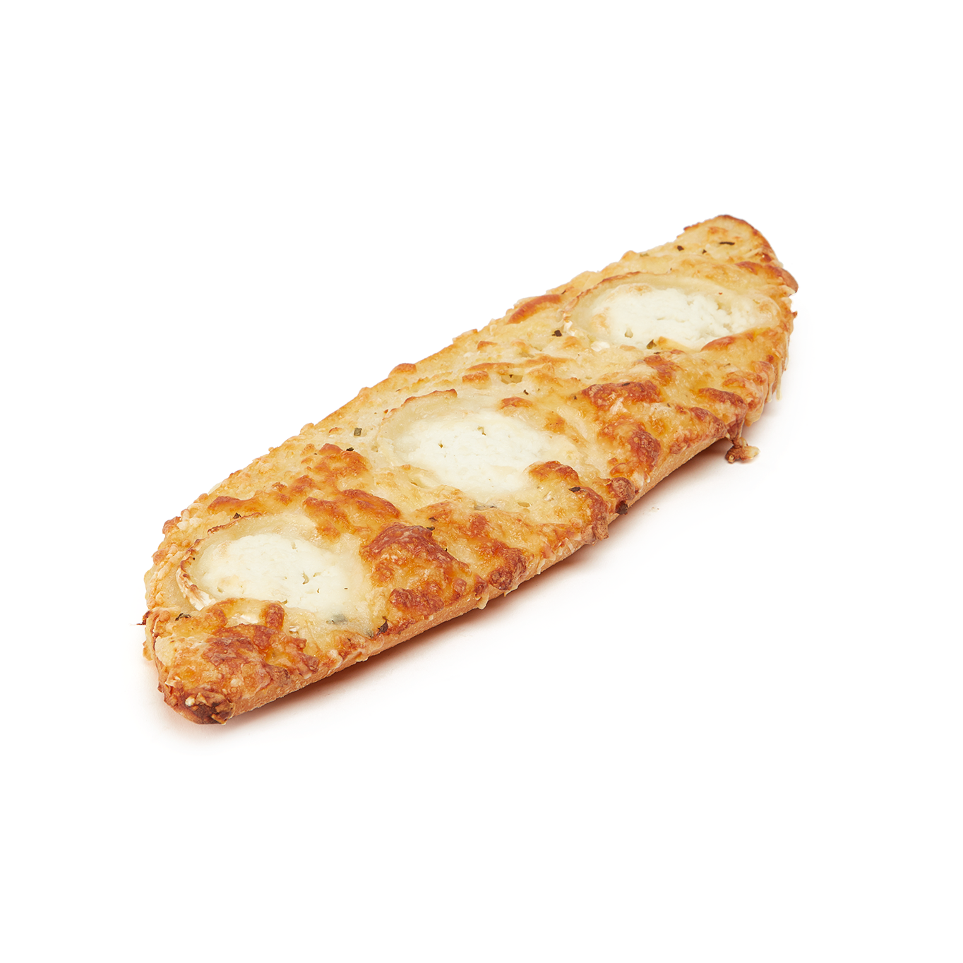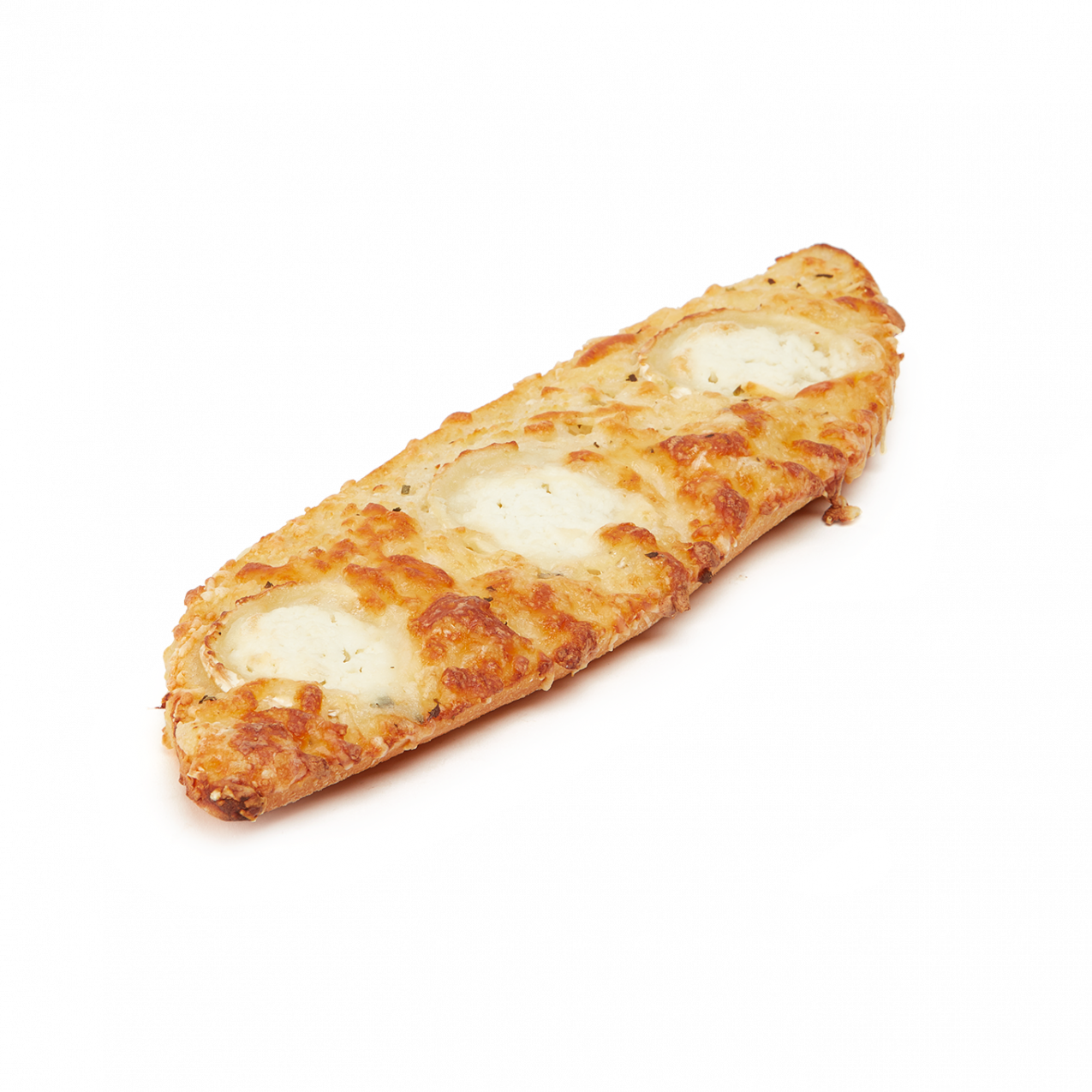 Para los amantes del queso. Base de crujiente pan recubierto por una combinación de cremosos quesos parmesano, emmental y mozzarella y con tres rodajas de queso de cabra madurado visibles sobre la pieza. La albahaca en hoja le da el último toque de sabor.