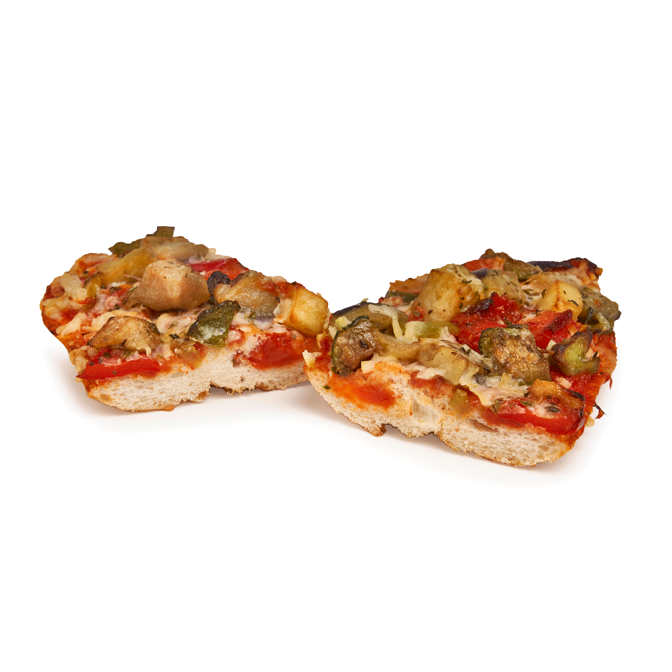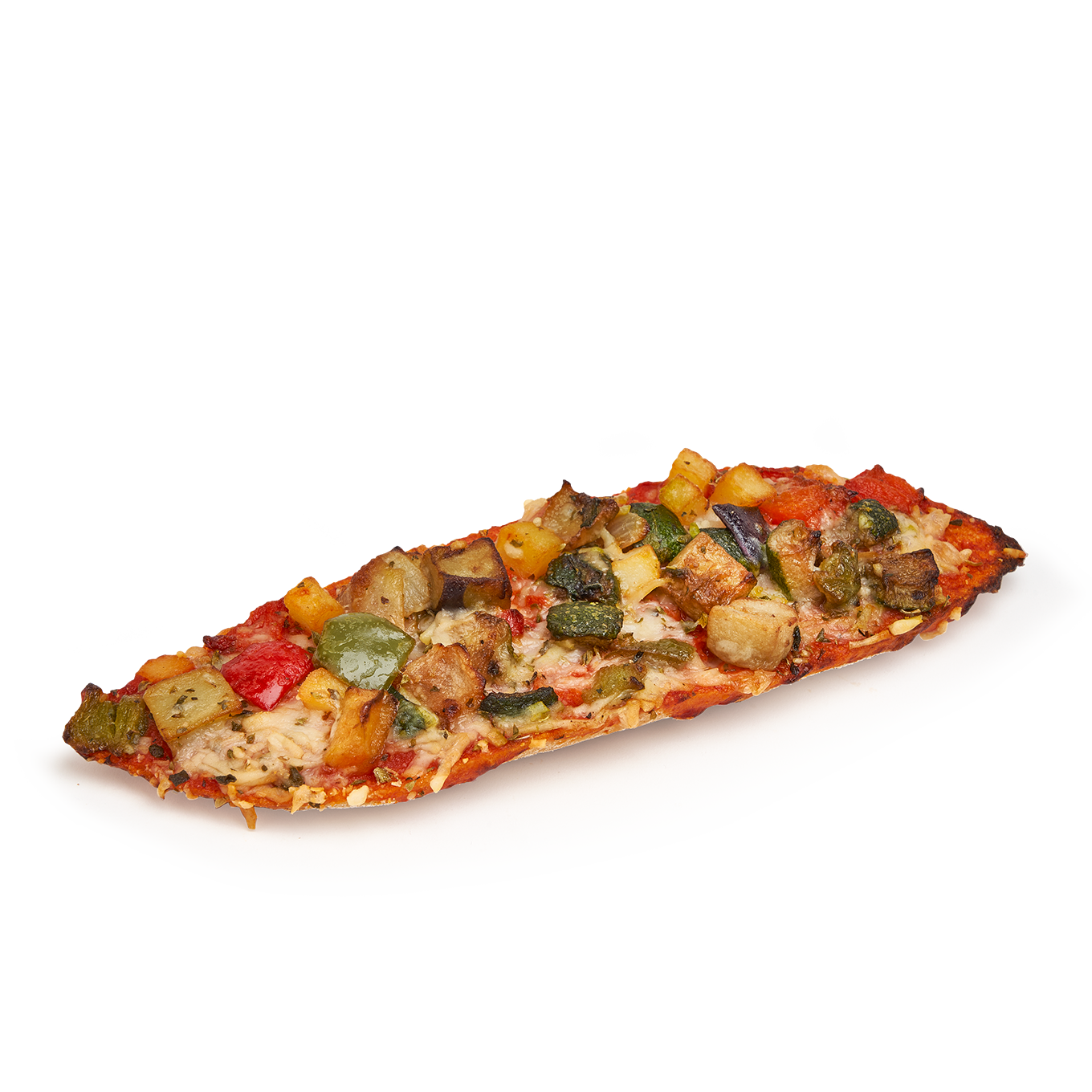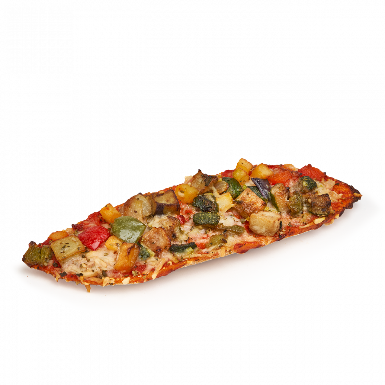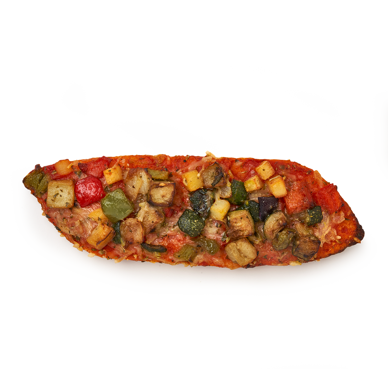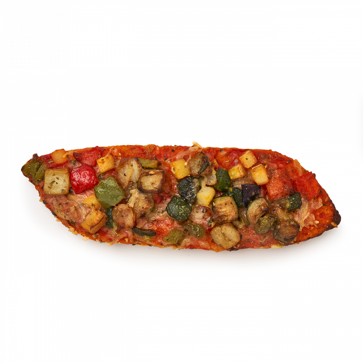 Sobre el pan se ha extendido una base de tomate frito. Verduras como el calabacín, berenjena, pimiento rojo y verde, cebolla y patata además del queso emmental. Añade un toque de orégano para darle un toque especial.
