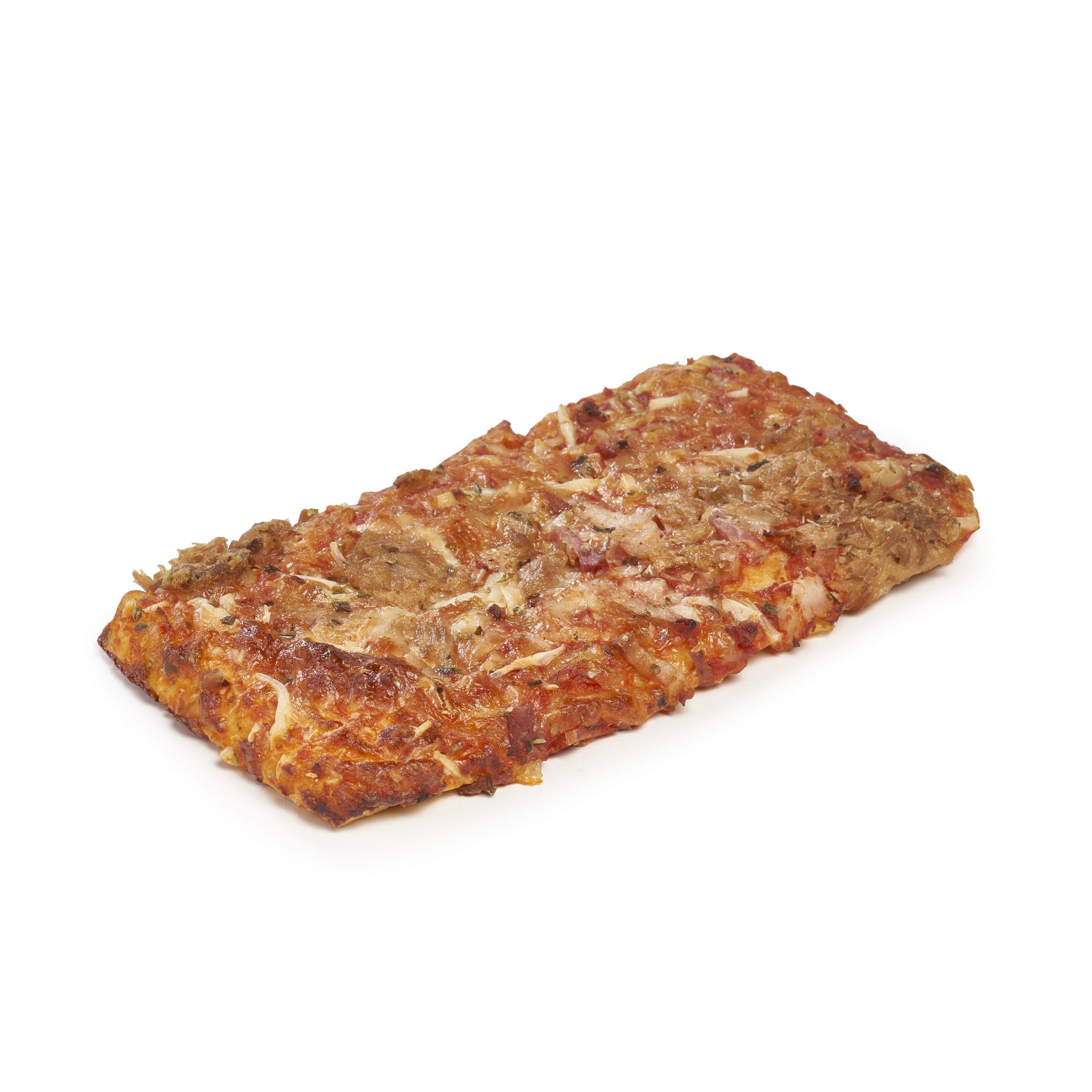 Base de tomate, beicon (10%), atún (8%) y queso mozzarella.