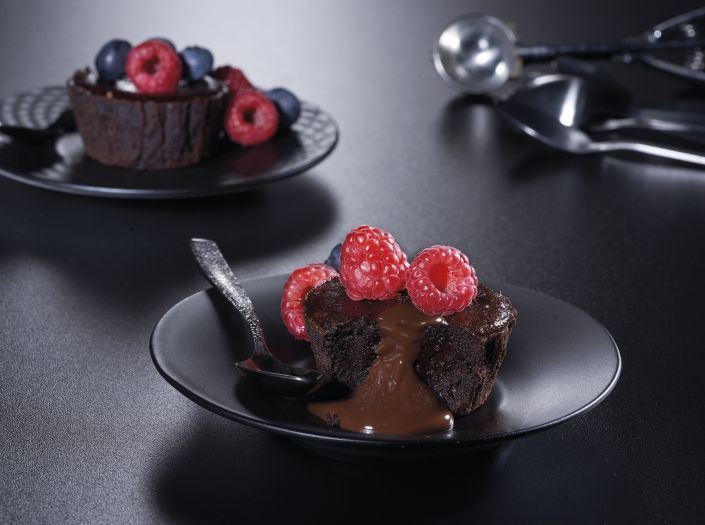 Delicioso postre de bizcocho de chocolate con corazón de chocolate fundente, de masa de textura húmeda y consistente con un potente