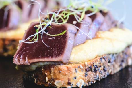 Tosta de Hogaza de Maíz y Cereales con Tataki de Atún Rojo y Hummus de Mango