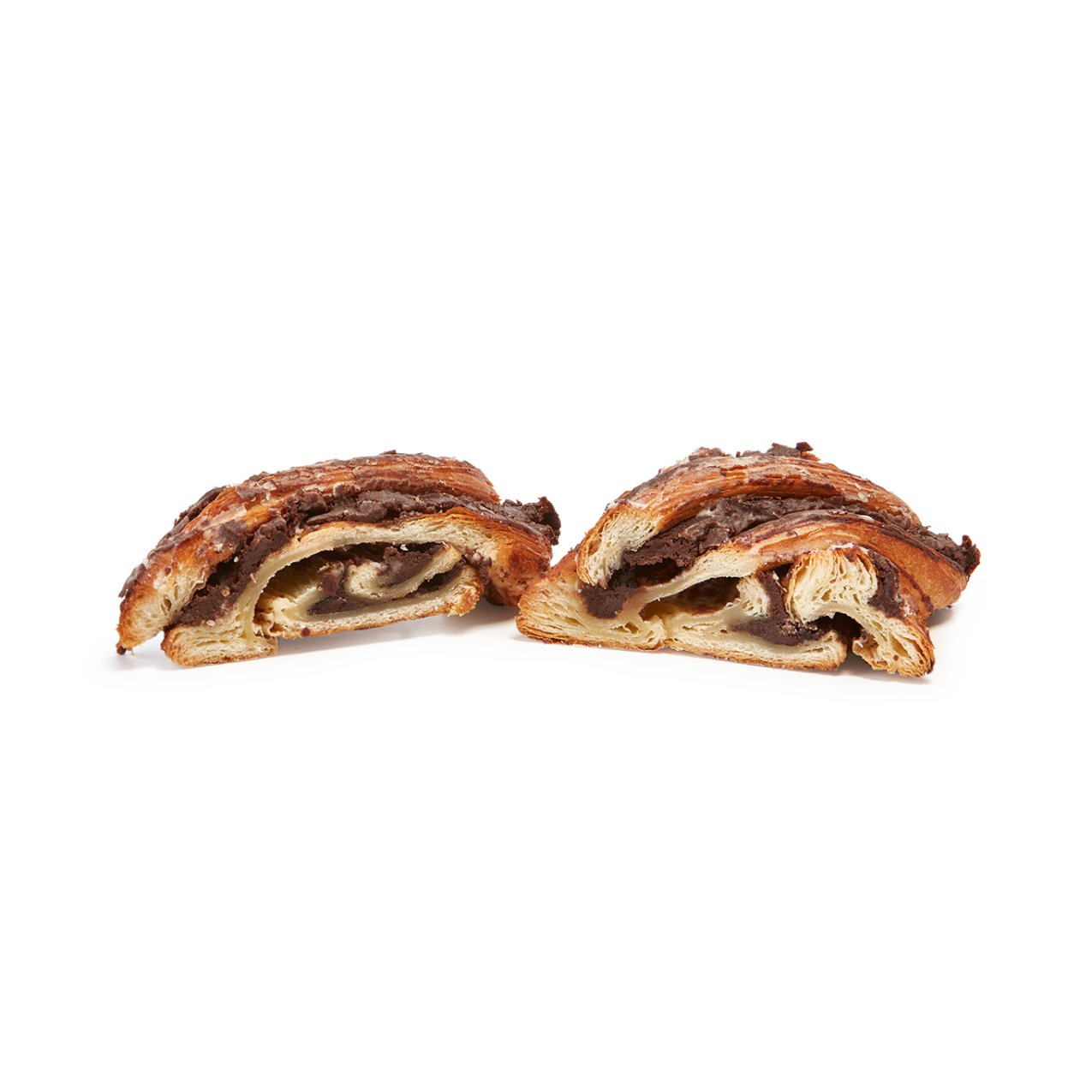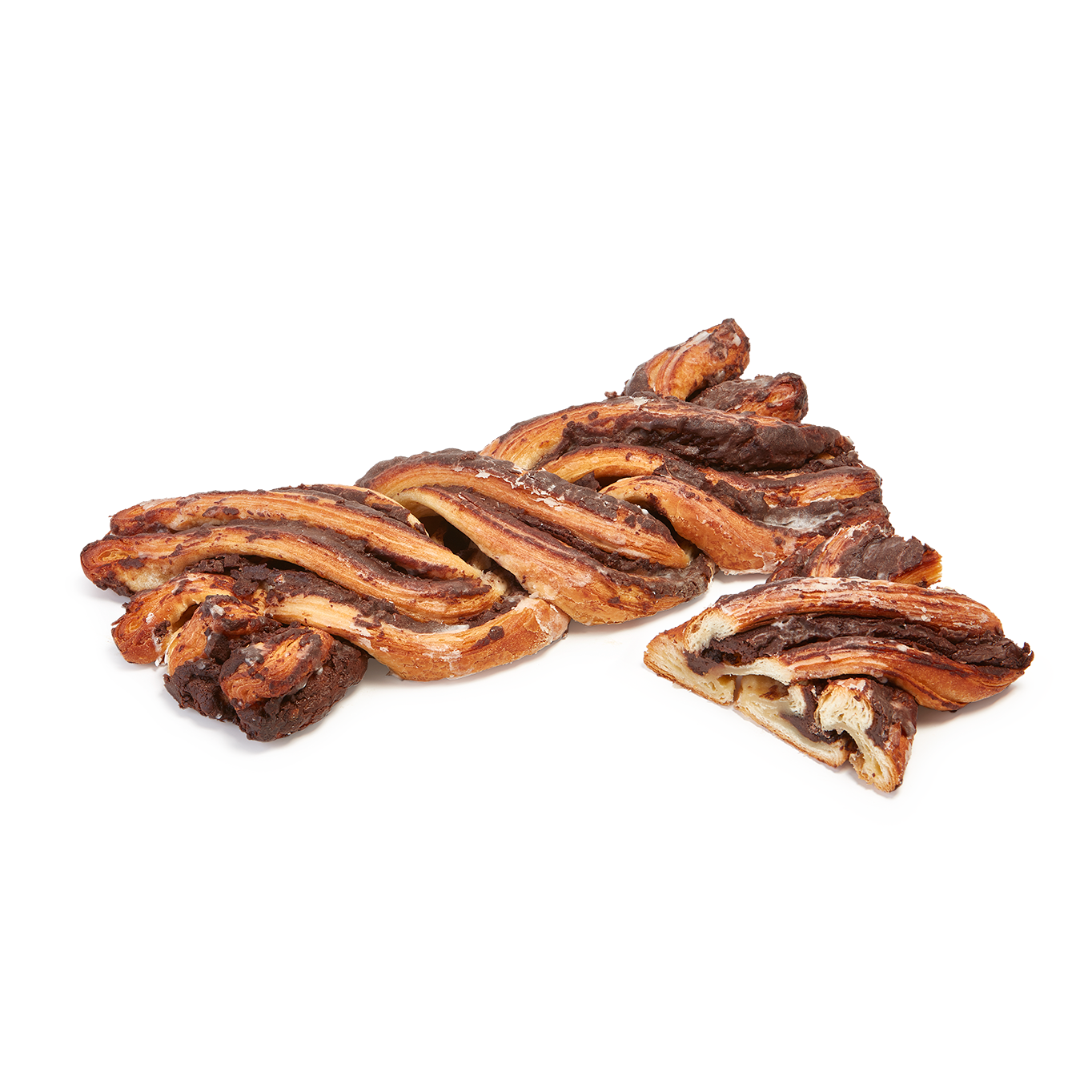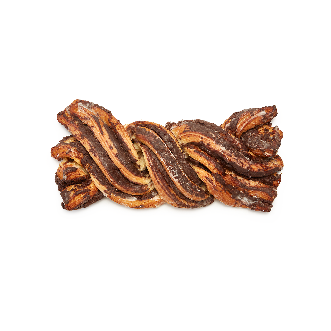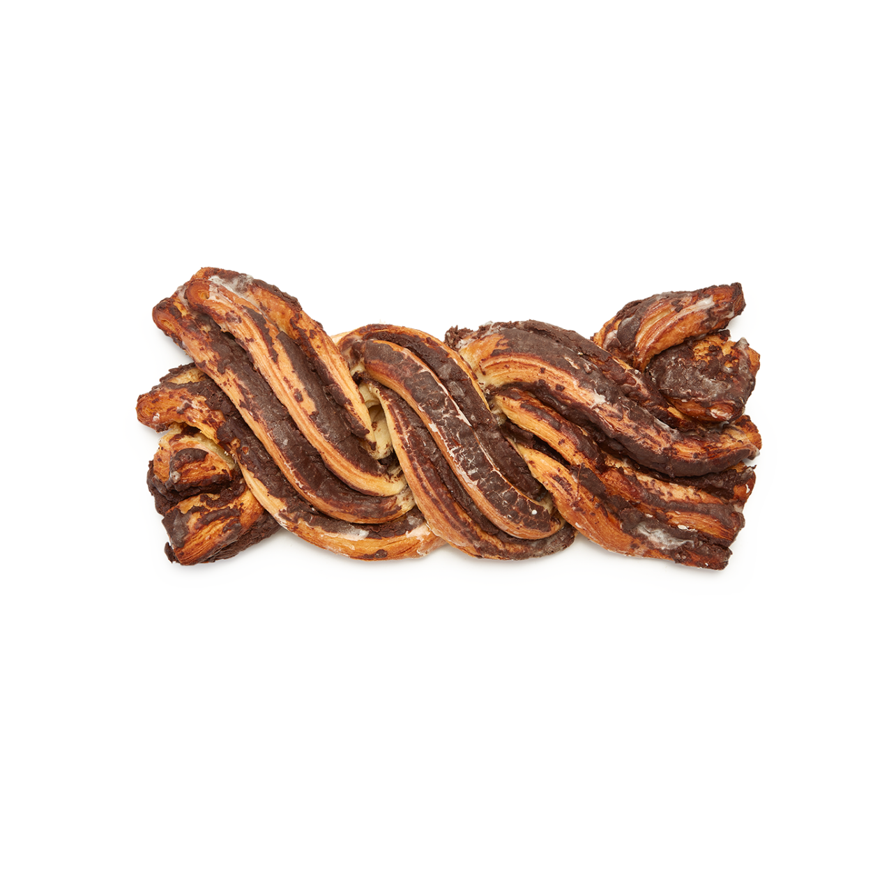 Hojaldre artesano de gran desarrollo, trenzado a mano y relleno con una crema de cacao y avellana de sabor intenso. Interior tierno y muy cremoso.
