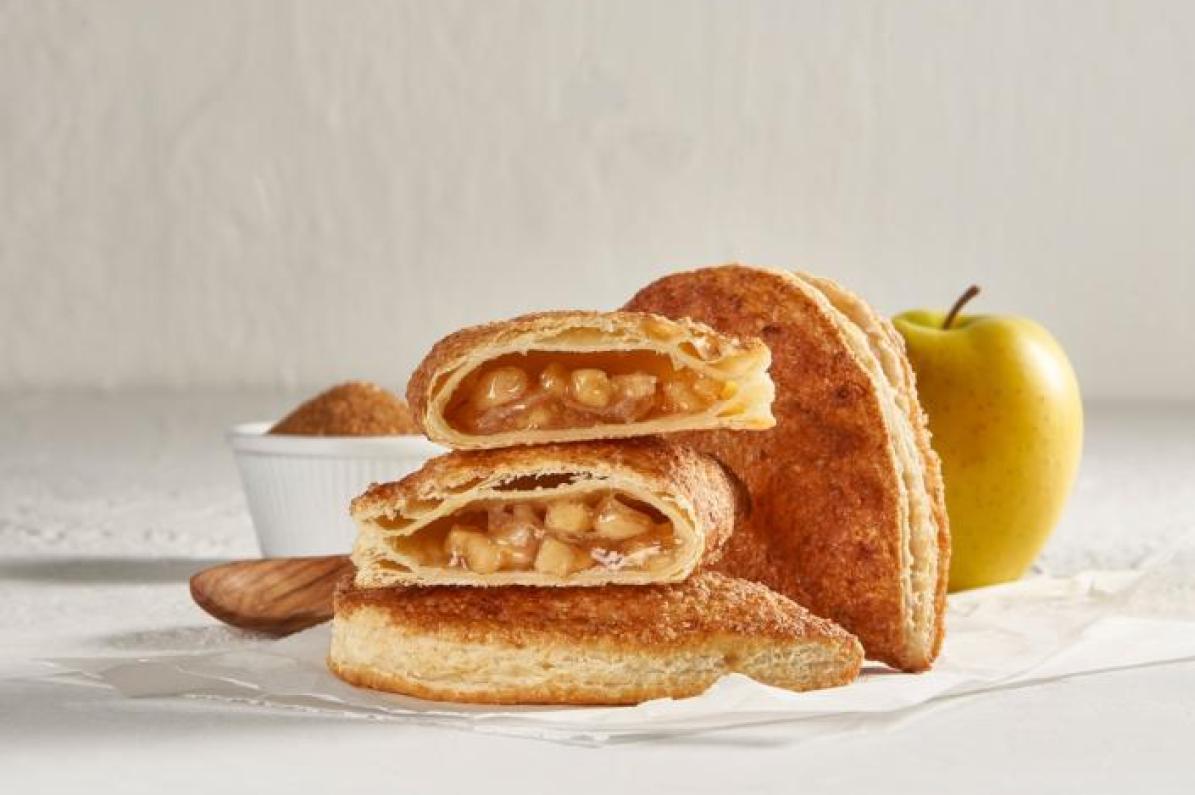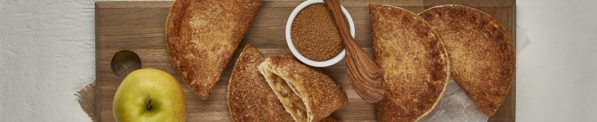 Un clásico entre los clásicos. Su hojaldre crujiente de margarina con relleno de manzana a trozos y toque de canela aporta calidez y sabor tradicional. Acabado con azúcar moreno de caña integral, ya viene decorado.